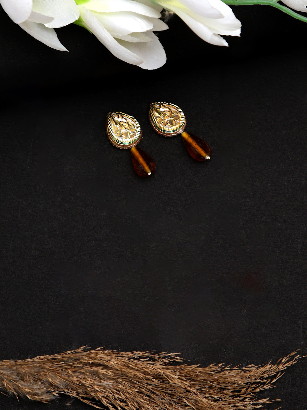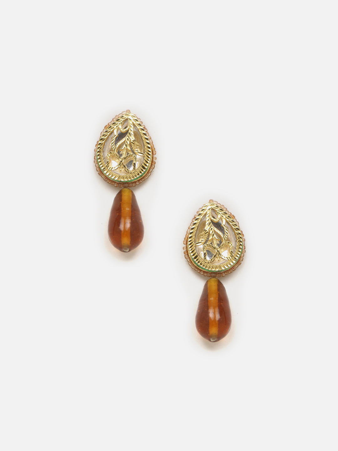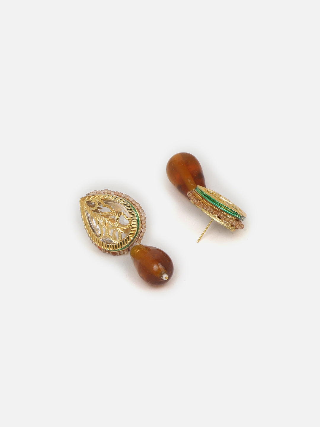 Big Dropplet Of Stone Earring With Trending Taupe Color And Muturd Touch; Category Of Jewellery Is Earring; Sub Category Is Drop; Ideal For Women; Color Is Brown, Gold, Green, White; Gemstones Used - Kundan, Pearls, Faux Emerald; Plating Is Gold-Plated; Base Metal Is Alloy; Other Material Used - Closure Stopper; Size Is Freesize; Adjustable - No; Weight Is 28 Gms; Mesaurements - Length Of Earring= 6 Cm; Width Of Earring =3 Cm; Adjustable - No; Content 1 Pair Earring