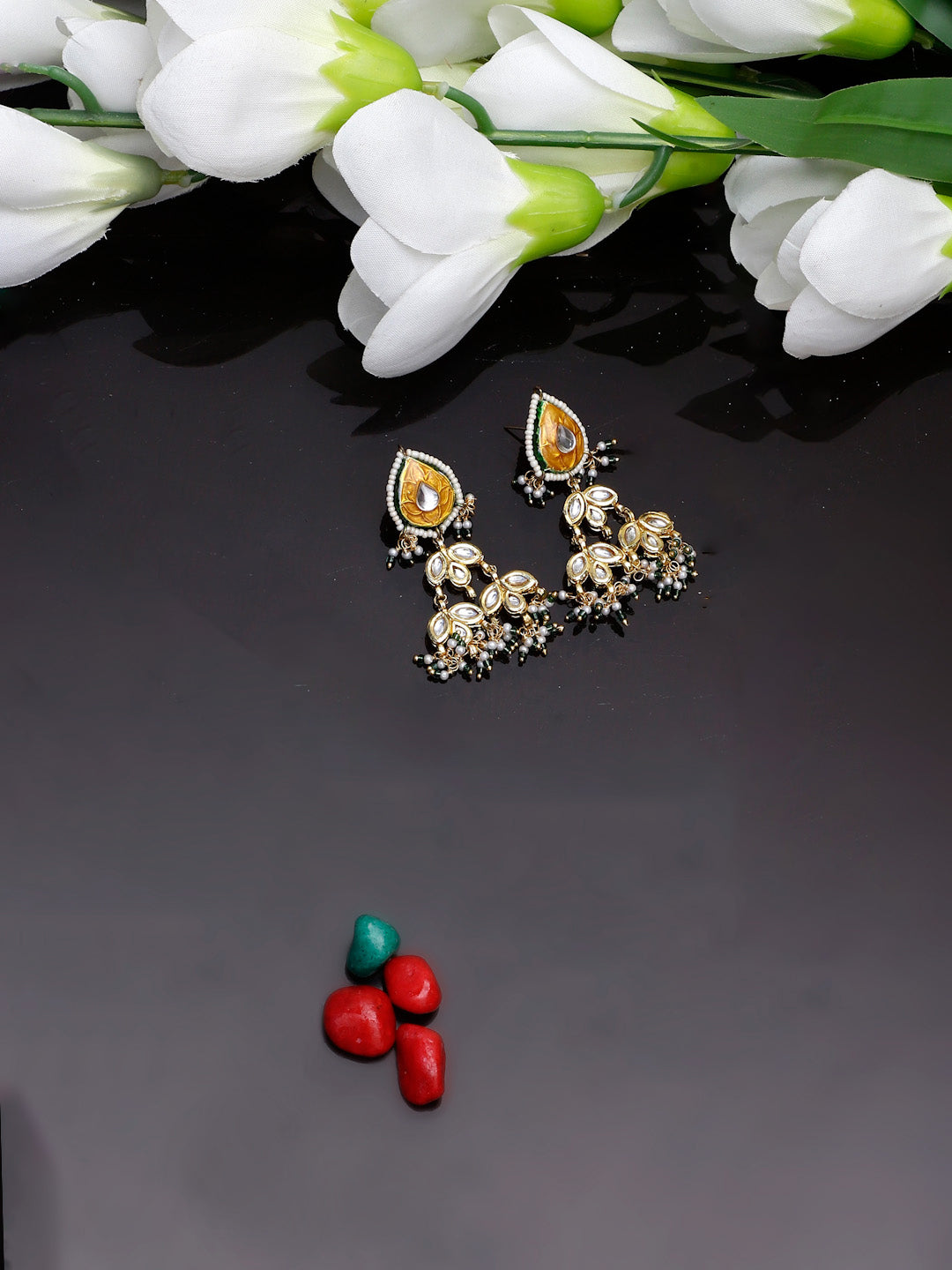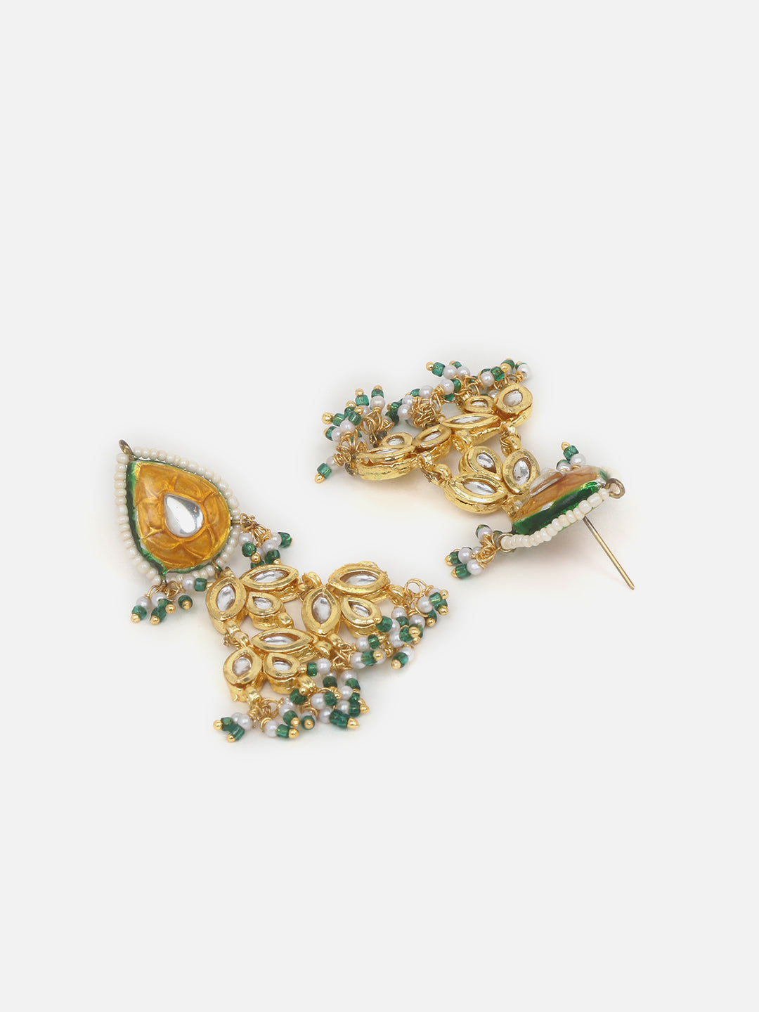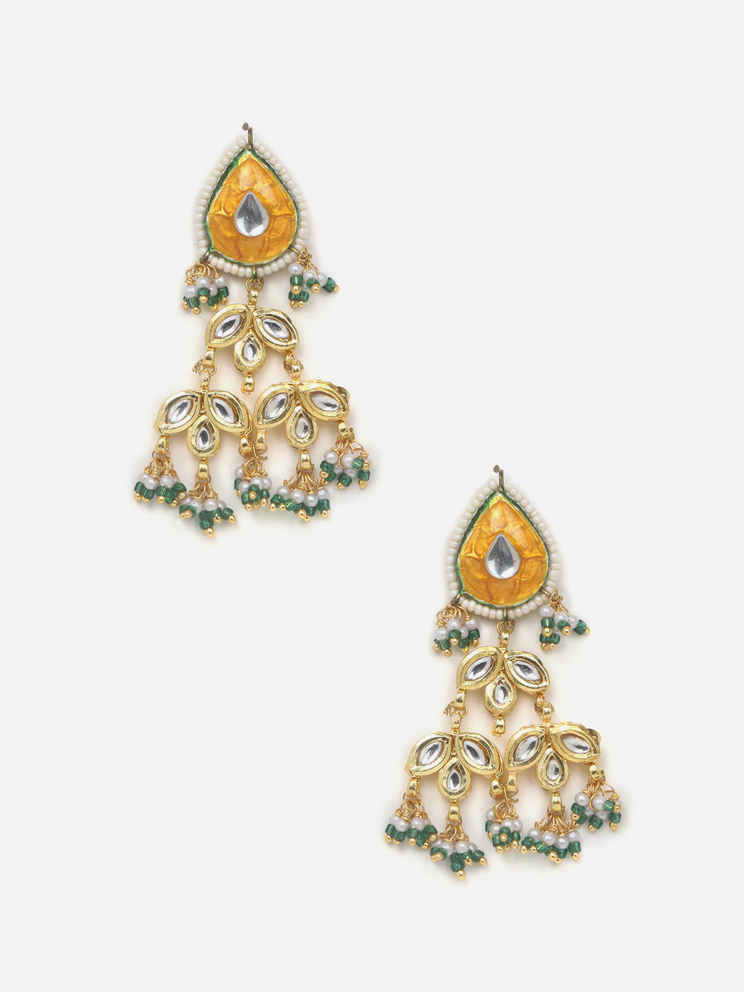 Mango Yellow Meenakari Kundan Amalgamated Earring; Category Of Jewellery Is Earring; Sub Category Is Drop; Ideal For Women; Color Is Orange, Green, Gold, White; Gemstones Used - Kundan, Pearls, Natural Stones; Plating Is Gold-Plated; Base Metal Is Alloy; Other Material Used - Closure Stopper; Size Is Freesize; Adjustable - No; Weight Is 23 Gms; Mesaurements - Length Of Earring= 7 Cm; Width Of Earring =3.4 Cm; Adjustable - No; Content 1 Pair Earring