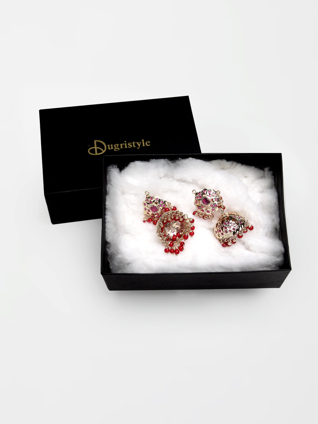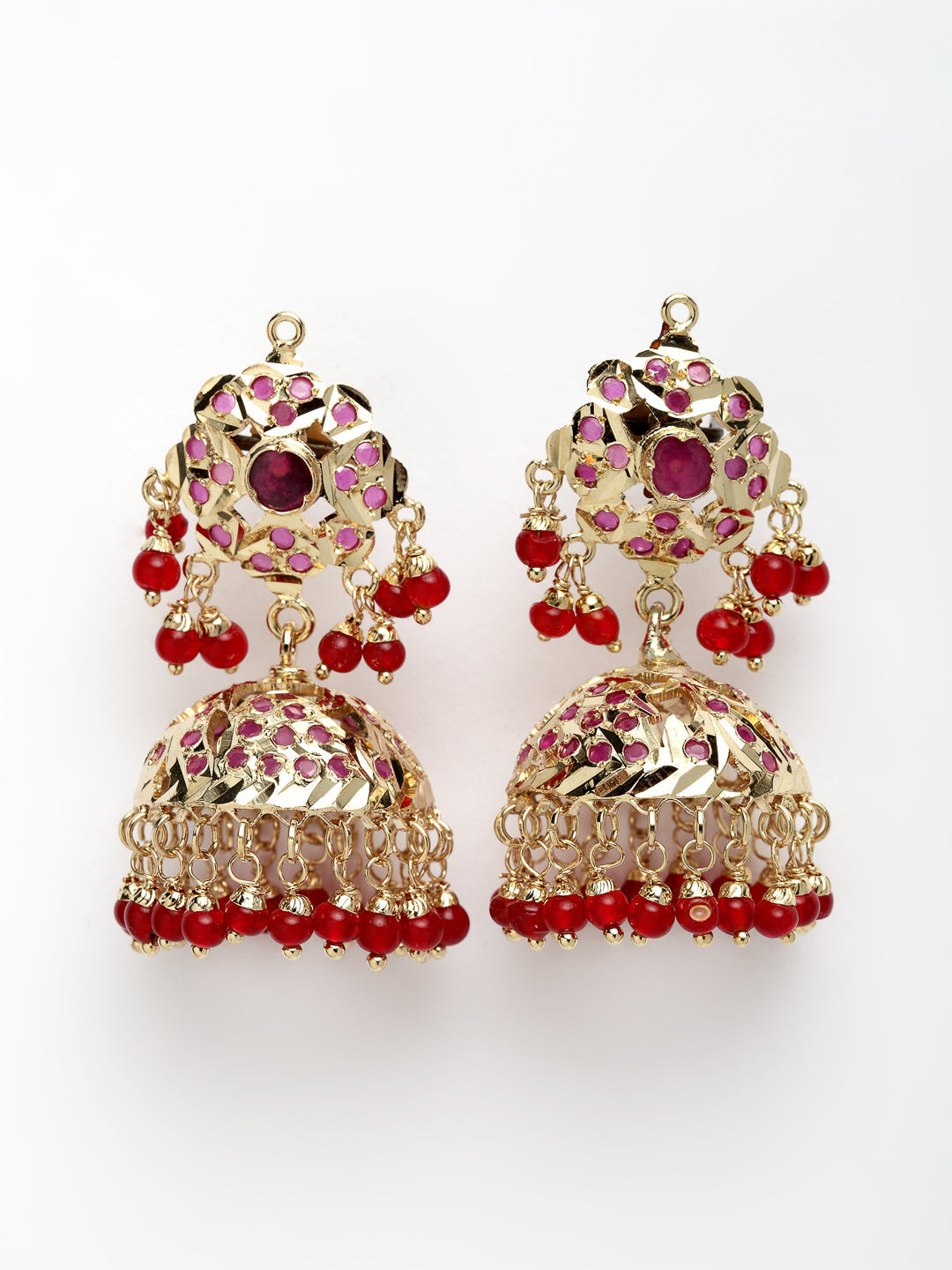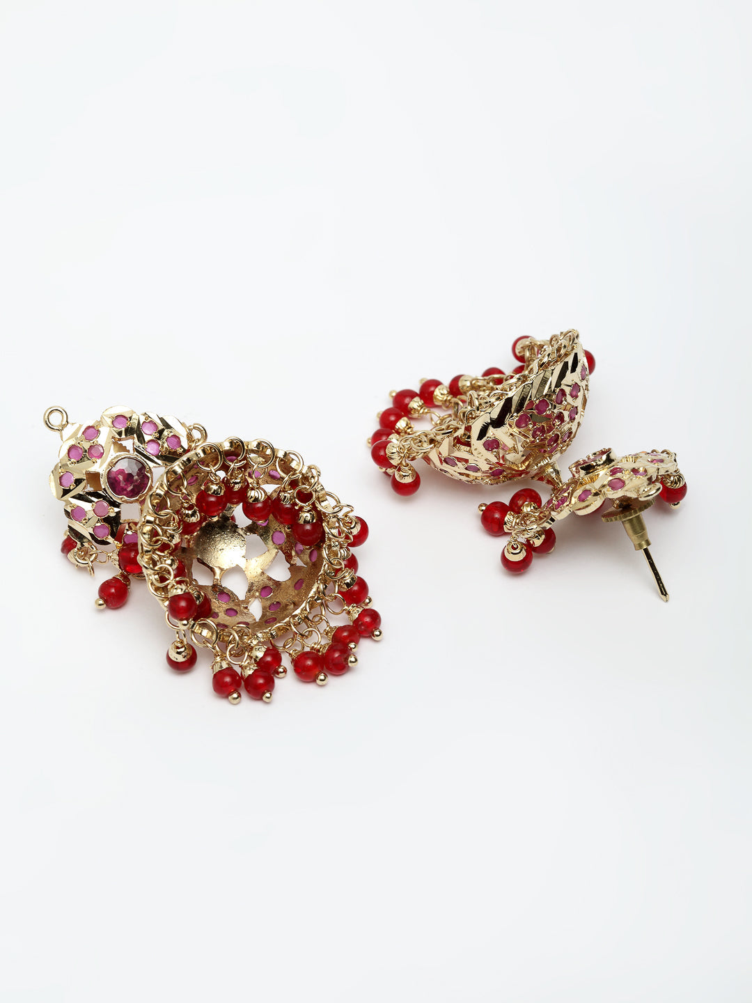 Red & Jhumki Earring With Faux Ruby &; Category Of Jewellery Is Earring; Sub Category Is Jhumka; Ideal For Women; Base Color Is Red; Gemstones Used - Faux Ruby; Plating Is Gold-Plated; Base Metal Is Alloy; Other Material Used - ; Size Is Freesize; Adjustable - No; Weight Is 38 Gms; Mesaurements - Length Of Earring= 5 Cm; Width Of Earring =3 Cm; Content