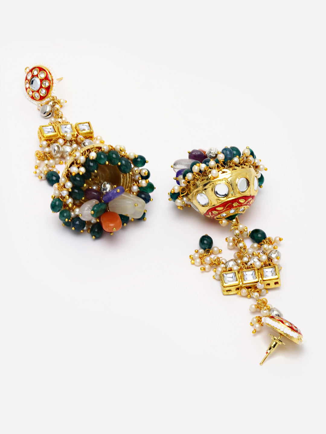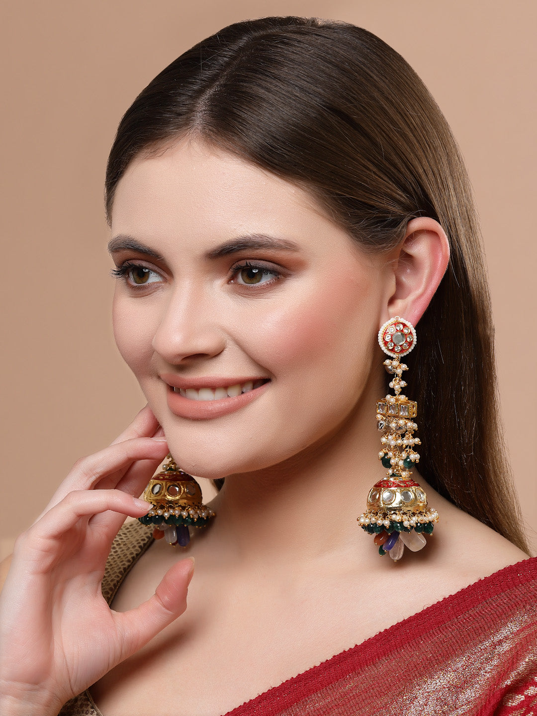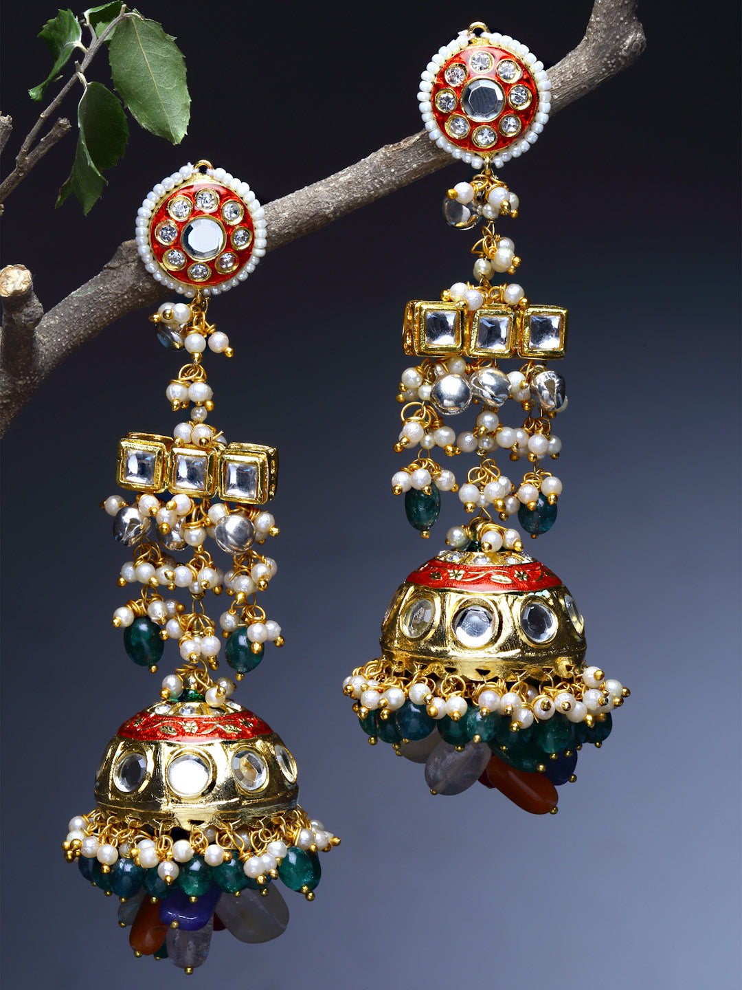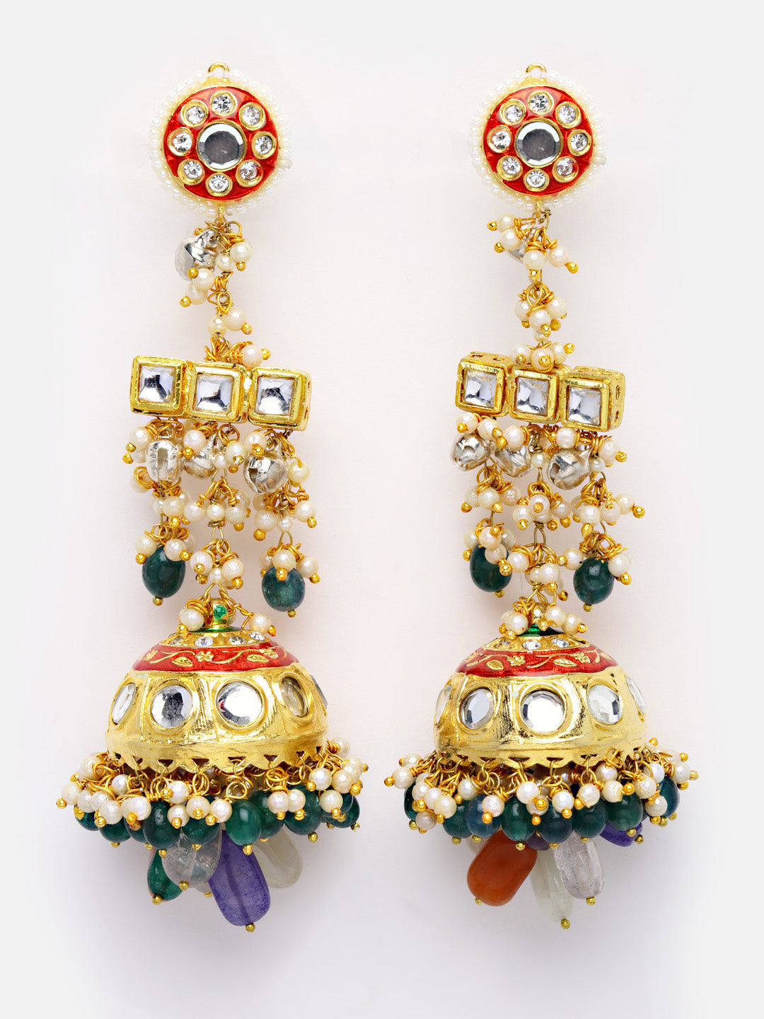 Anushka Inspired Jewel Pc Her Inspired And Love For Jhumki Made Us Create This Pc Of Art For You.. Meenakari Jhumki With Kundan Highlights And Multicolor Stone Is What Makes This Jewellery Unique And Classy.; Category Of Jewellery Is Earring; Sub Category Is Jhumka; Ideal For Women; Color Is Red, Green, Cream, Gold, White; Gemstones Used - Kundan, American Diamonds, Pearls, Natural Stones; Plating Is Gold-Plated; Base Metal Is Alloy; Other Material Used - Closure Stopper And Kanchain; Size Is Freesize; Adjustable - No; Weight Is 89 Gms; Mesaurements - Length Of Earring= 12 Cm; Width Of Earring =5 Cm; Adjustable - No; Content 1 Pair Earring