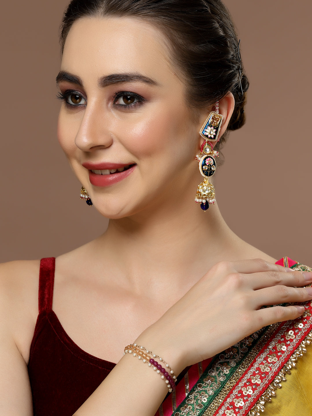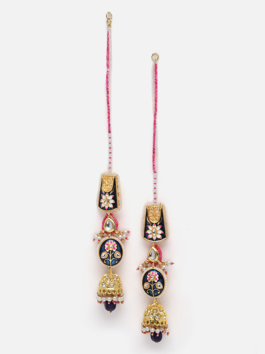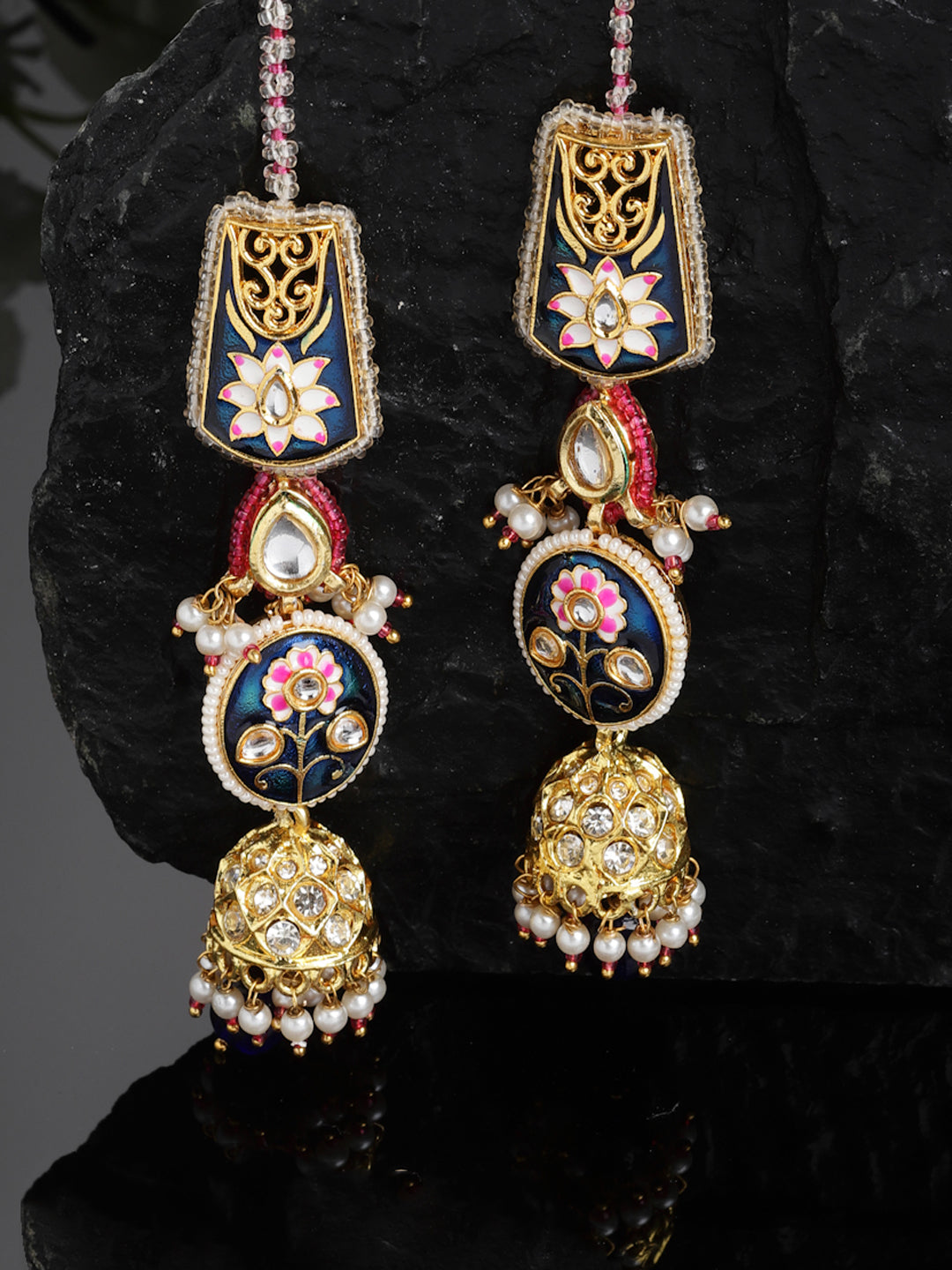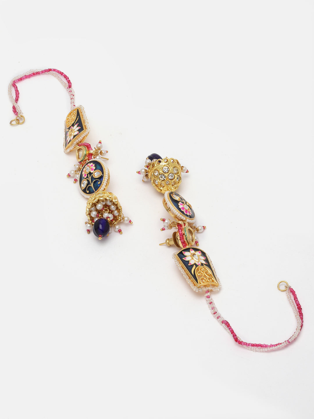 Blue Meena And Pink Touch Earring Is What Makes This Unique; Category Of Jewellery Is Earring; Sub Category Is Jhumka; Ideal For Women; Color Is Blue, Pink, Gold, White; Gemstones Used - Kundan, American Diamonds, Pearls, Natural Stones; Plating Is Gold-Plated; Base Metal Is Alloy; Other Material Used - Closure Stopper; Size Is Freesize; Adjustable - No; Weight Is 38 Gms; Mesaurements - Length Of Earring= 10 Cm; Width Of Earring =2.8 Cm; Length Of Kanchain =10 Cm; Width Of Kanchain = 1 Cm; Adjustable - No; Content 1 Pair Earring With Kanchain