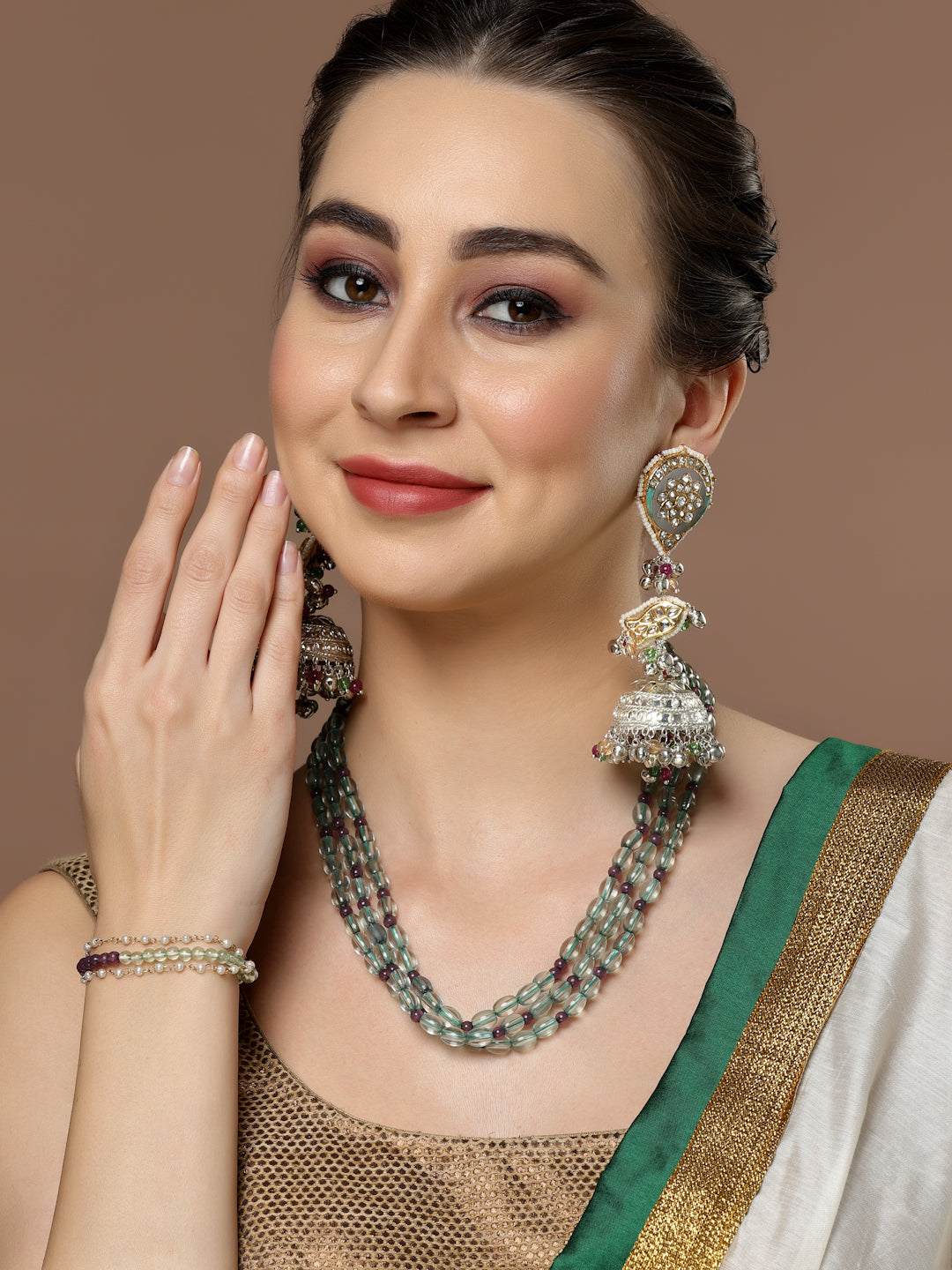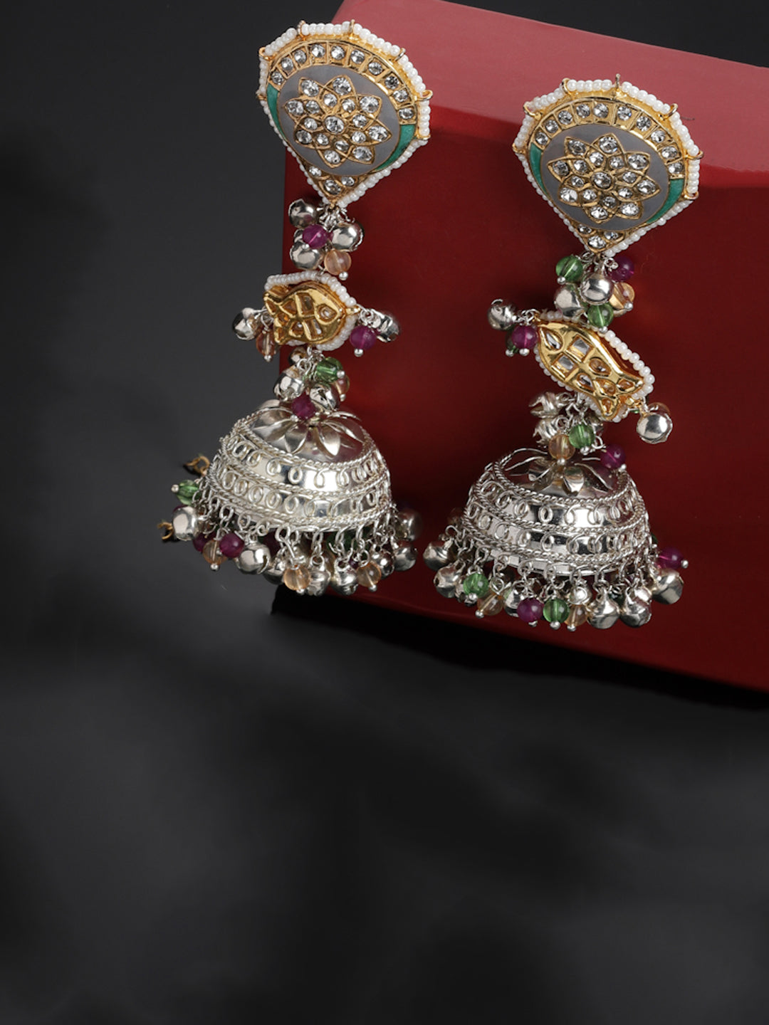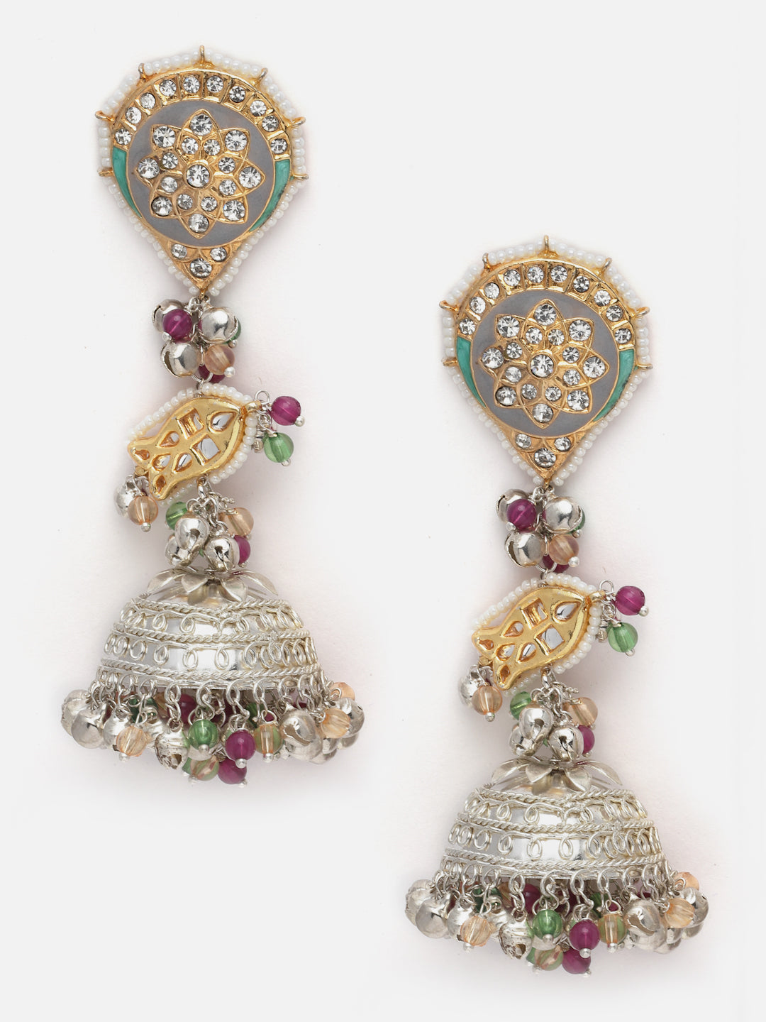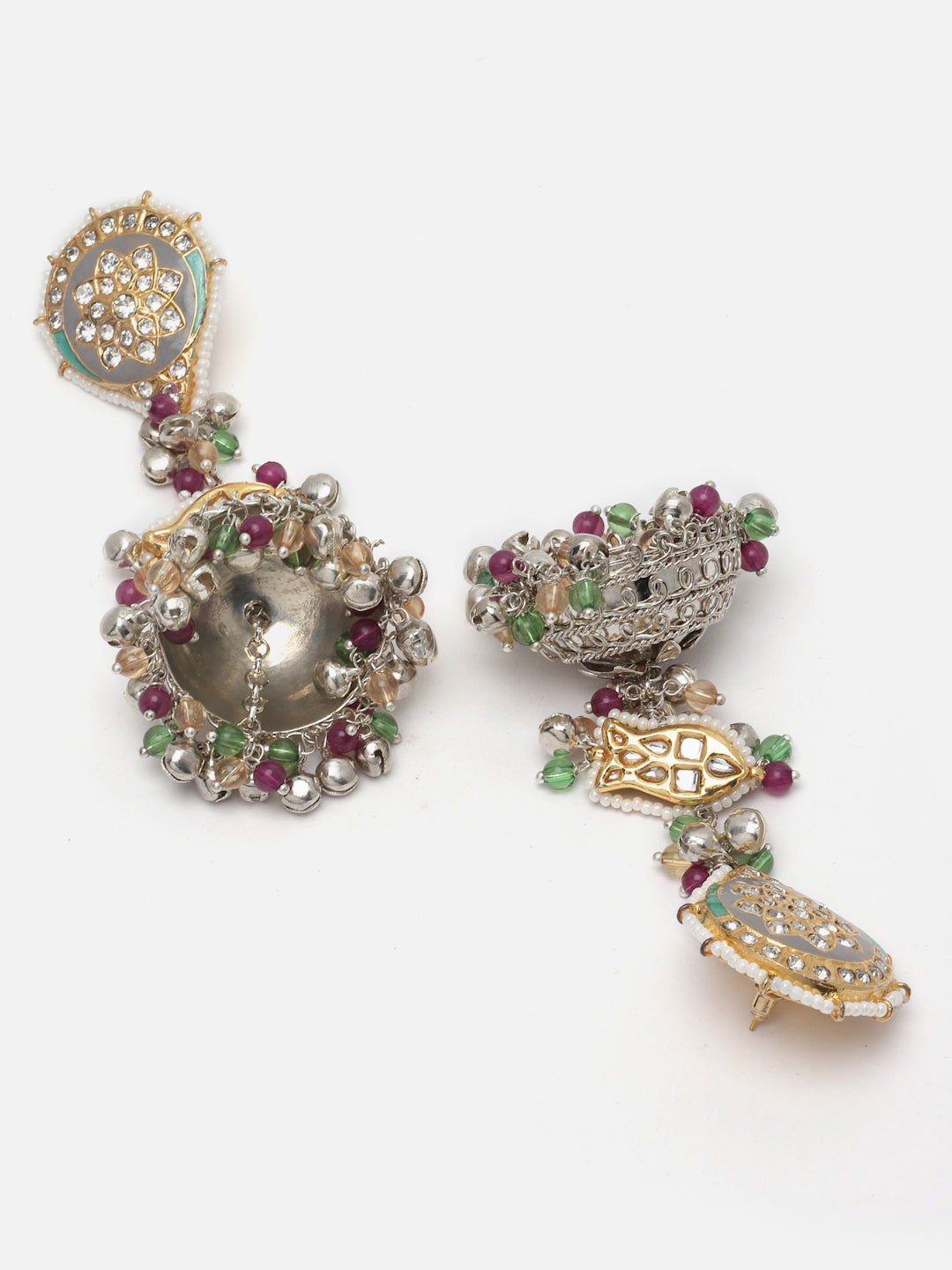 White Jhumki In Boho Earring With Tinch Of Meenakari Grey And Gold Kundan Earring; Category Of Jewellery Is Earring; Sub Category Is Jhumka; Ideal For Women; Color Is Green, Purple, Gold, White; Gemstones Used - Kundan, American Diamonds, Pearls, Natural Stones; Plating Is Silver-Plated; Base Metal Is Alloy; Other Material Used - Closure Stopper; Size Is Freesize; Adjustable - No; Weight Is 75 Gms; Mesaurements - Length Of Earring= 11 Cm; Width Of Earring =5 Cm; Adjustable - No; Content 1 Pair Earring
