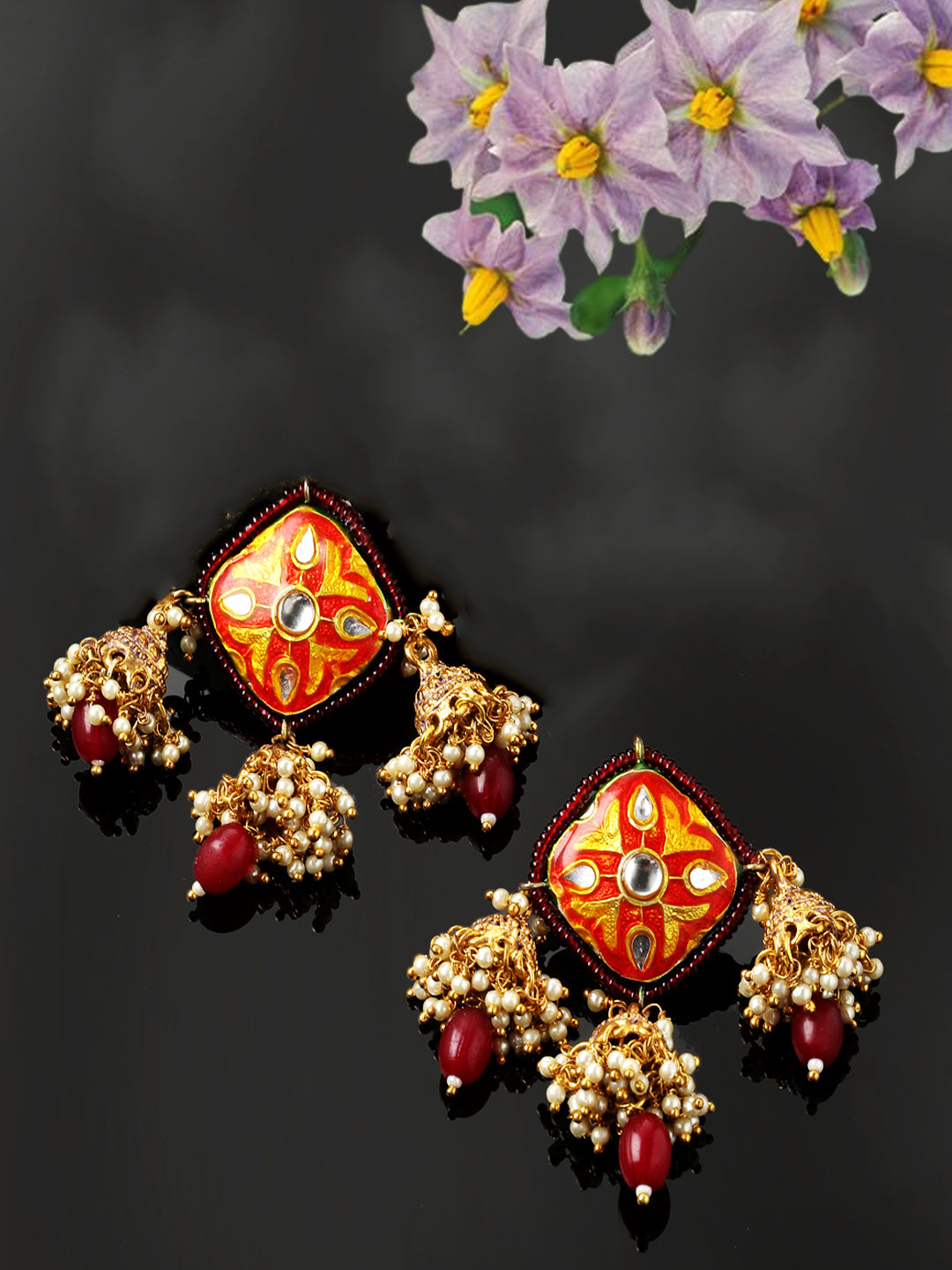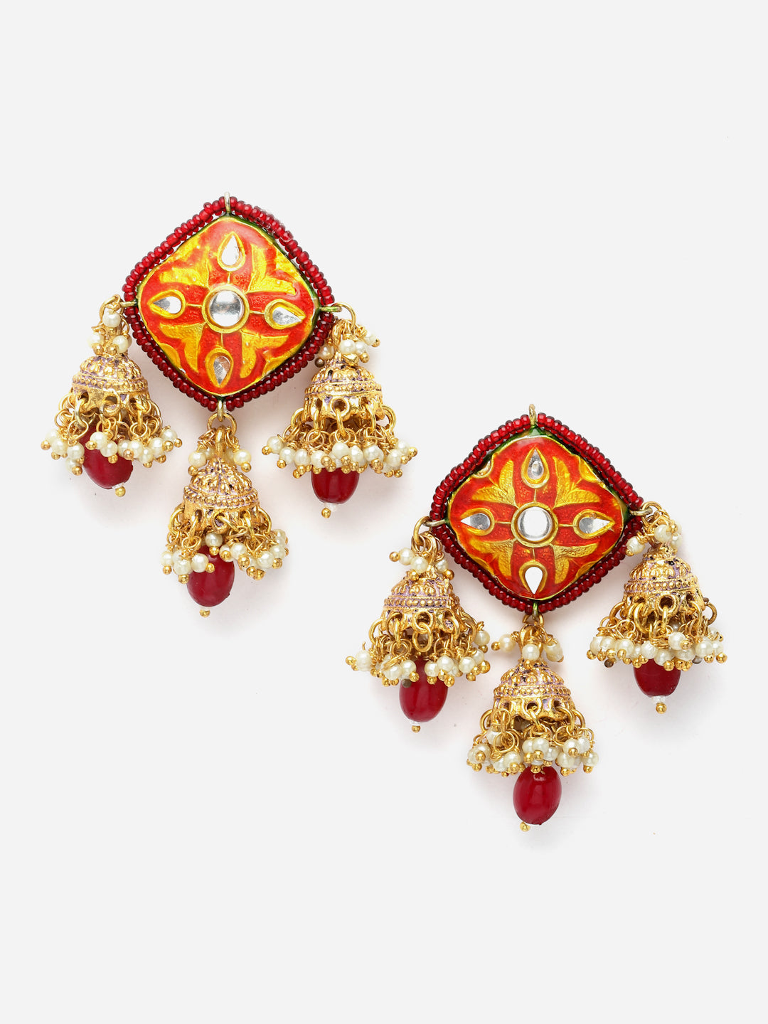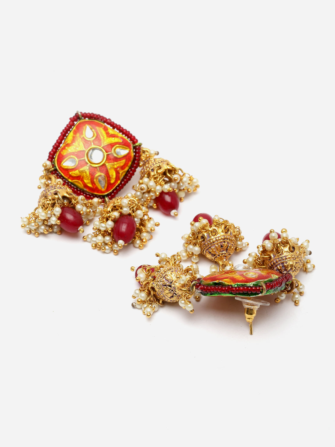 Red Meenakari And Jhumki Earring; Category Of Jewellery Is Earring; Sub Category Is Jhumka; Ideal For Women; Color Is Red, Pink, Gold, White, Cream; Gemstones Used - Kundan, Pearls, Natural Stones; Plating Is Gold-Plated; Base Metal Is Alloy; Other Material Used - Closure Stopper; Size Is Freesize; Adjustable - No; Weight Is 20 Gms; Mesaurements - Length Of Earring= 5 Cm; Width Of Earring =4 Cm; Adjustable - No; Content 1 Pair Earring