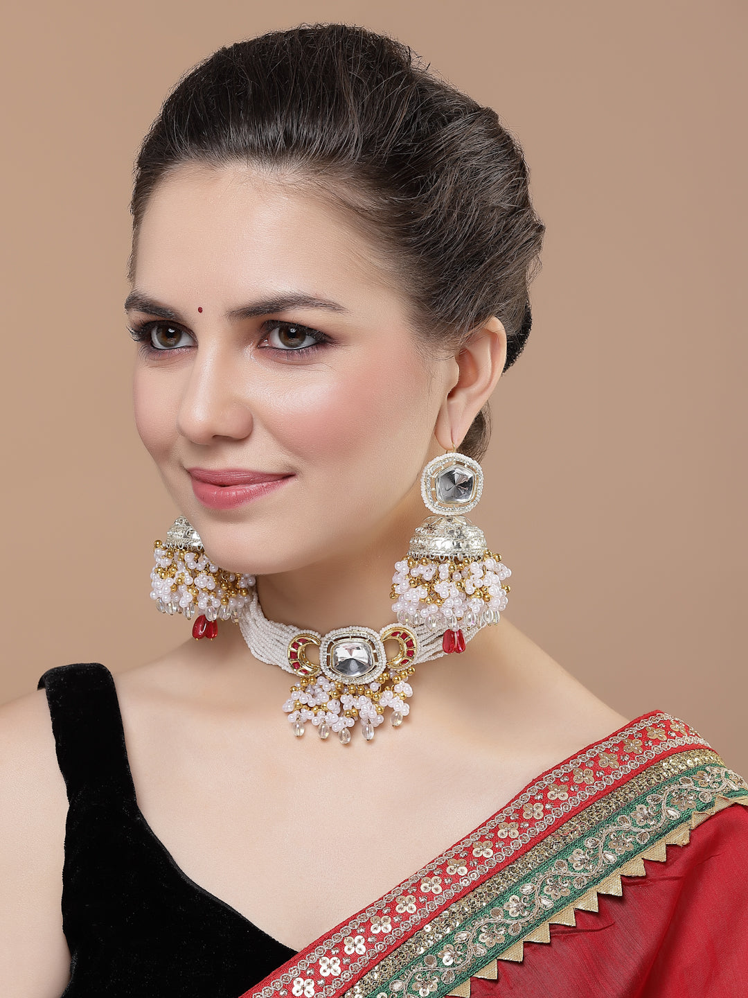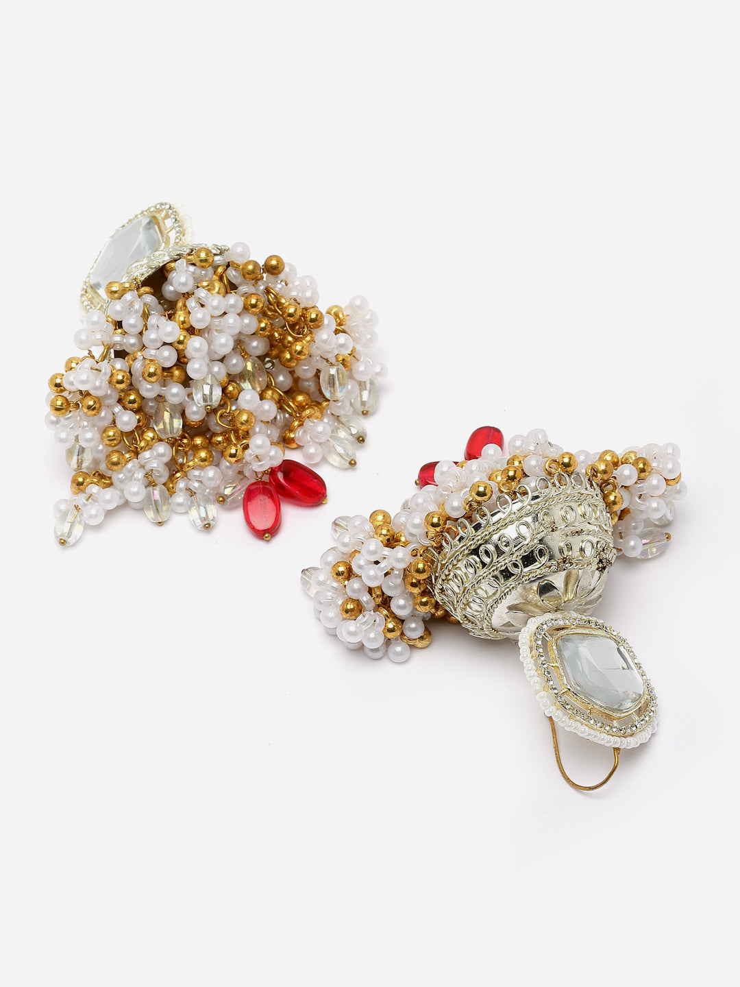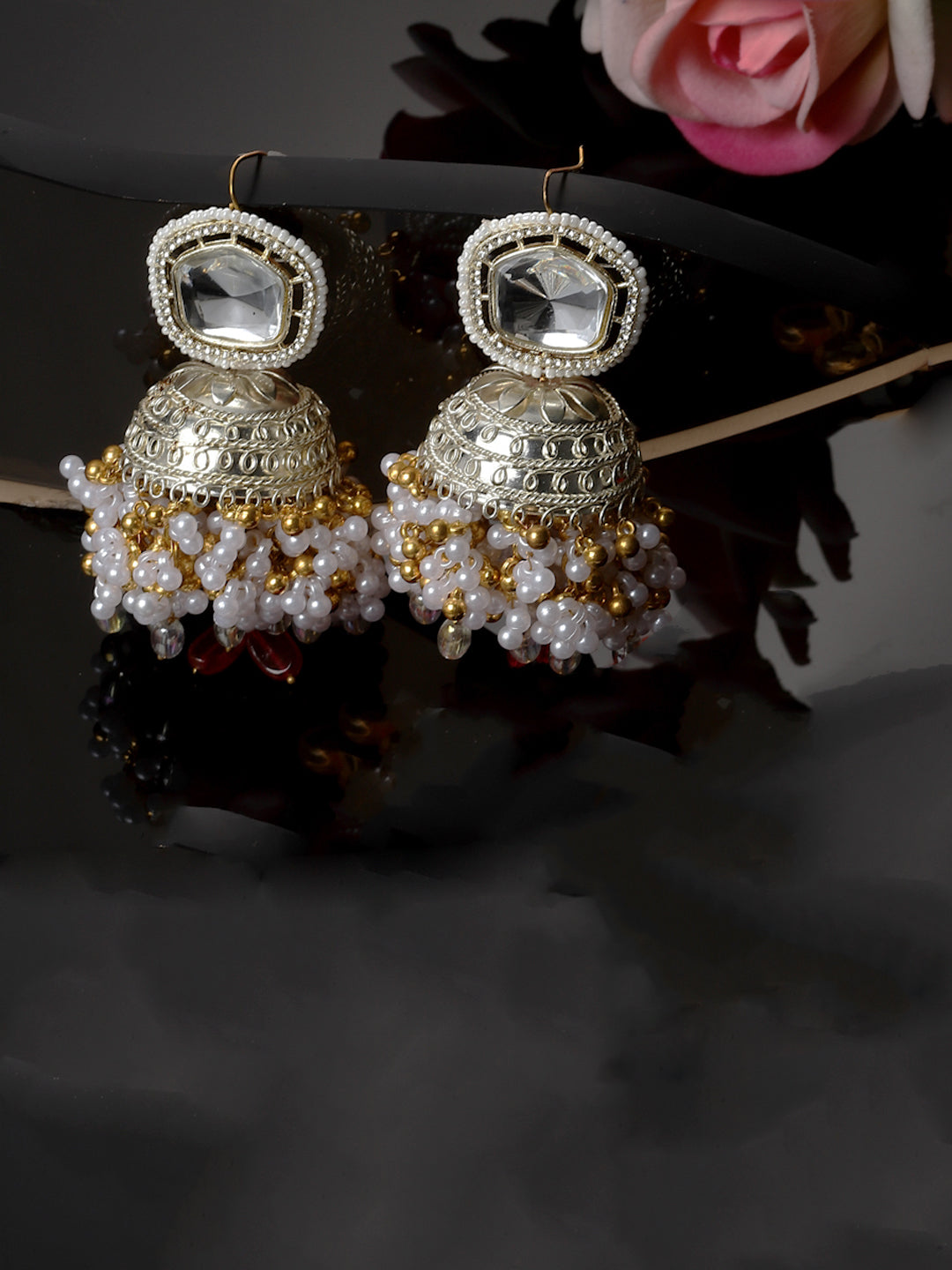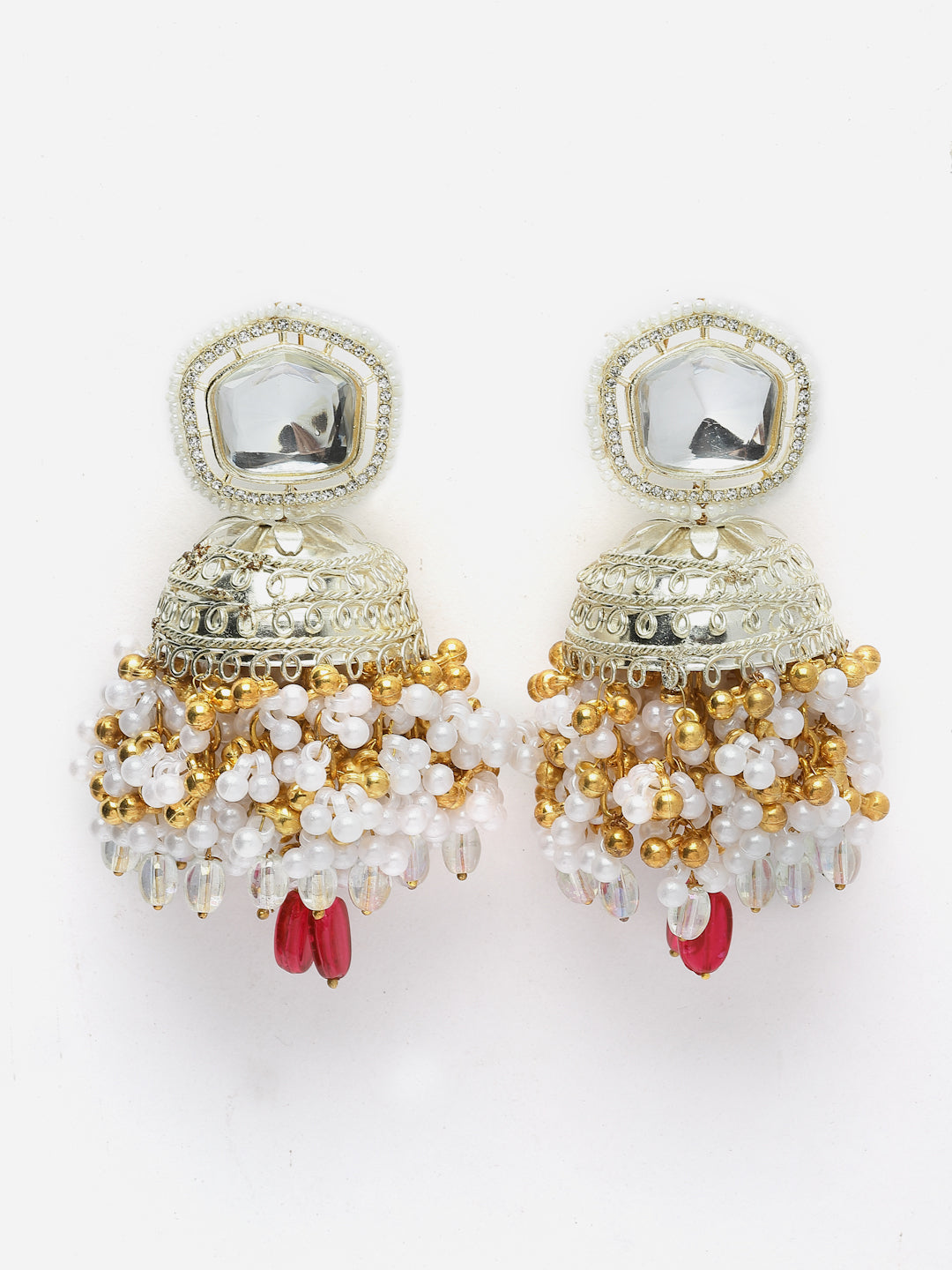 Super Light With Pastic Pearl Latkan And Tinch Of Red In White Jhumki Effect; Category Of Jewellery Is Earring; Sub Category Is Jhumka; Ideal For Women; Color Is Silver, Red, Gold, White; Gemstones Used - Kundan, American Diamonds, Pearls, Natural Stones; Plating Is Gold-Plated; Base Metal Is Alloy; Other Material Used - Closure Stopper; Size Is Freesize; Adjustable - No; Weight Is 71 Gms; Mesaurements - Length Of Earring= 8.5 Cm; Width Of Earring =5 Cm; Adjustable - No; Content 1 Pair Earring