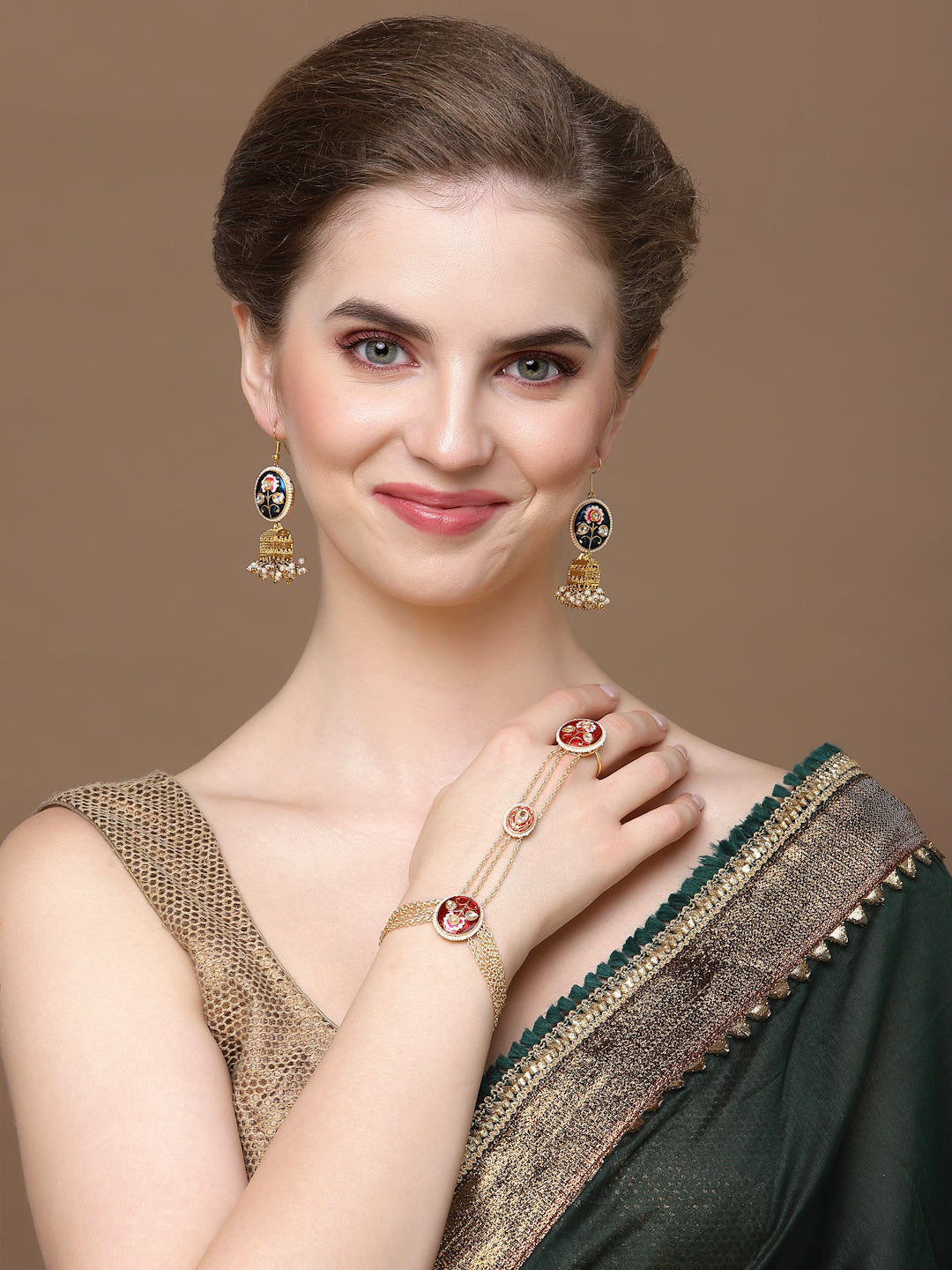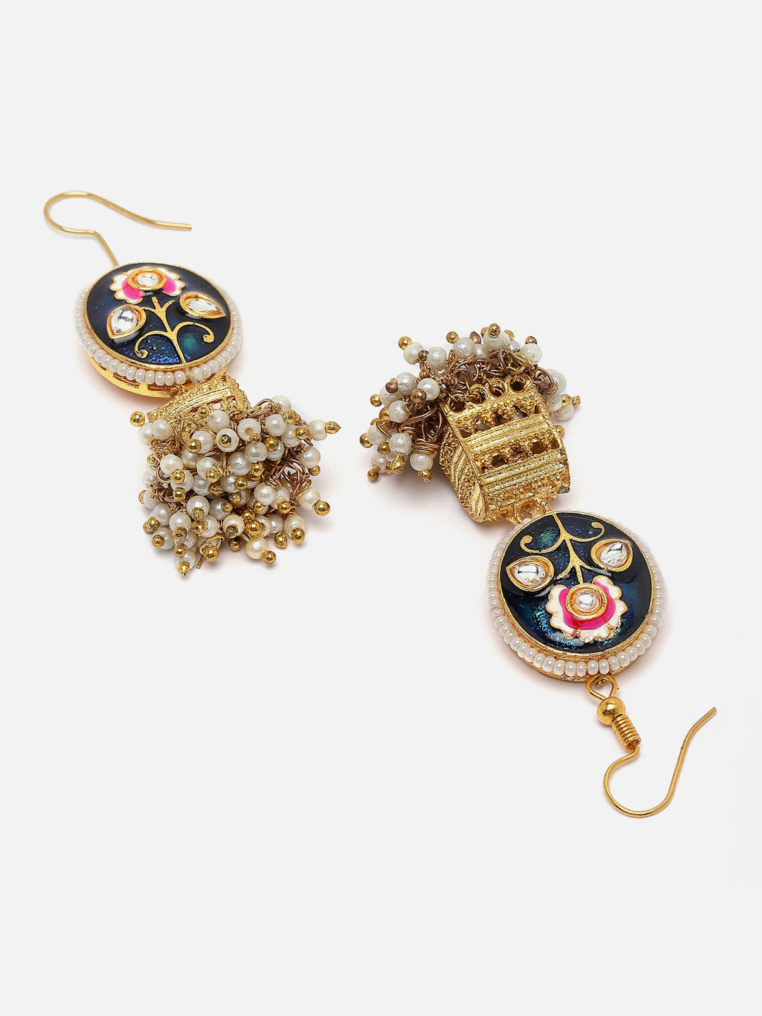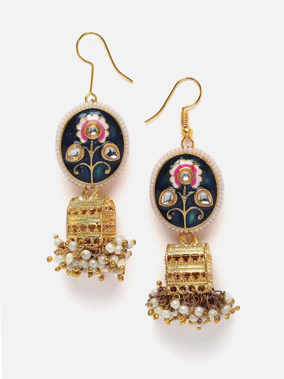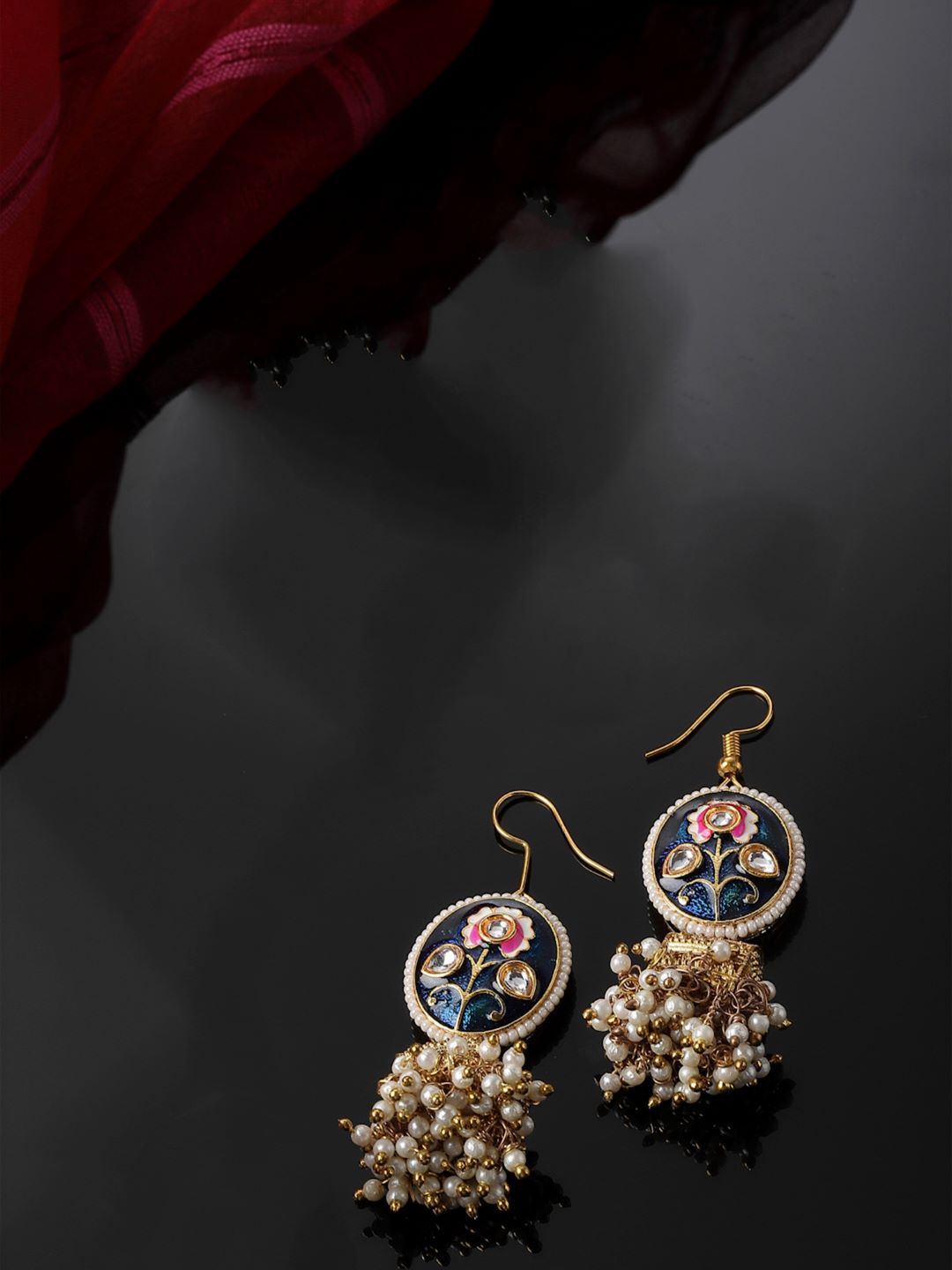 Jhumki With Blue Meenakari And Jhumki Makes It Elegant; Category Of Jewellery Is Earring; Sub Category Is Jhumka; Ideal For Women; Color Is Blue, Gold, Pink, White; Gemstones Used - Kundan, Pearls, Natural Stones; Plating Is Gold-Plated; Base Metal Is Alloy; Other Material Used - Fish Hook; Size Is Freesize; Adjustable - No; Weight Is 18 Gms; Mesaurements - Length Of Earring= 7 Cm; Width Of Earring =2.5 Cm; Adjustable - No; Content 1 Pair Earring
