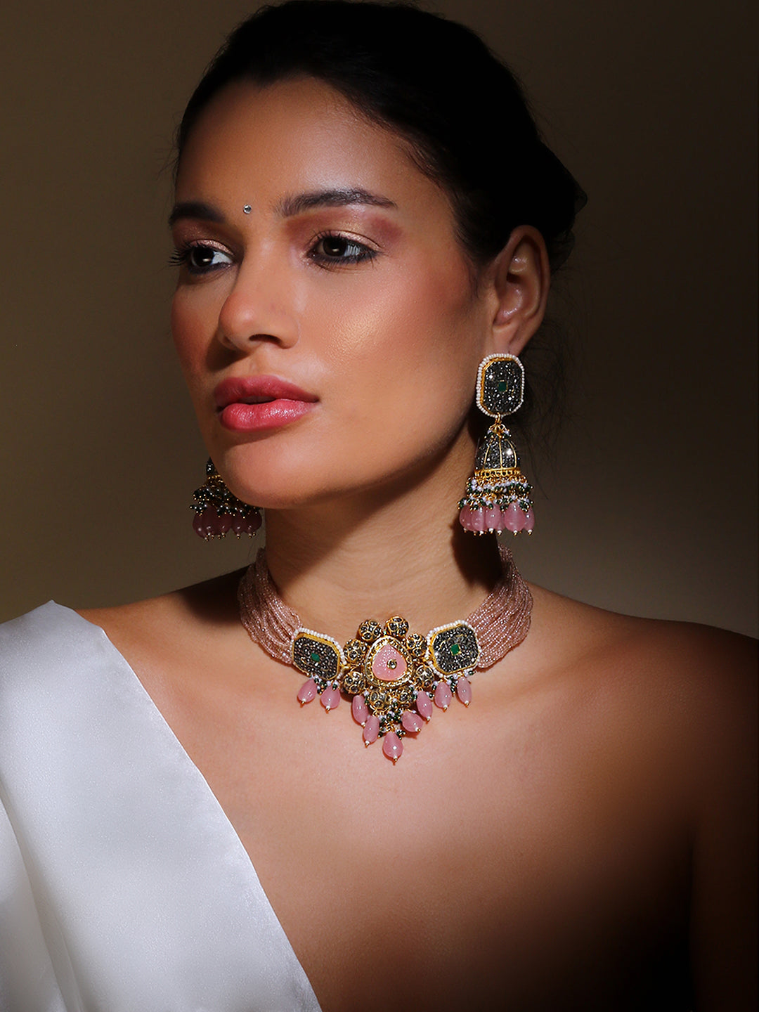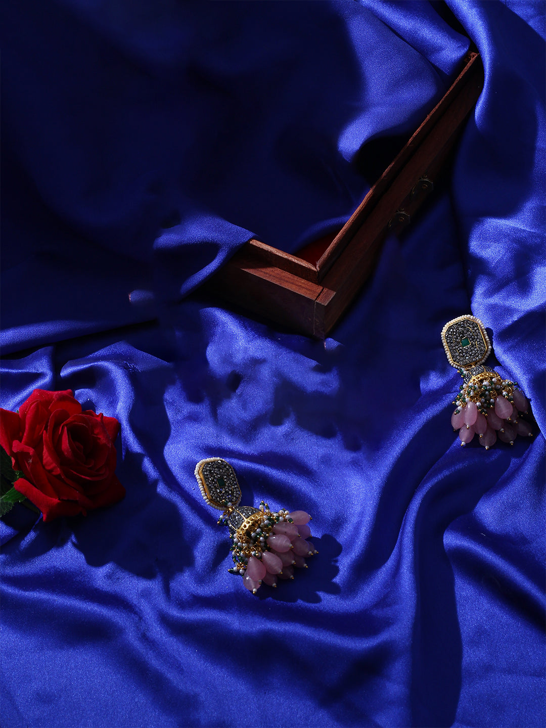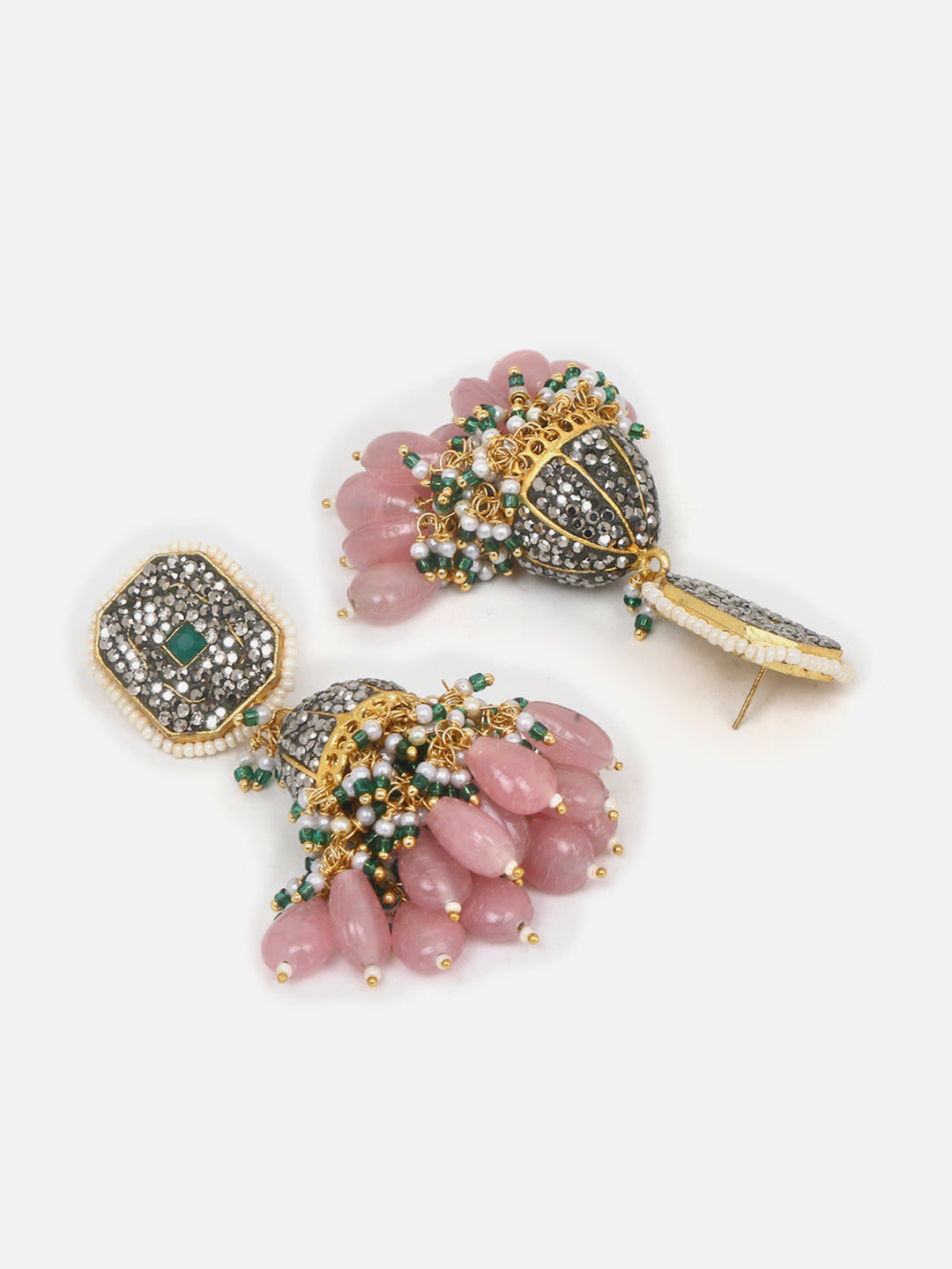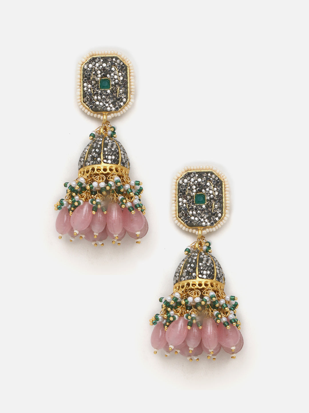 Black And Pink Jhumki With Green Highlight Trending; Category Of Jewellery Is Earring; Sub Category Is Jhumka; Ideal For Women; Color Is Pink, Black, Green, Cream, Gold, White; Gemstones Used - Kundan, American Diamonds, Pearls, Natural Stones; Plating Is Gold-Plated; Base Metal Is Alloy; Other Material Used - Closure Stopper; Size Is Freesize; Adjustable - No; Weight Is 71 Gms; Mesaurements - Length Of Earring= 9 Cm; Width Of Earring =4 Cm; Adjustable - No; Content 1 Pair Earring