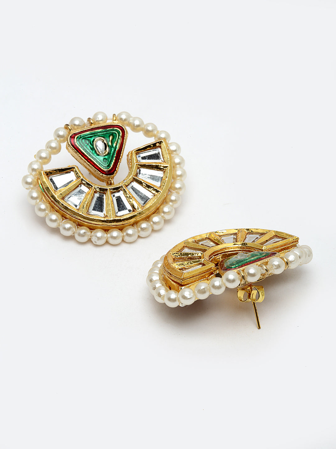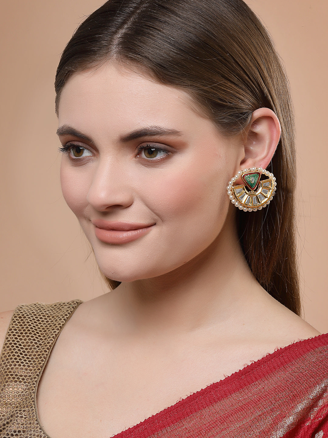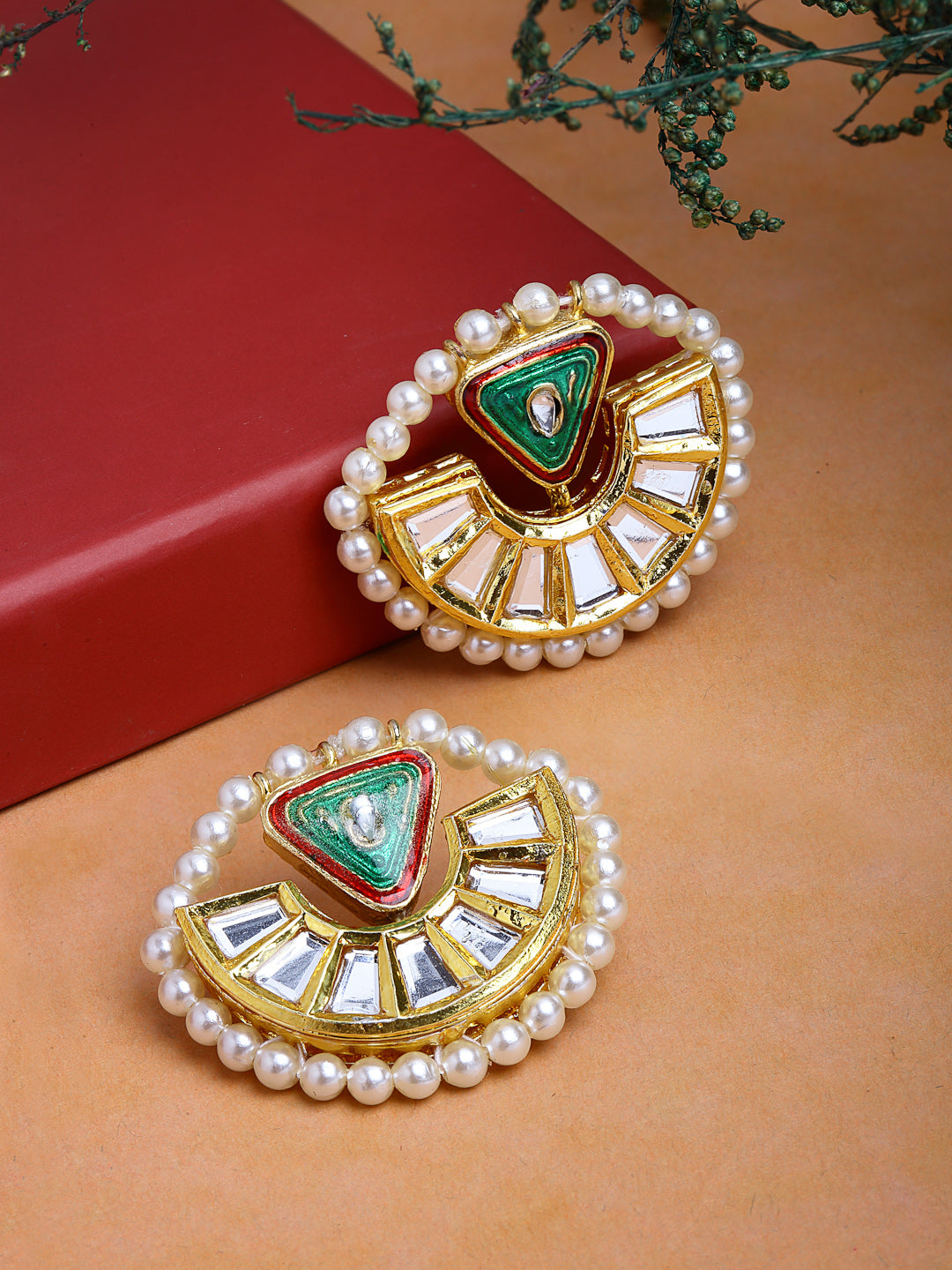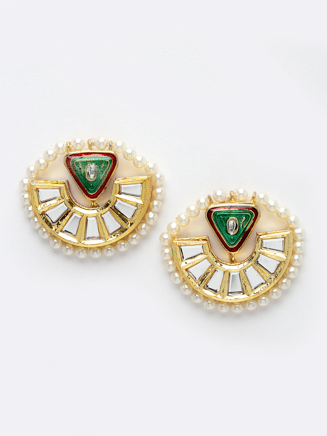 Meenakari And Kundan Amalagmating Big Top Earring; Category Of Jewellery Is Earring; Sub Category Is Stud; Ideal For Women; Color Is Green, Red, Cream, Gold, White; Gemstones Used - Kundan, Pearls, Natural Stones; Plating Is Gold-Plated; Base Metal Is Alloy; Other Material Used - Closure Stopper And Kanchain; Size Is Freesize; Adjustable - No; Weight Is 23 Gms; Mesaurements - Length Of Earring= 4 Cm; Width Of Earring =4 Cm; Adjustable - No; Content 1 Pair Earring