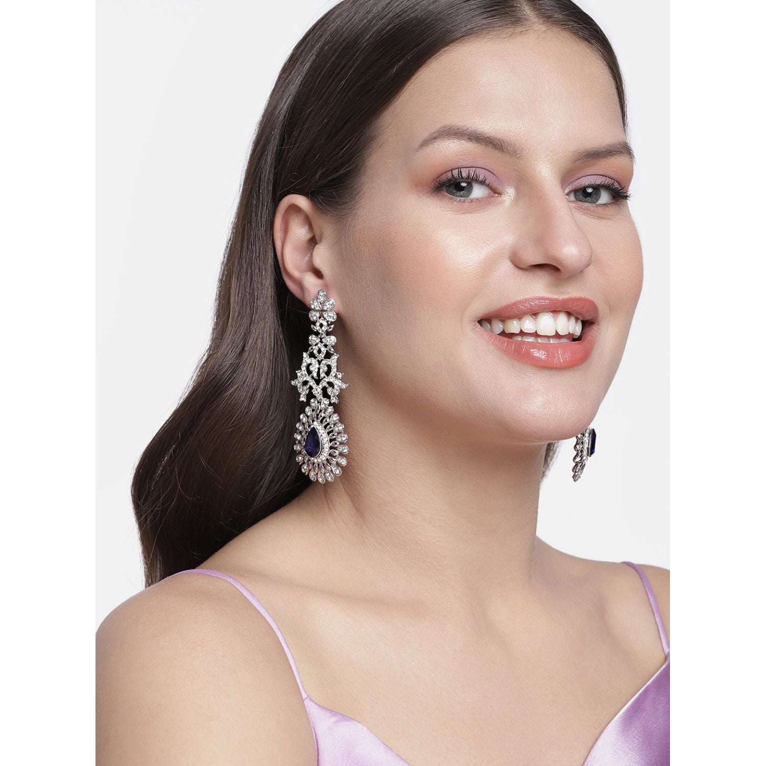 Rhodium Chandelier Earrings - This Earring set is crafted in Rhodium plated finish with stunning antique finish - these earrings are really special. It is light in weight. The stones used are of high quality. Be stylish and smart with these Silver Earring. Perfectly crafted. Wear it with a suit or a saree, and lehenga for an ethnic yet classy look.