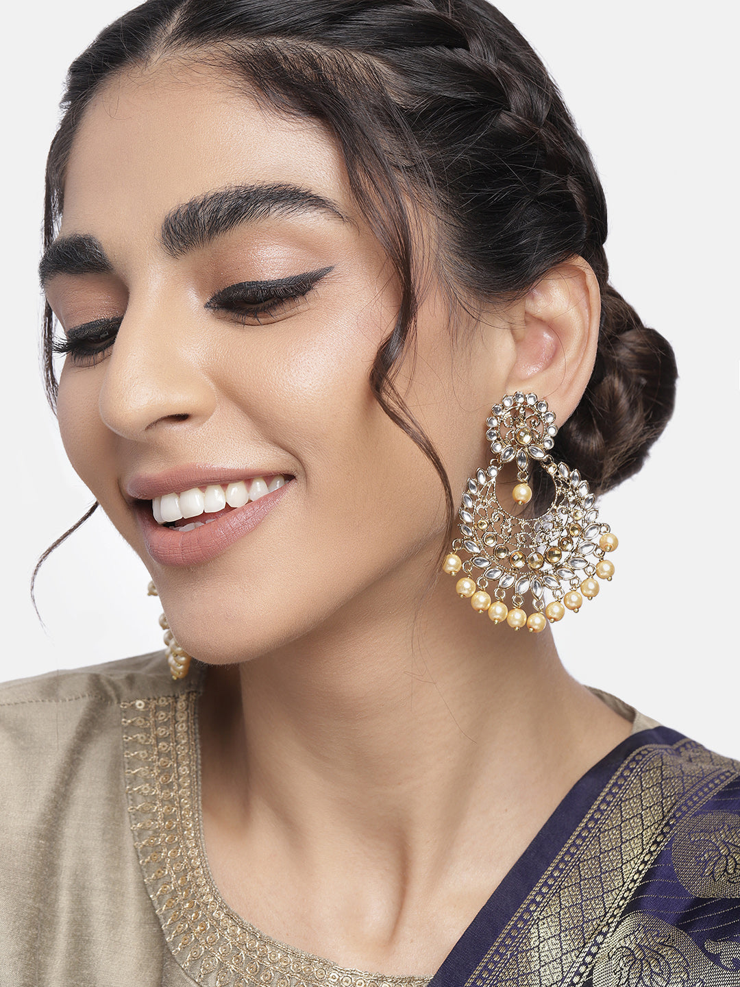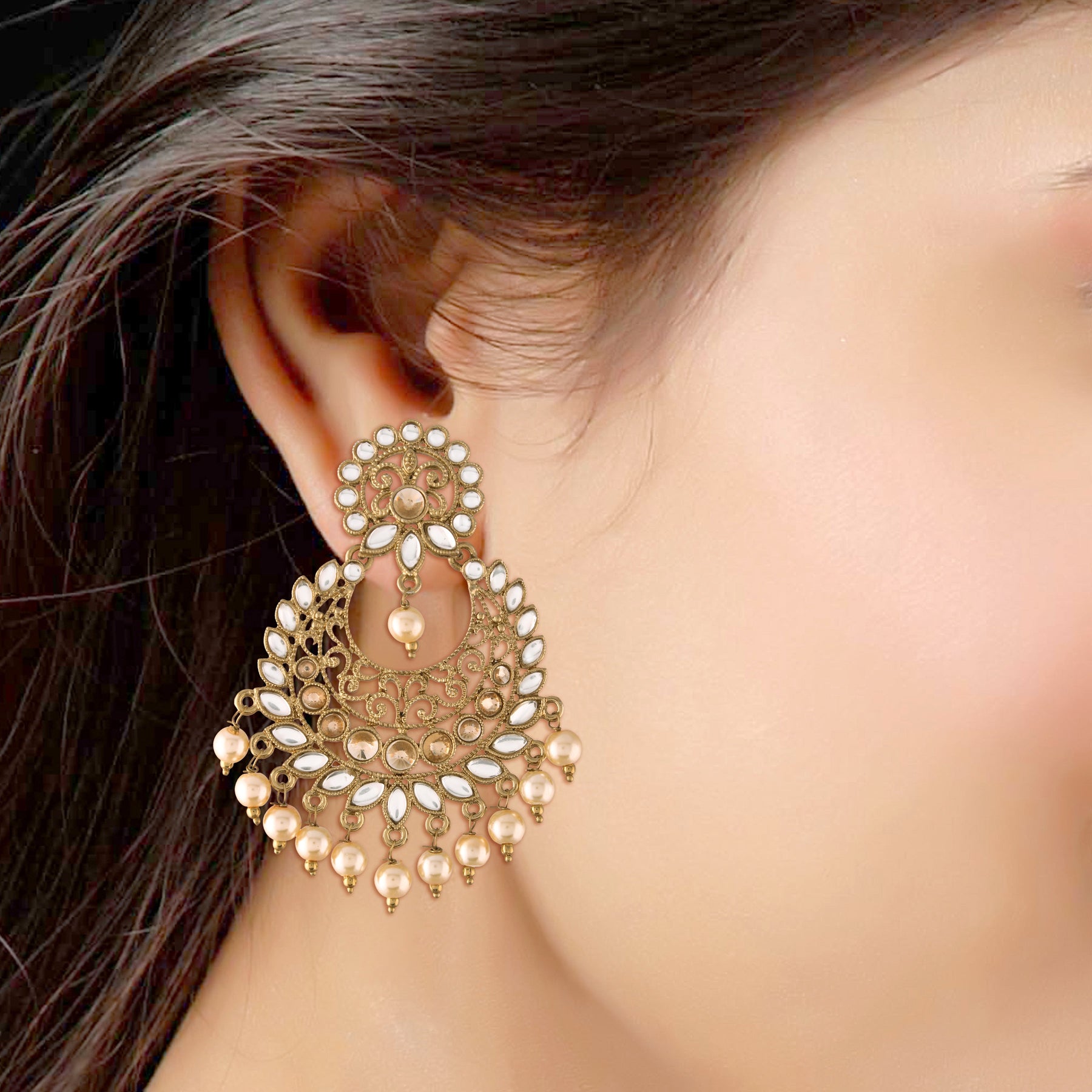 This Earring Set Is Crafted In Gold Plated Finish With Stunning Antique Finish - These Earrings Are Really Special .The Earrings Feature Kundan-Studded.Be Stylish And Smart With These Golden Earring. Perfectly Crafted. Wear It With A Suit Or A Saree, And Lehenga For An Ethnic Yet Classy Look. This Earring Set Is A Great Option And A Perfect Pick For Your Wedding Functions. Be Assured To Find A Variety Of Contemporary And Traditional Designs In The Mesmerising Collection That We Offer