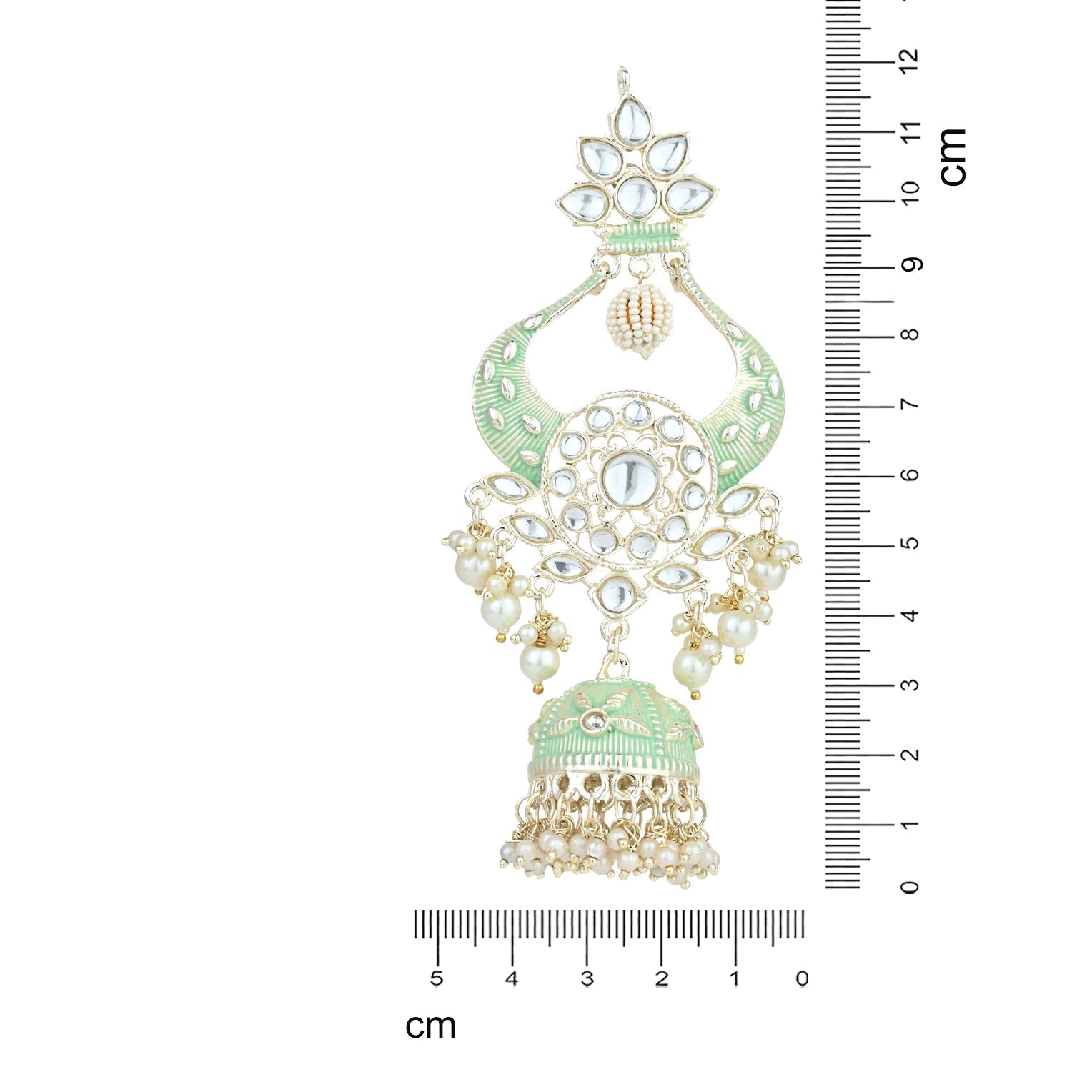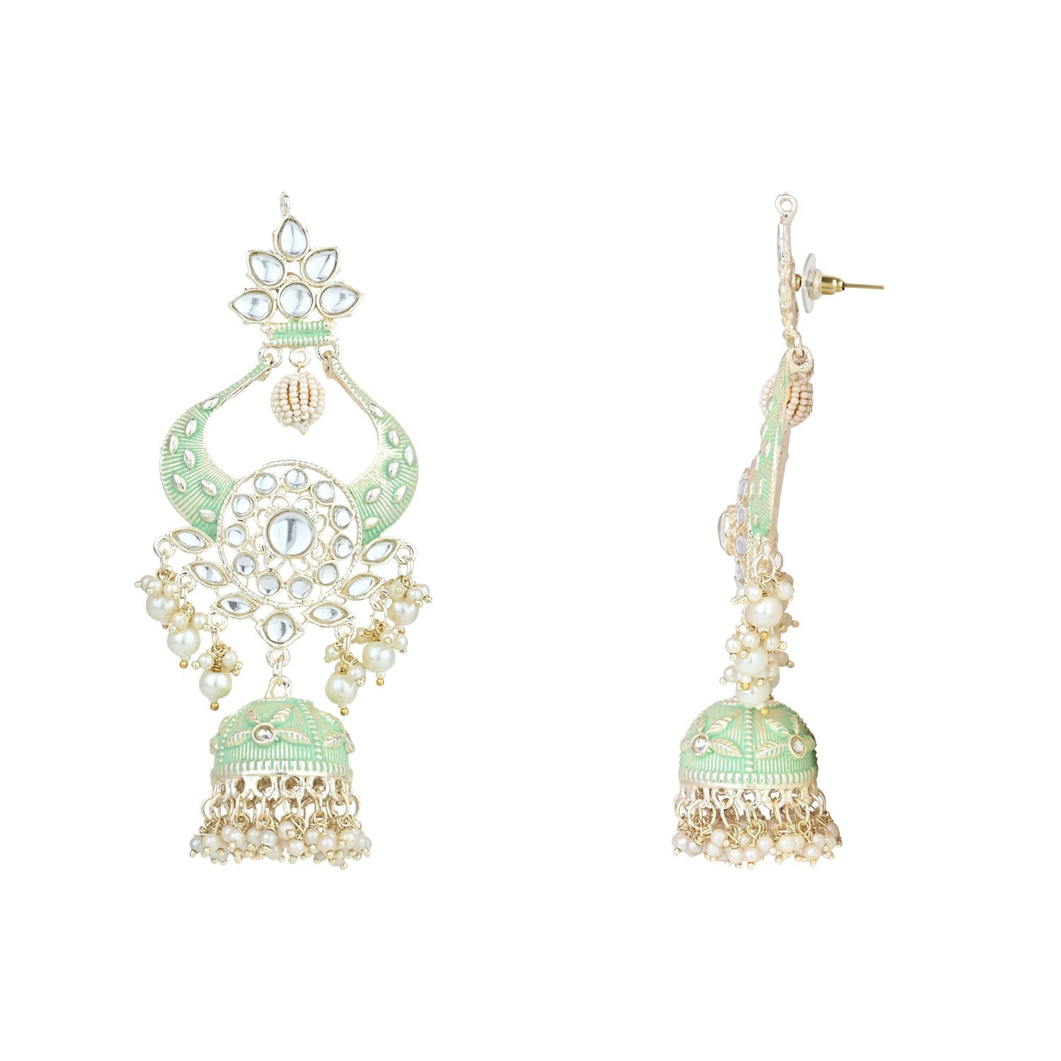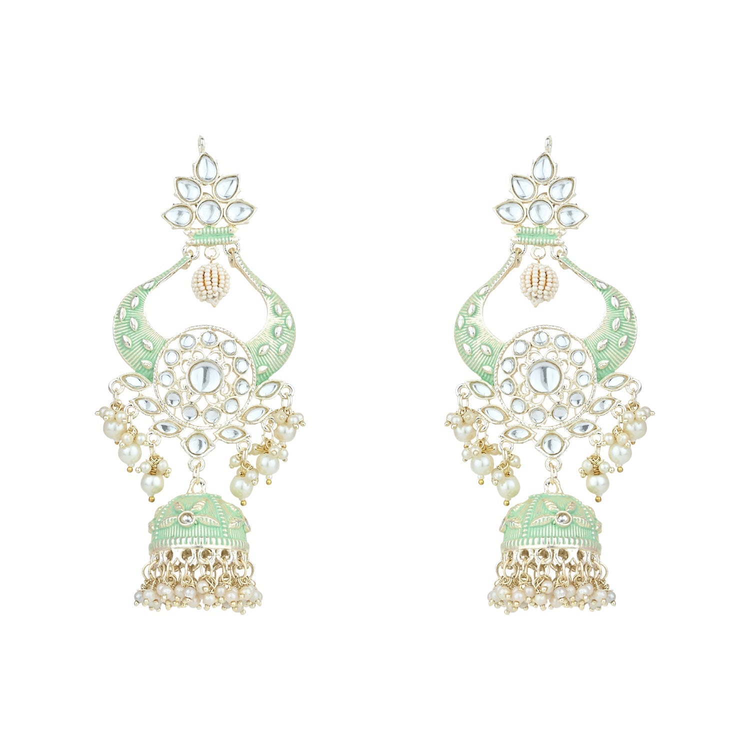 DIMENSION: Earring Height - 12 Cm x Width - 4.5 cm. Introducing our exquisite meenakari jhumka earrings, a timeless blend of elegance and tradition for the modern woman. Crafted with meticulous attention to detail, these earrings are a testament to the rich heritage of Indian jewelry. Inspired by the vibrant art of Meenakari, our artisans have skillfully hand-painted intricate enamel designs on these earrings, adding a burst of color and character to the lustrous gold-plated base. The meenakari work not only enhances the visual appeal but also preserves the age-old craftsmanship. Each Kundan is carefully selected and placed, ensuring the highest quality and radiance. To complete the regal look, delicate pearl drops gracefully dangle from the bottom of the jhumka, adding a touch of grace and femininity to your attire. The pearls symbolize purity and elegance, making these earrings a perfect choice for weddings, festivals, or any special occasion.