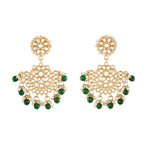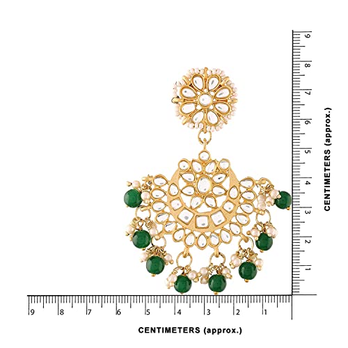 DIMENSION: Earring Height - 8 cm x Earring Width - 5.5 cm This earring set is crafted in 18K gold plated finish - these earrings are really special .The earrings feature kundan & pearl studded. Be stylish and smart with these Earrings. Wear it with a suit or a saree, and lehenga for an ethnic yet classy look. This earring set is a great option and a perfect pick for your wedding functions. Be assured to find a variety of contemporary and traditional designs in the mesmerising collection that we offer Adding a unique touch to this kundan work earrings with an unconventional shape, these earrings are statement worthy.