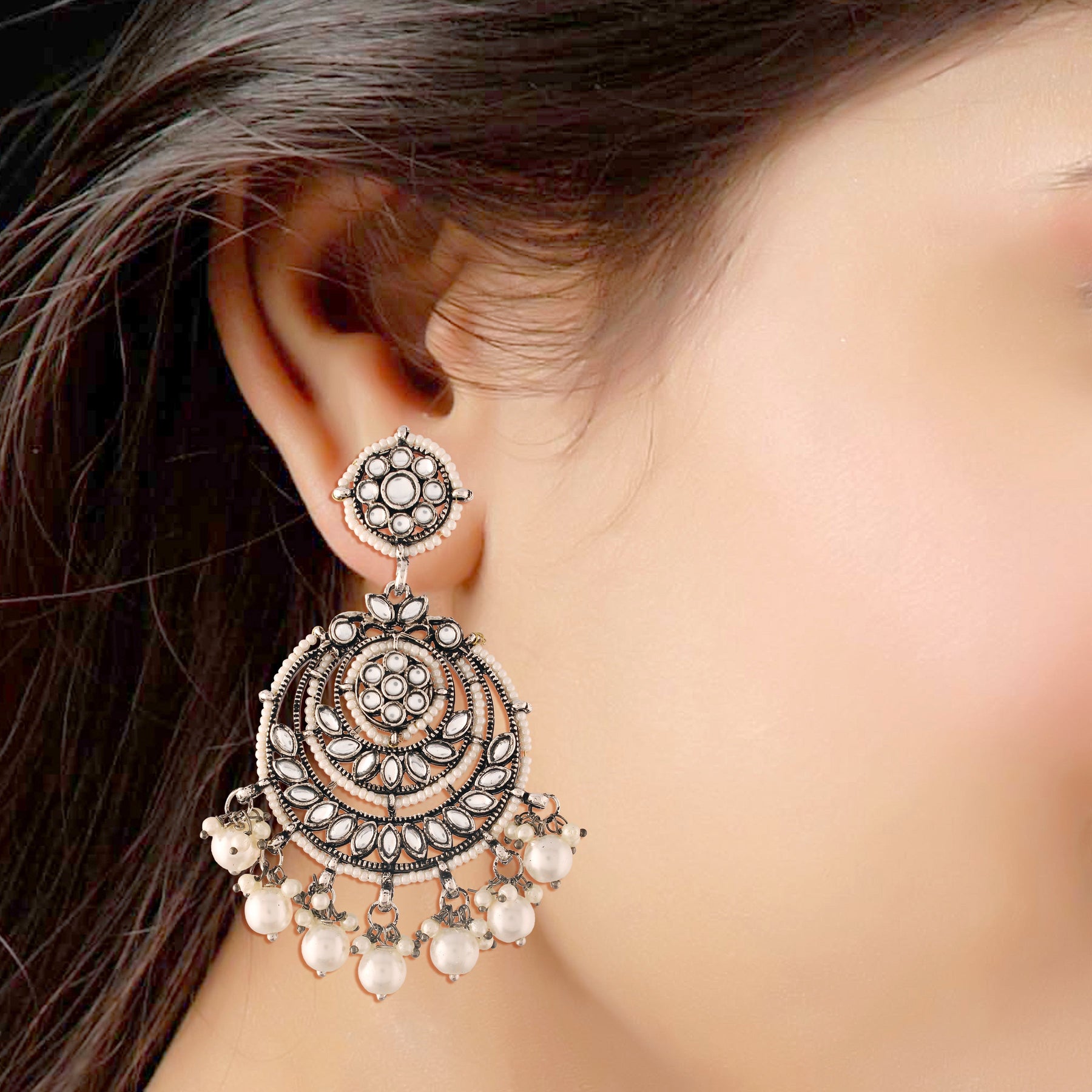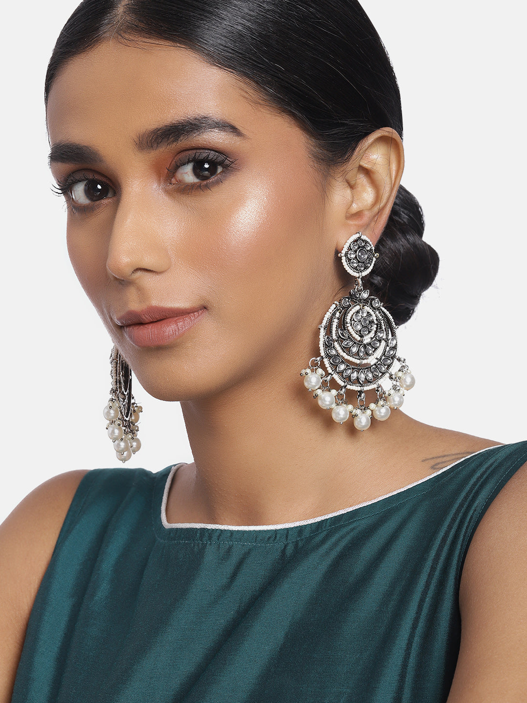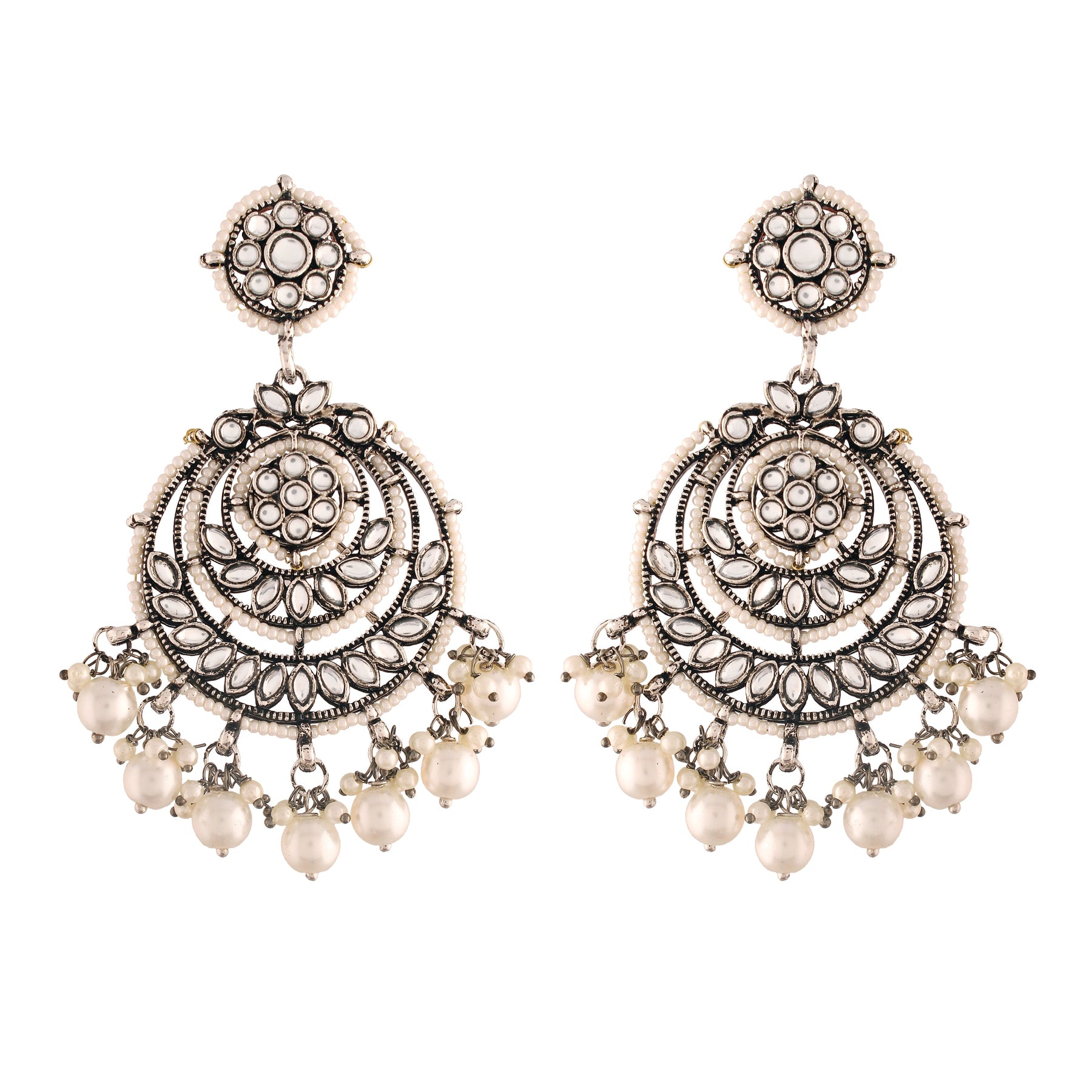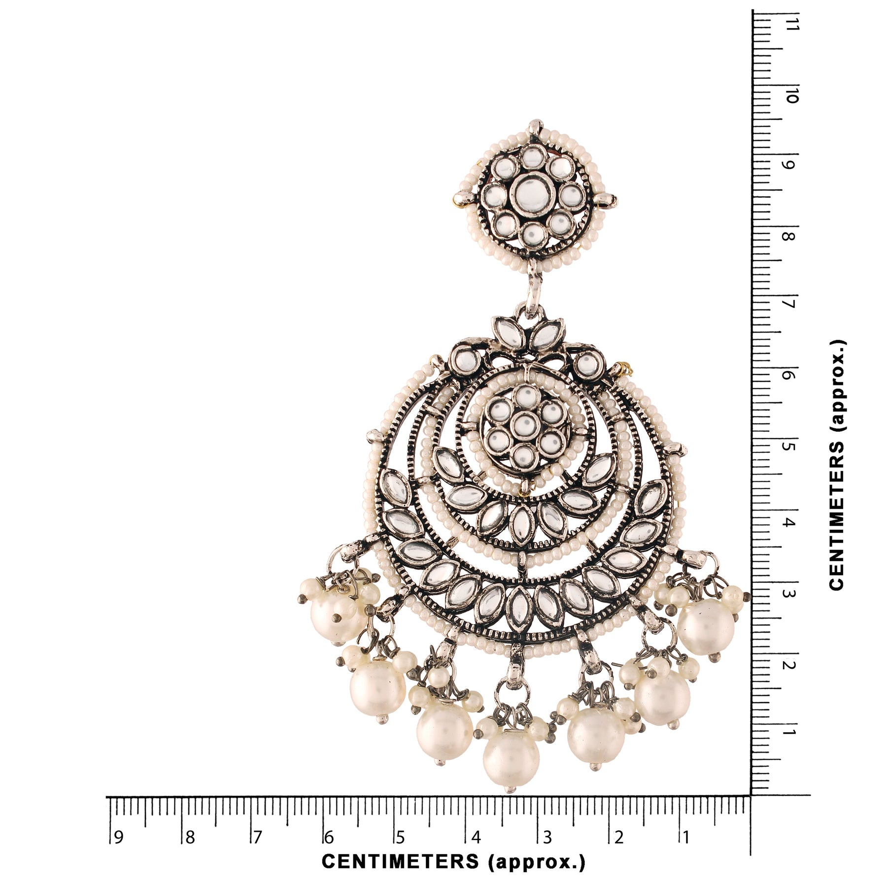 DIMENSIONS: Earring Height - 8.5 Cm X Width - 6 Cm. This Chandbali Earring set is crafted in 18K Rhodium plated glided with kundan and `pearls. This captivating earring is a great gifting option and is a perfect pick to add to your jewelry collection. You can style it with ethnic or western clothing.
