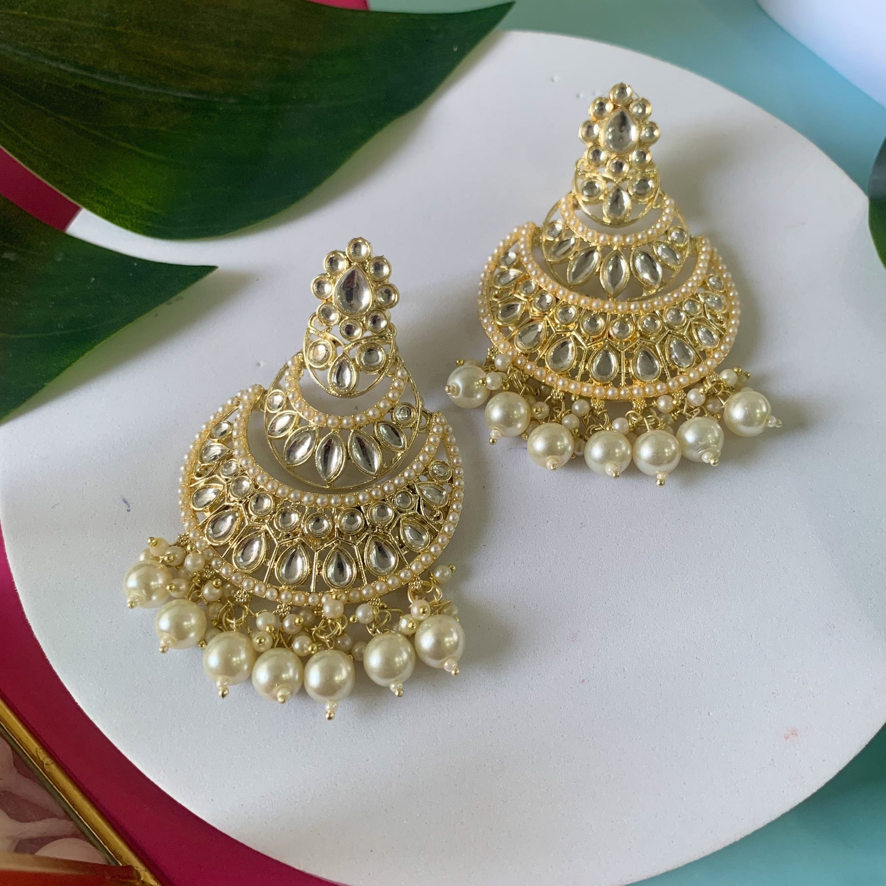 The enchanting design of these earrings showcases a crescent chandbali style, symbolizing elegance and grace. The lustrous gold plating radiates a regal allure, exuding opulence and sophistication. The intricate craftsmanship is evident in every element, making these earrings a true work of art.Adorned with delicate pearls and mesmerizing Kundan beads, these earrings add a touch of femininity and charm to any ensemble. The pearls, renowned for their purity and elegance, gracefully dangle from the chandbali base, creating a captivating movement that catches the light. The Kundan beads, with their vibrant colors and exquisite craftsmanship, bring a traditional yet contemporary flair to these earrings.
