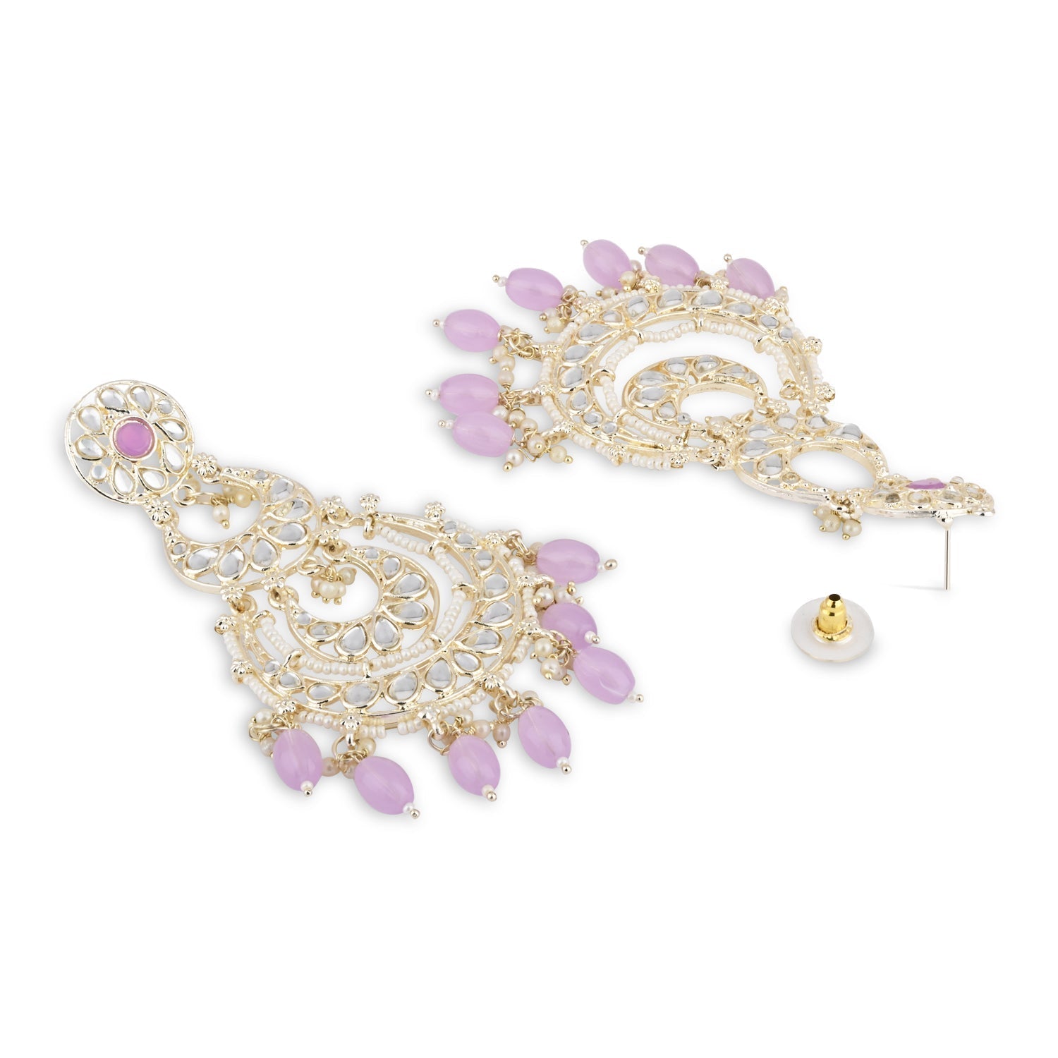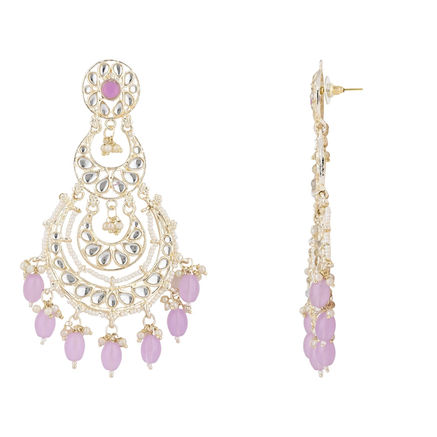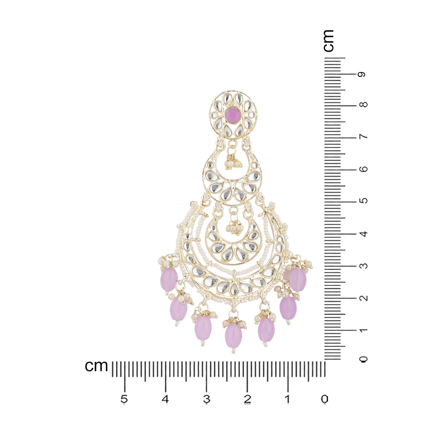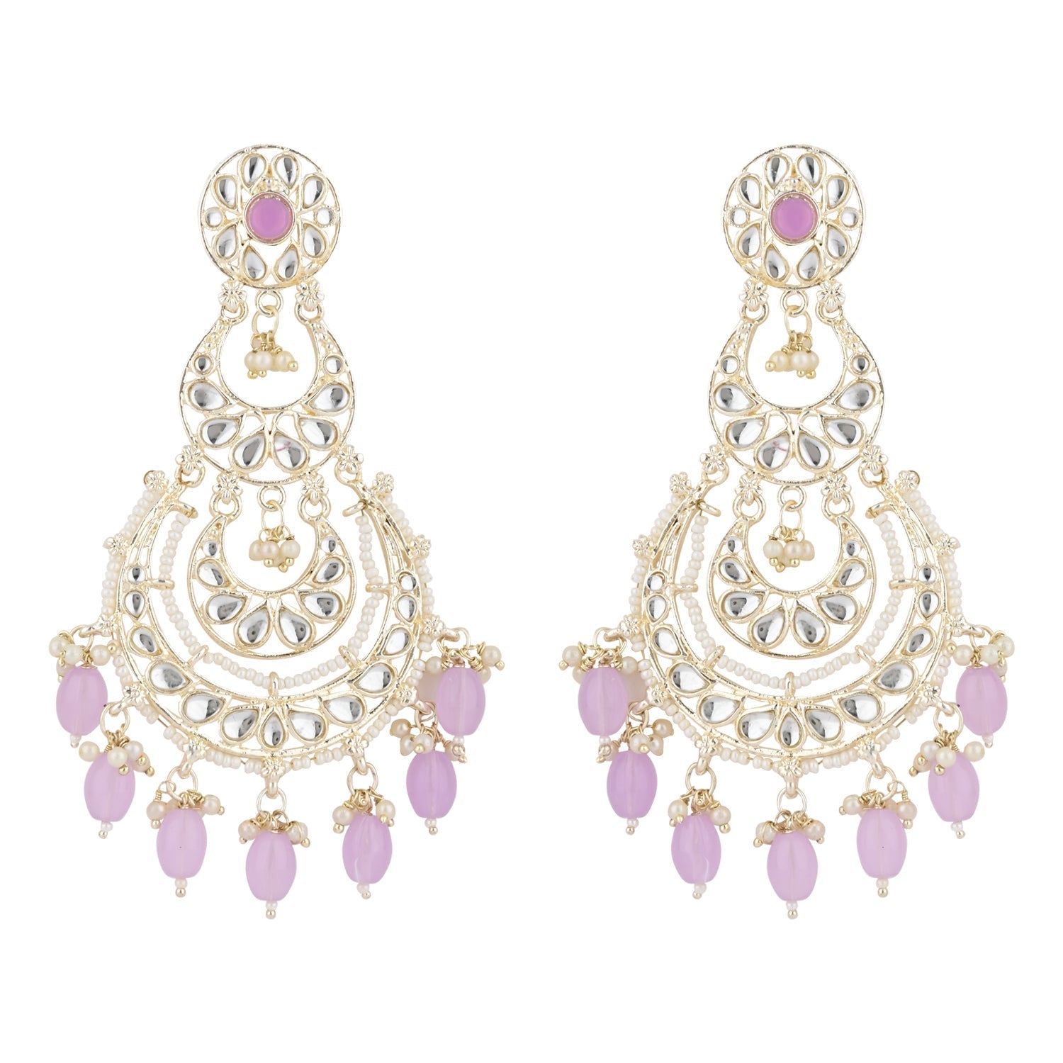Gold plated traditional white Kundan studded pearl handcrafted dangle chandbali earrings are a type of ethnic jewelry that is intricately designed and crafted to be worn on the ears. The earrings feature a gold-plated metal base that is embellished with white Kundan stones and pearls. The pearls used in the earrings add a touch of elegance and sophistication to the overall design. These earrings are perfect for special occasions such as weddings, festivals, or formal events, where they can be worn to complement traditional Indian outfits such as sarees, lehengas, or salwar kameez. They can also be paired with western outfits for a fusion look. To maintain their shine and luster, it is recommended to store them in a dry and cool place when not in use and to avoid exposing them to moisture or chemicals such as perfumes or hairspray.