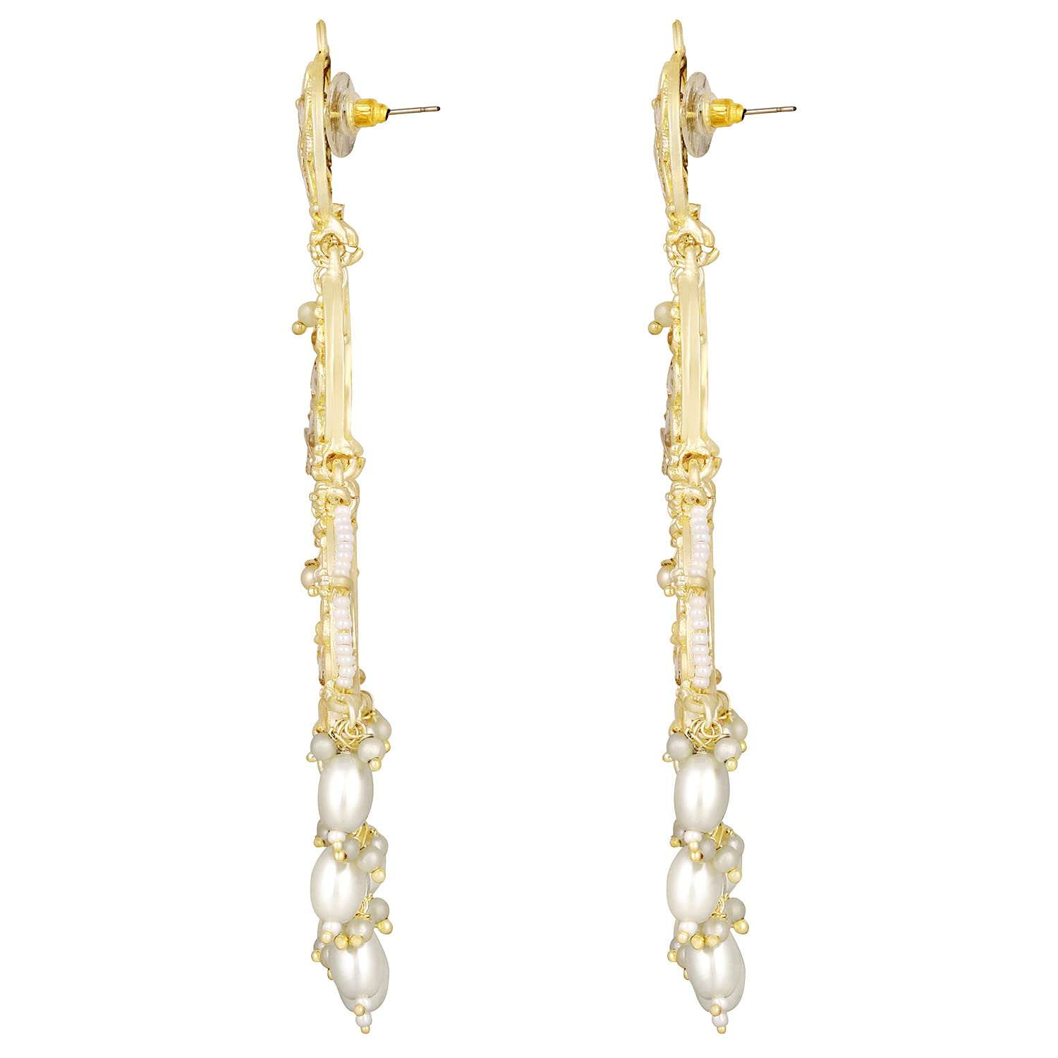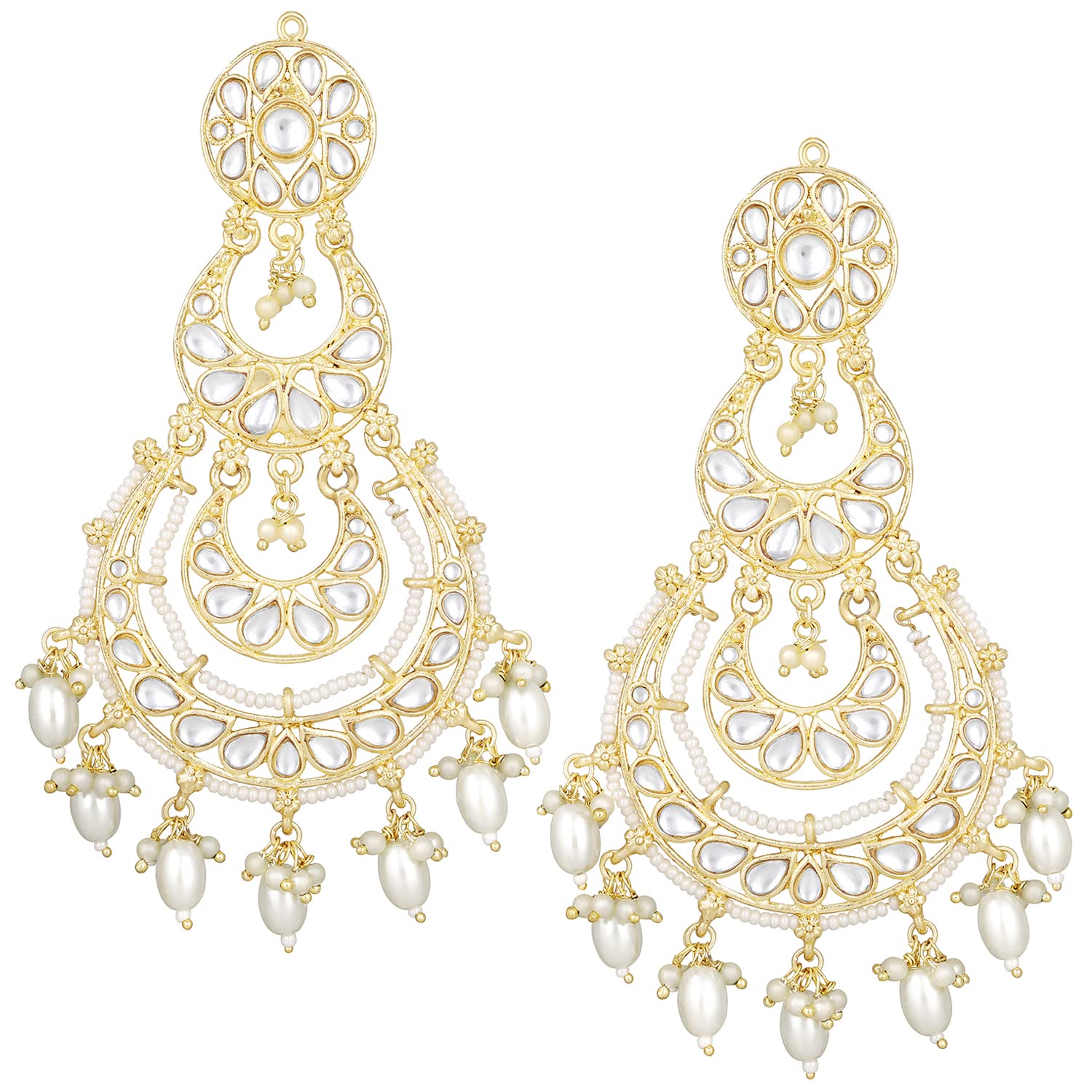 Women's 18K Gold Plated Traditional White Kundan Studded Pearl Handcrafted Dangle Chandbali Earrings
