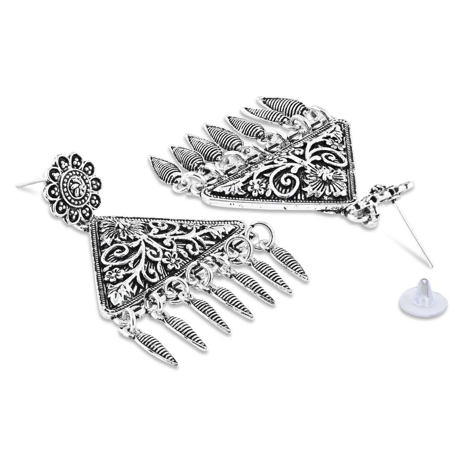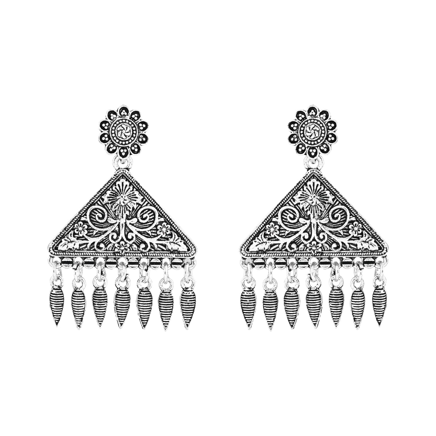 Elevate Your Accessory Collection With Our Silver Oxidized Tribal Jhumka Earrings, A Perfect Fusion Of Traditional Elegance And Contemporary Style. These Earrings Are Meticulously Crafted For Women And Girls Who Appreciate The Allure Of Handcrafted Jewelry. Enhance Your Personal Style With These Earrings That Not Only Adorn You But Also Reflect Your Fine Taste In Accessories. The Perfect Embodiment Of Charm And Sophistication, These Earrings Are A Testament To The Enduring Beauty Of Handcrafted Jewelry. Discover A World Of Elegance And Artistry With Our Silver Oxidized Tribal Jhumka Earrings.