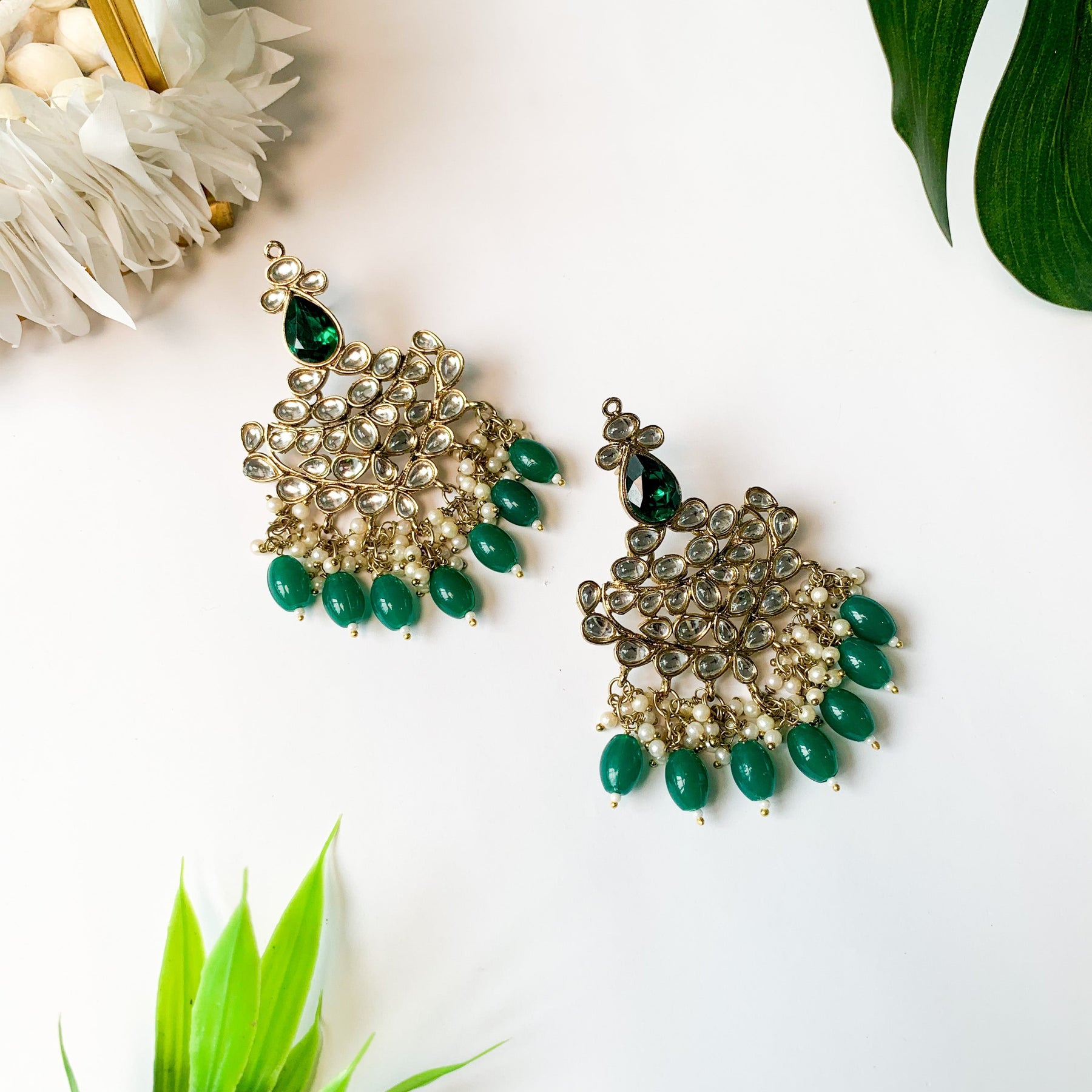 Gold plated traditional white Kundan studded pearl handcrafted dangle chandbali earrings are a type of ethnic jewelry that is intricately designed and crafted to be worn on the ears. The earrings feature a gold-plated metal base that is embellished with white Kundan stones and pearls. The pearls used in the earrings add a touch of elegance and sophistication to the overall design. These earrings are perfect for special occasions such as weddings, festivals, or formal events, where they can be worn to complement traditional Indian outfits such as sarees, lehengas, or salwar kameez. They can also be paired with western outfits for a fusion look. To maintain their shine and luster, it is recommended to store them in a dry and cool place when not in use and to avoid exposing them to moisture or chemicals such as perfumes or hairspray.