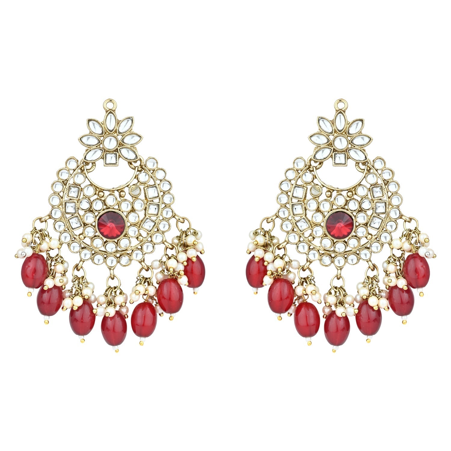 Gold plated traditional white Kundan studded pearl handcrafted dangle chandbali earrings are a type of ethnic jewelry that is intricately designed and crafted to be worn on the ears. The earrings feature a gold-plated metal base that is embellished with white Kundan stones and pearls. The pearls used in the earrings add a touch of elegance and sophistication to the overall design. These earrings are perfect for special occasions such as weddings, festivals, or formal events, where they can be worn to complement traditional Indian outfits such as sarees, lehengas, or salwar kameez. They can also be paired with western outfits for a fusion look. To maintain their shine and luster, it is recommended to store them in a dry and cool place when not in use and to avoid exposing them to moisture or chemicals such as perfumes or hairspray.