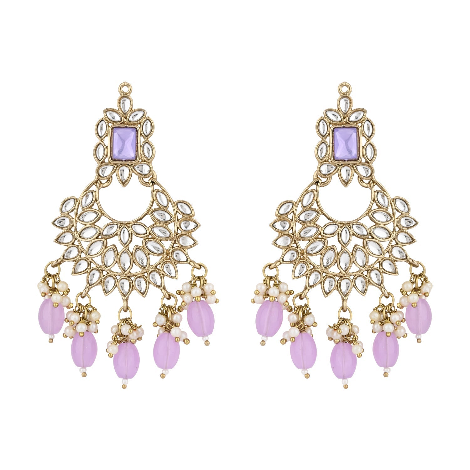 Gold plated traditional kundan studded pearl handcrafted dangle chandbali earrings are a type of ethnic jewelry that is intricately designed and crafted to be worn on the ears. The earrings feature a gold-plated metal base that is embellished with white kundan stones and pearls. The pearls used in the earrings add a touch of elegance and sophistication to the overall design. These earrings are perfect for special occasions such as weddings, festivals, or formal events, where they can be worn to complement traditional Indian outfits such as sarees, lehengas, or salwar kameez. They can also be paired with western outfits for a fusion look. To maintain their shine and luster, it is recommended to store them in a dry and cool place when not in use and to avoid exposing them to moisture or chemicals such as perfumes or hairspray.