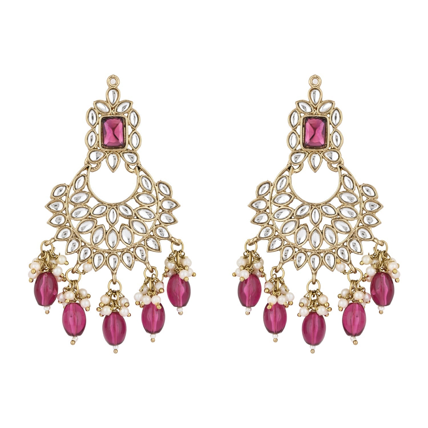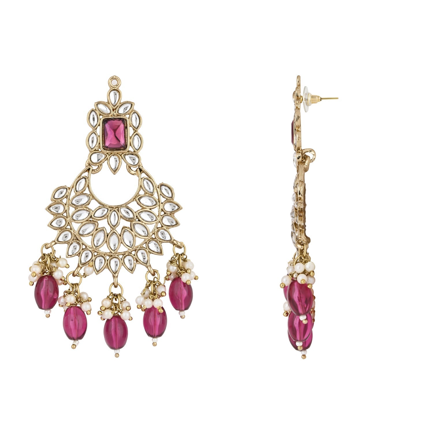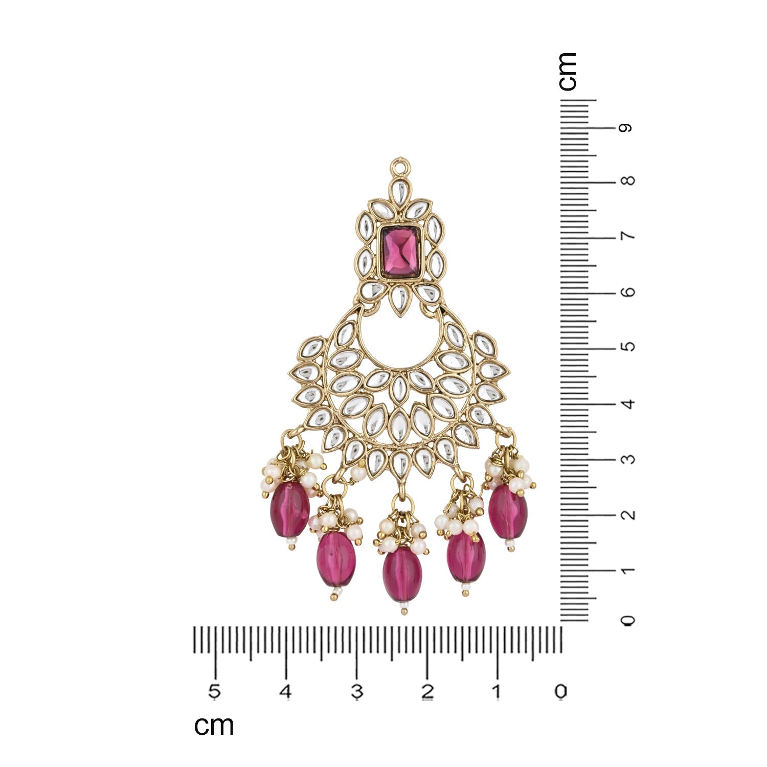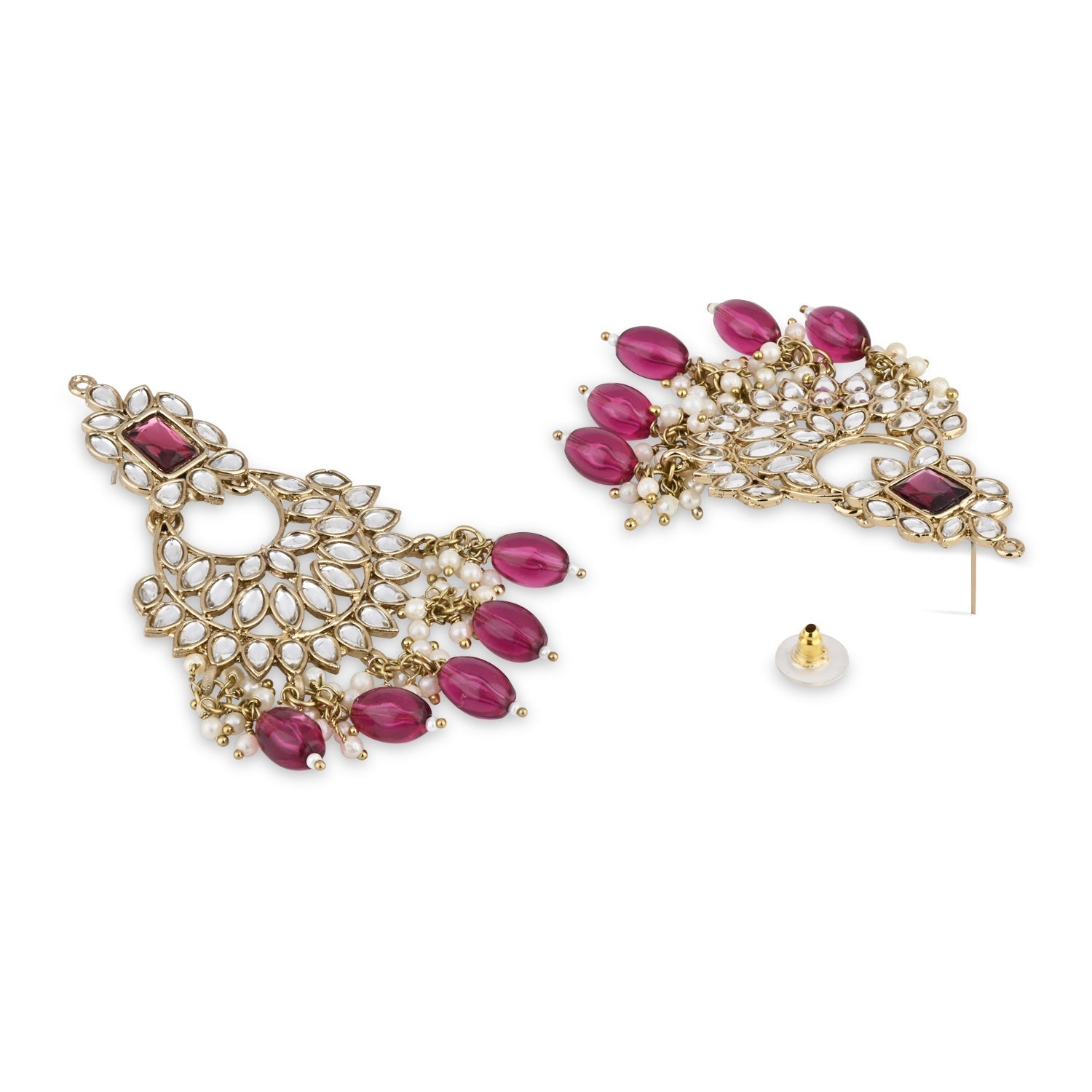 Gold plated traditional kundan studded pearl handcrafted dangle chandbali earrings are a type of ethnic jewelry that is intricately designed and crafted to be worn on the ears. The earrings feature a gold-plated metal base that is embellished with white kundan stones and pearls. The pearls used in the earrings add a touch of elegance and sophistication to the overall design. These earrings are perfect for special occasions such as weddings, festivals, or formal events, where they can be worn to complement traditional Indian outfits such as sarees, lehengas, or salwar kameez. They can also be paired with western outfits for a fusion look. To maintain their shine and luster, it is recommended to store them in a dry and cool place when not in use and to avoid exposing them to moisture or chemicals such as perfumes or hairspray.