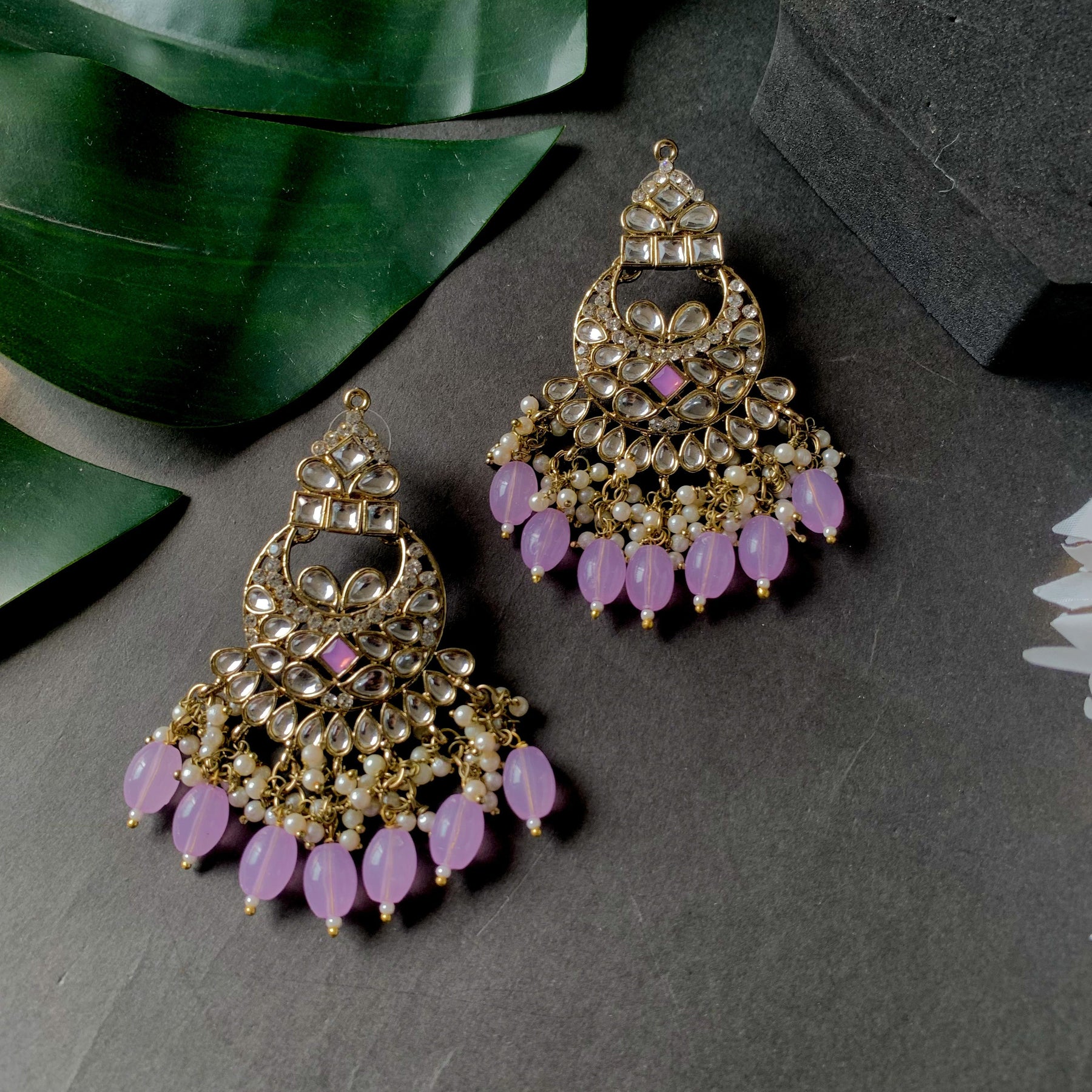 Gold plated traditional kundan studded pearl handcrafted dangle chandbali earrings are a type of ethnic jewelry that is intricately designed and crafted to be worn on the ears. The earrings feature a gold-plated metal base that is embellished with white kundan stones and pearls. The pearls used in the earrings add a touch of elegance and sophistication to the overall design. These earrings are perfect for special occasions such as weddings, festivals, or formal events, where they can be worn to complement traditional Indian outfits such as sarees, lehengas, or salwar kameez. They can also be paired with western outfits for a fusion look. To maintain their shine and luster, it is recommended to store them in a dry and cool place when not in use and to avoid exposing them to moisture or chemicals such as perfumes or hairspray.