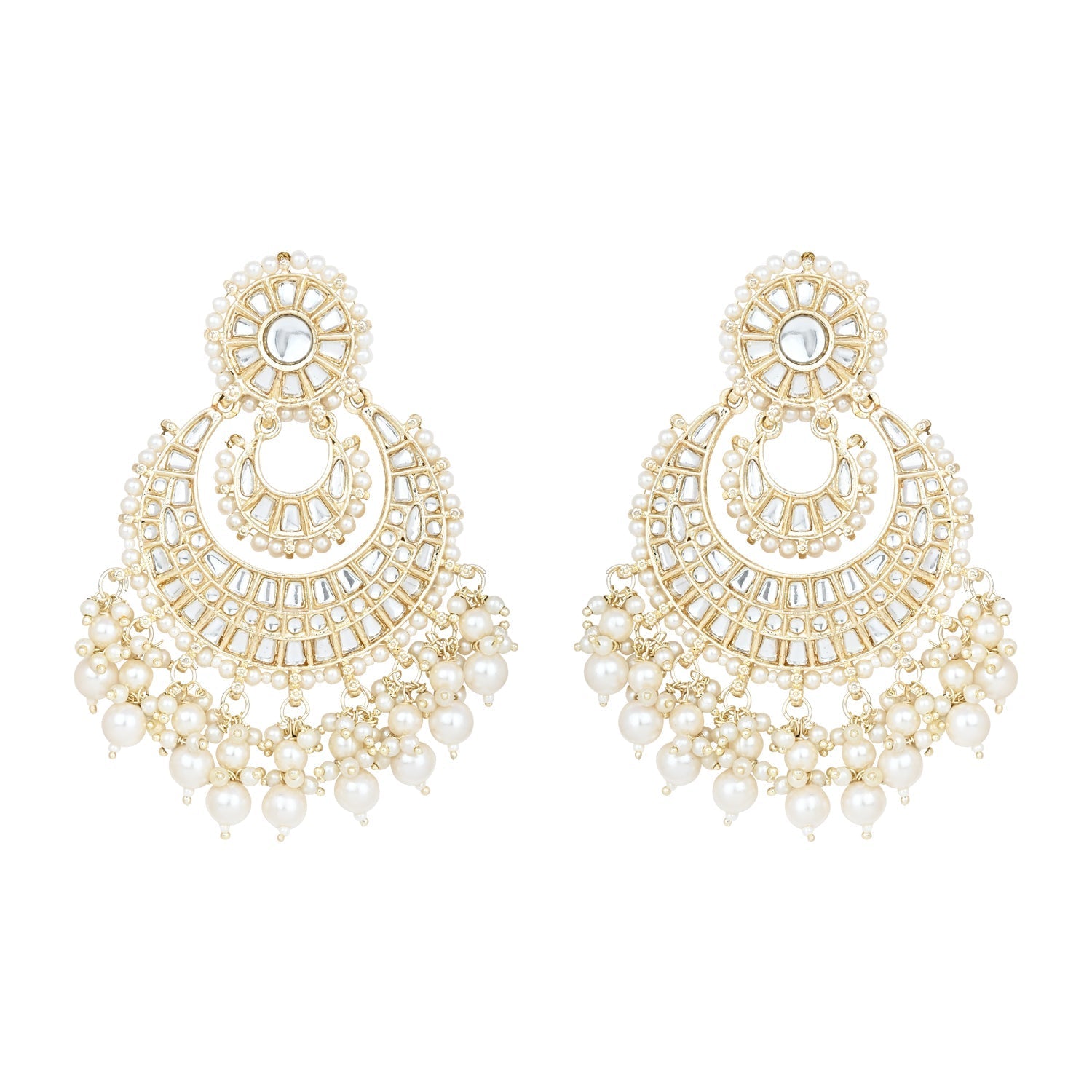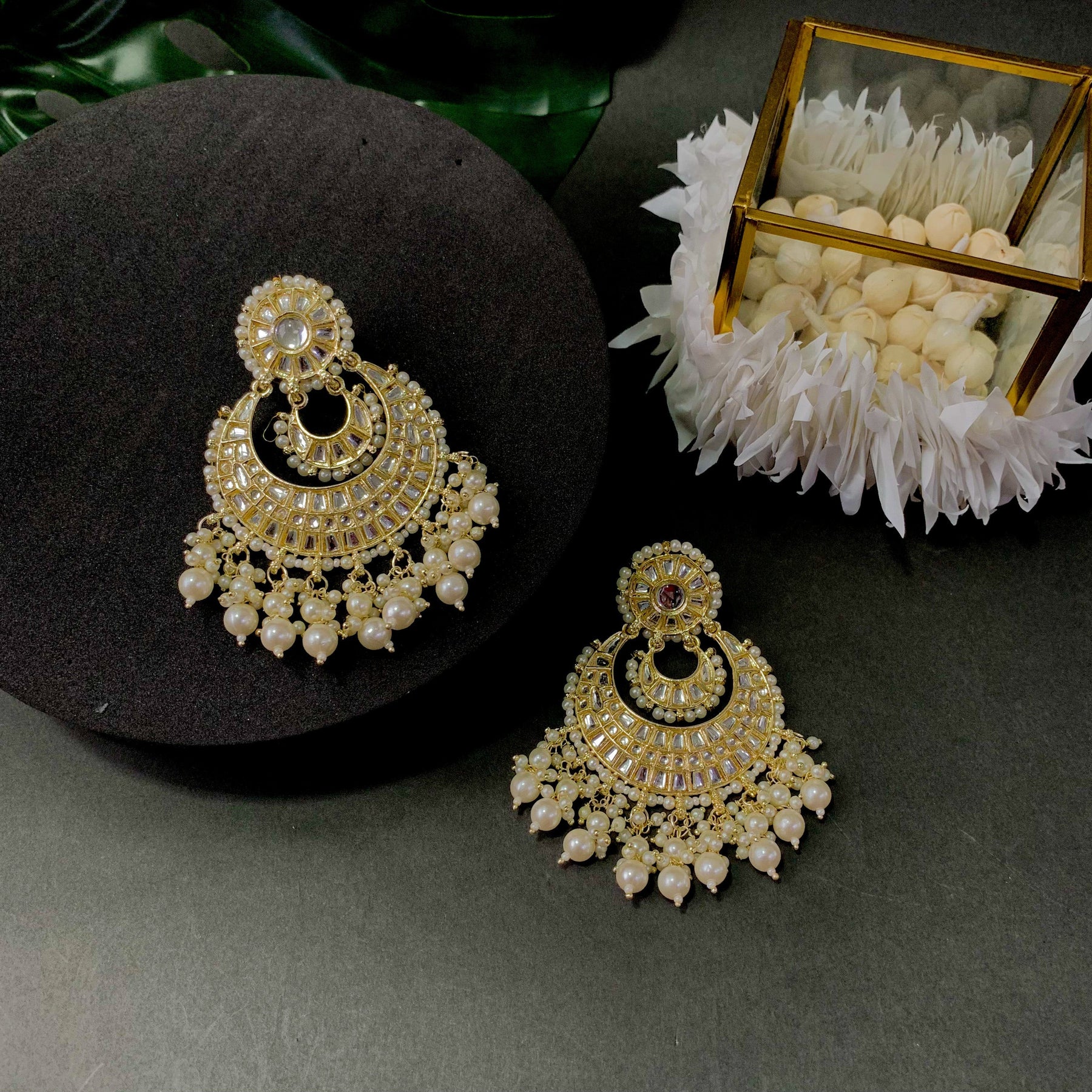 Gold plated traditional white Kundan studded pearl handcrafted dangle chandbali earrings are a type of ethnic jewelry that is intricately designed and crafted to be worn on the ears. The earrings feature a gold-plated metal base that is embellished with white Kundan stones and pearls. The pearls used in the earrings add a touch of elegance and sophistication to the overall design. These earrings are perfect for special occasions such as weddings, festivals, or formal events, where they can be worn to complement traditional Indian outfits such as sarees, lehengas, or salwar kameez. They can also be paired with western outfits for a fusion look. To maintain their shine and luster, it is recommended to store them in a dry and cool place when not in use and to avoid exposing them to moisture or chemicals such as perfumes or hairspray.