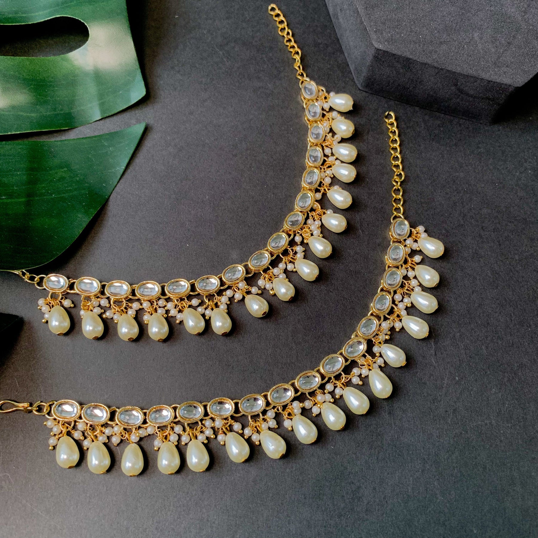 Gold plated traditional white Kundan studded pearl handcrafted dangle chandbali earrings are a type of ethnic jewelry that is intricately designed and crafted to be worn on the ears. The earrings feature a gold-plated metal base that is embellished with white Kundan stones and pearls. The pearls used in the earrings add a touch of elegance and sophistication to the overall design. These earrings are perfect for special occasions such as weddings, festivals, or formal events, where they can be worn to complement traditional Indian outfits such as sarees, lehengas, or salwar kameez. They can also be paired with western outfits for a fusion look. To maintain their shine and luster, it is recommended to store them in a dry and cool place when not in use and to avoid exposing them to moisture or chemicals such as perfumes or hairspray.
