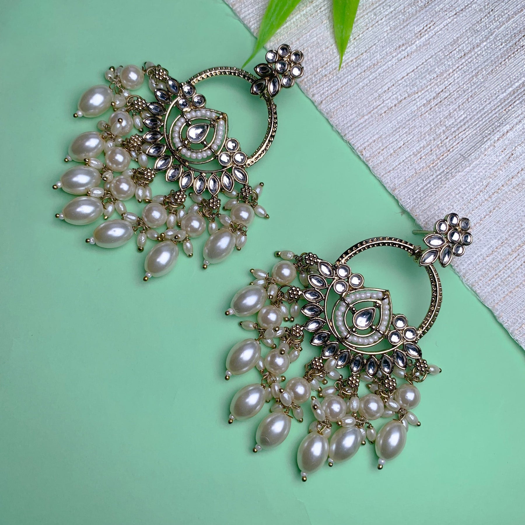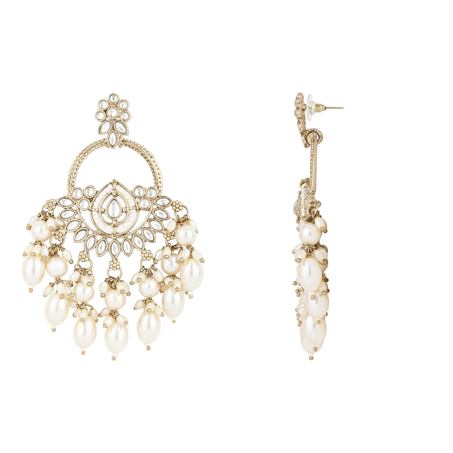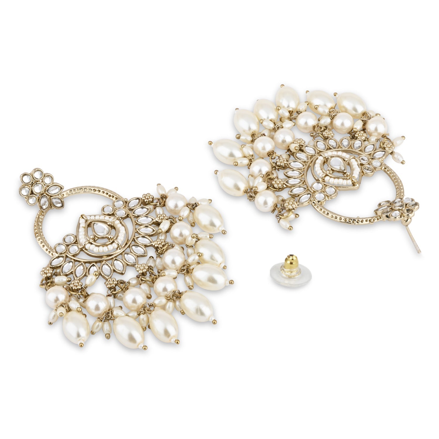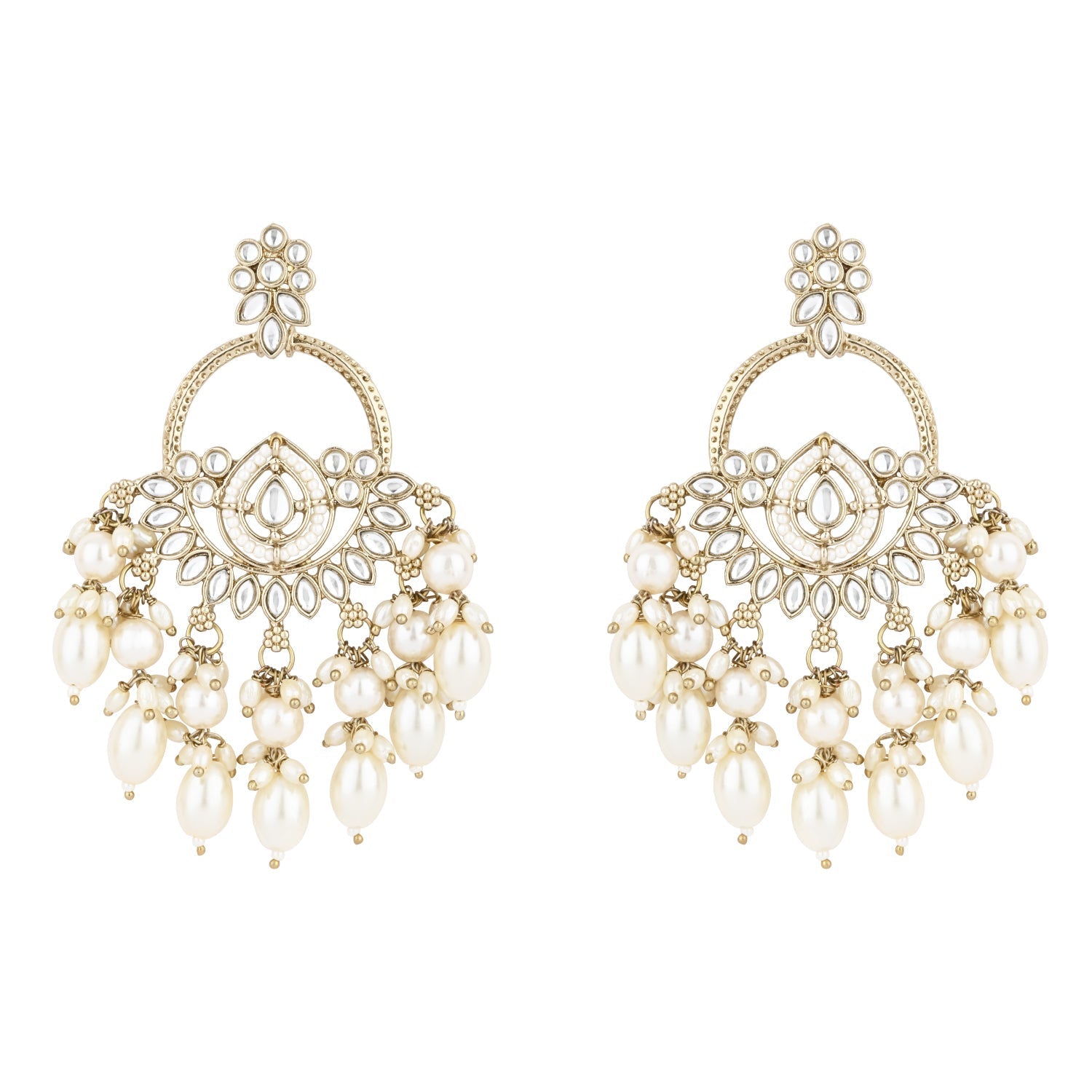 Gold plated traditional white kundan studded pearl handcrafted dangle chandbali earrings are a type of ethnic jewelry that is intricately designed and crafted to be worn on the ears. The earrings feature a gold-plated metal base that is embellished with white kundan stones and pearls. The pearls used in the earrings add a touch of elegance and sophistication to the overall design. These earrings are perfect for special occasions such as weddings, festivals, or formal events, where they can be worn to complement traditional Indian outfits such as sarees, lehengas, or salwar kameez. They can also be paired with western outfits for a fusion look. To maintain their shine and luster, it is recommended to store them in a dry and cool place when not in use and to avoid exposing them to moisture or chemicals such as perfumes or hairspray.