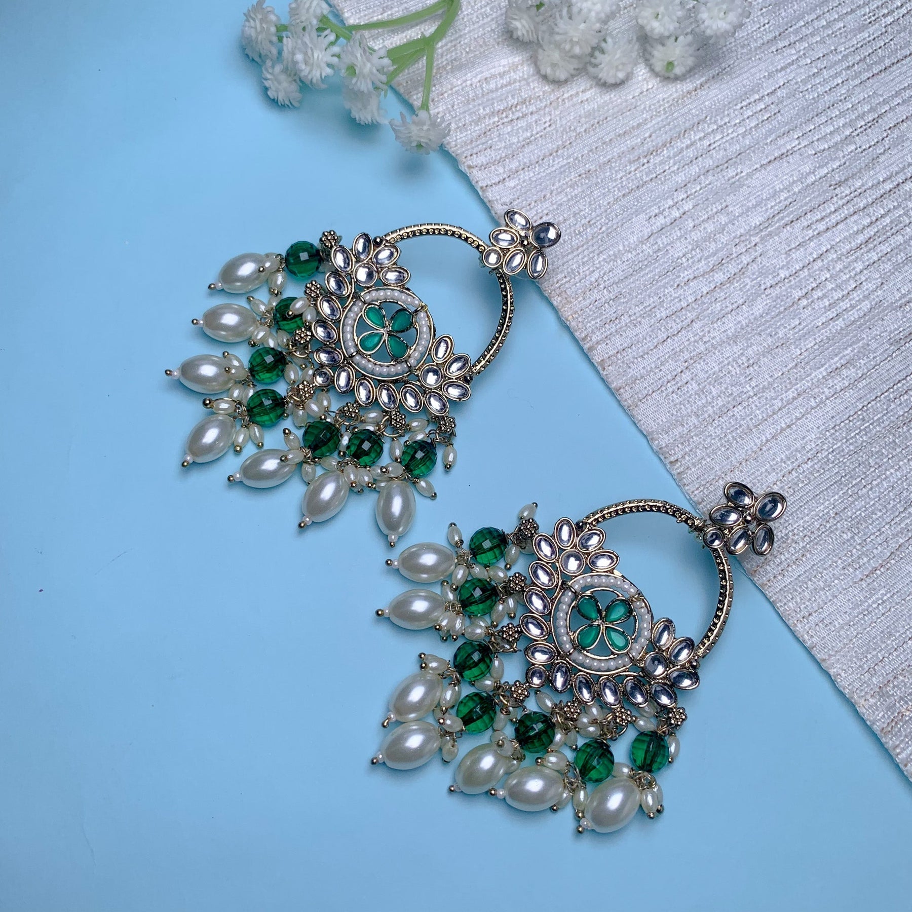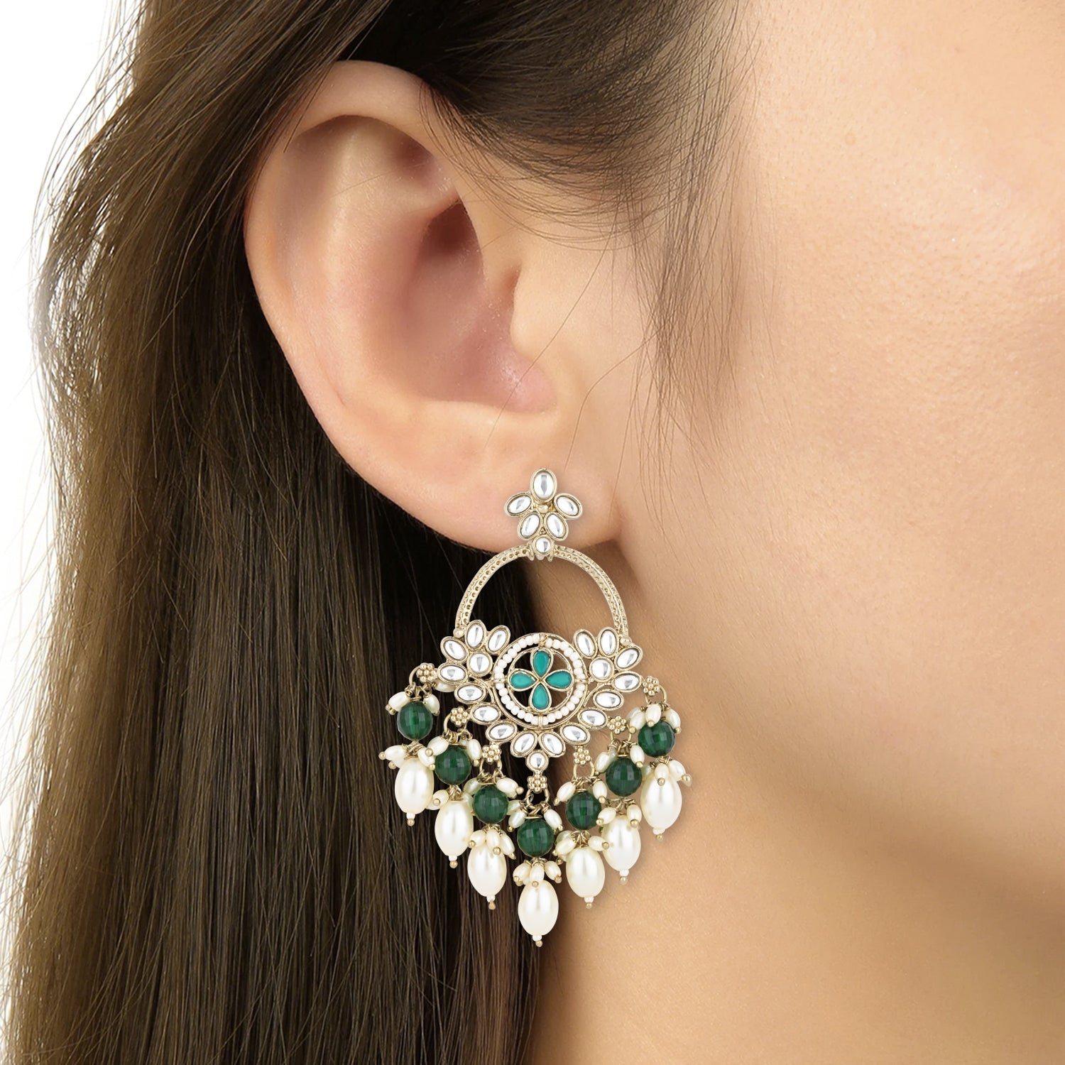 Gold plated traditional white kundan studded pearl handcrafted dangle chandbali earrings are a type of ethnic jewelry that is intricately designed and crafted to be worn on the ears. The earrings feature a gold-plated metal base that is embellished with white kundan stones and pearls. The pearls used in the earrings add a touch of elegance and sophistication to the overall design. These earrings are perfect for special occasions such as weddings, festivals, or formal events, where they can be worn to complement traditional Indian outfits such as sarees, lehengas, or salwar kameez. They can also be paired with western outfits for a fusion look. To maintain their shine and luster, it is recommended to store them in a dry and cool place when not in use and to avoid exposing them to moisture or chemicals such as perfumes or hairspray.