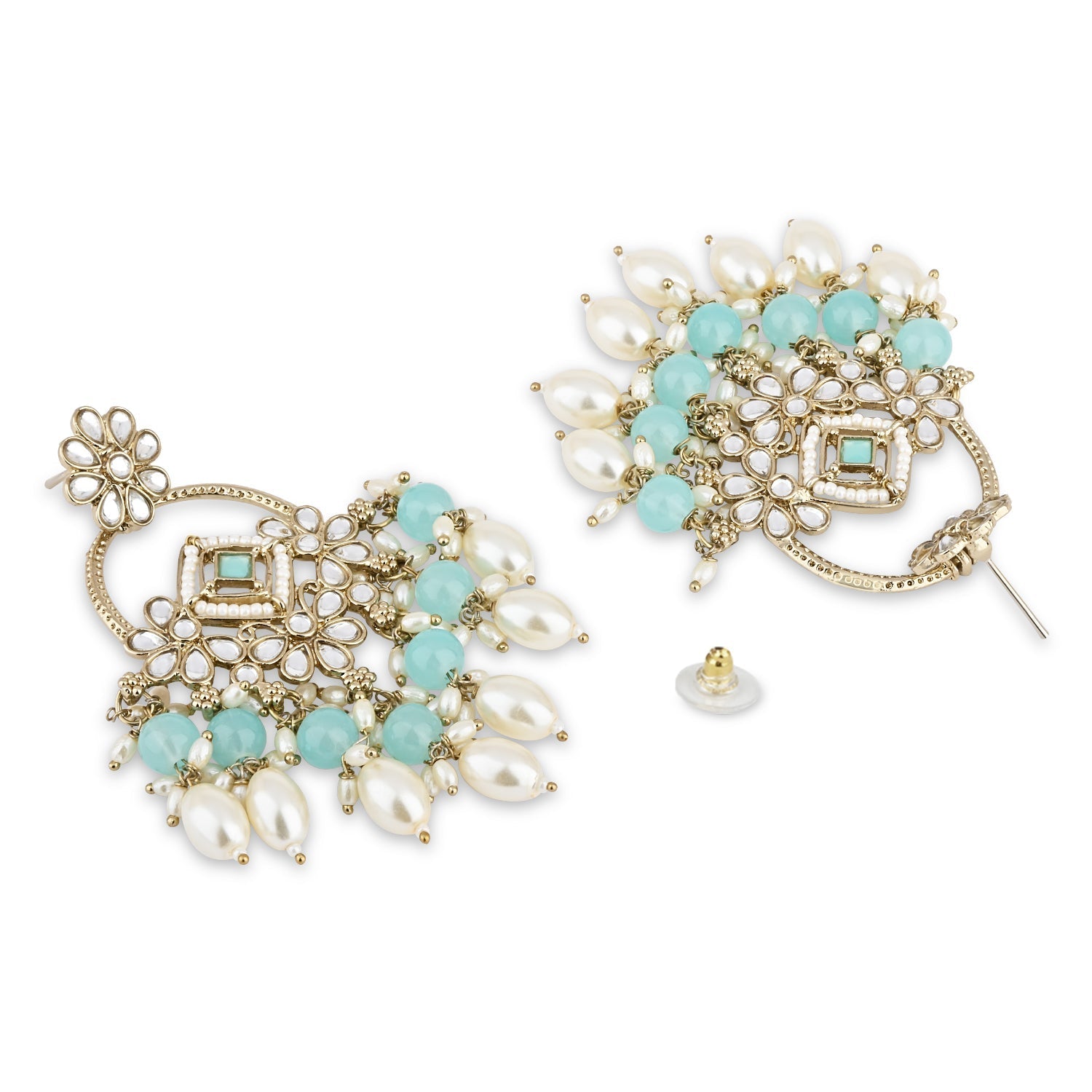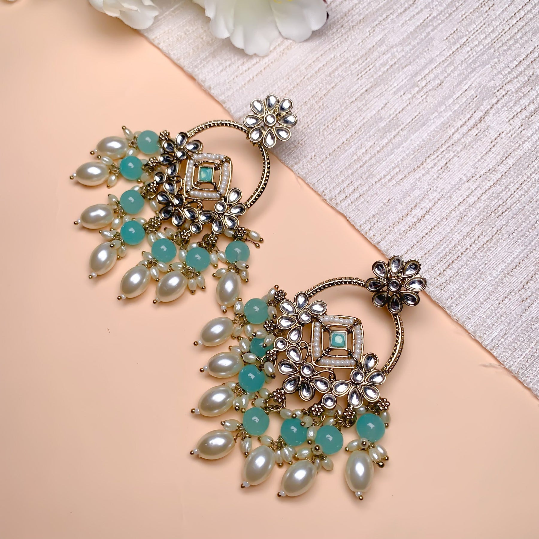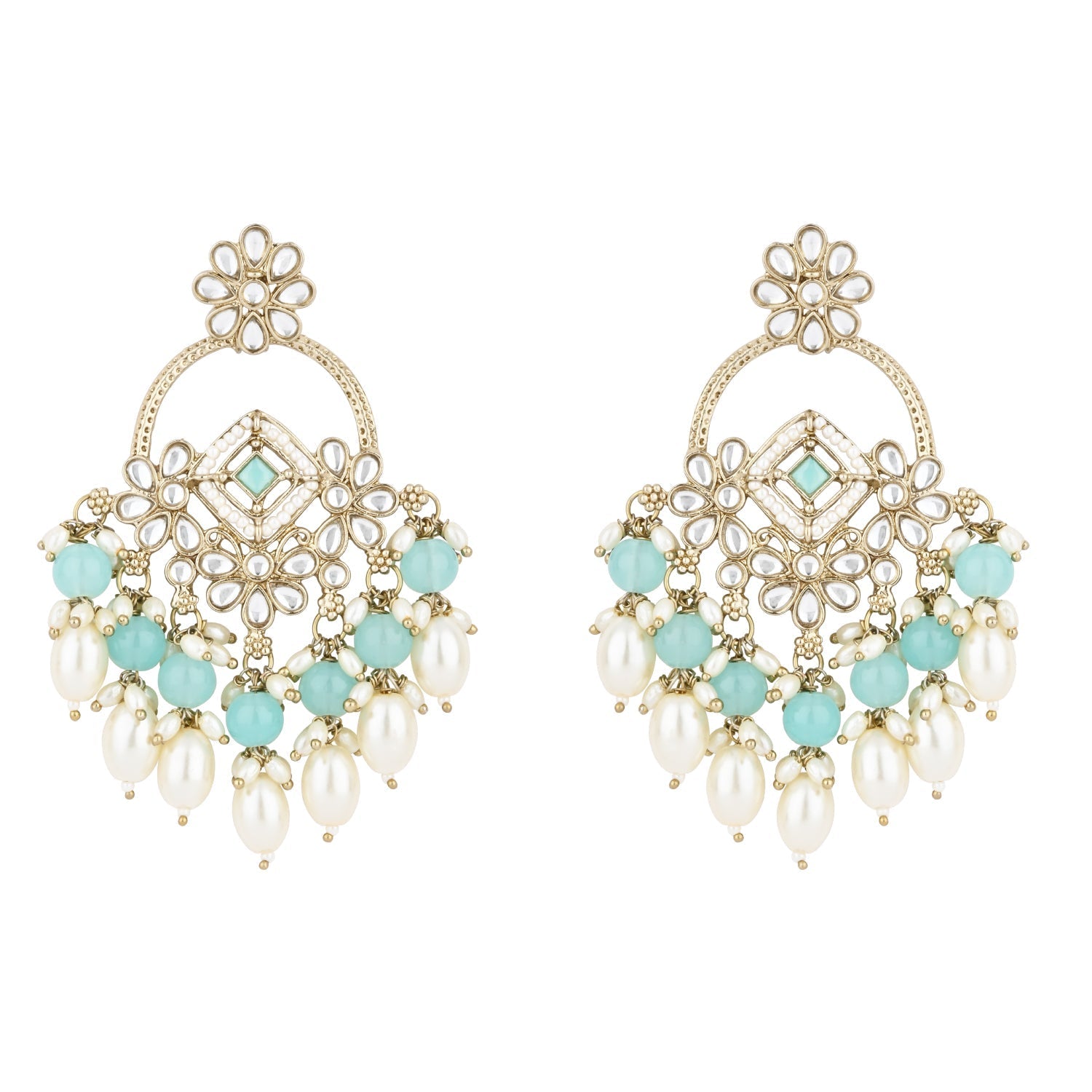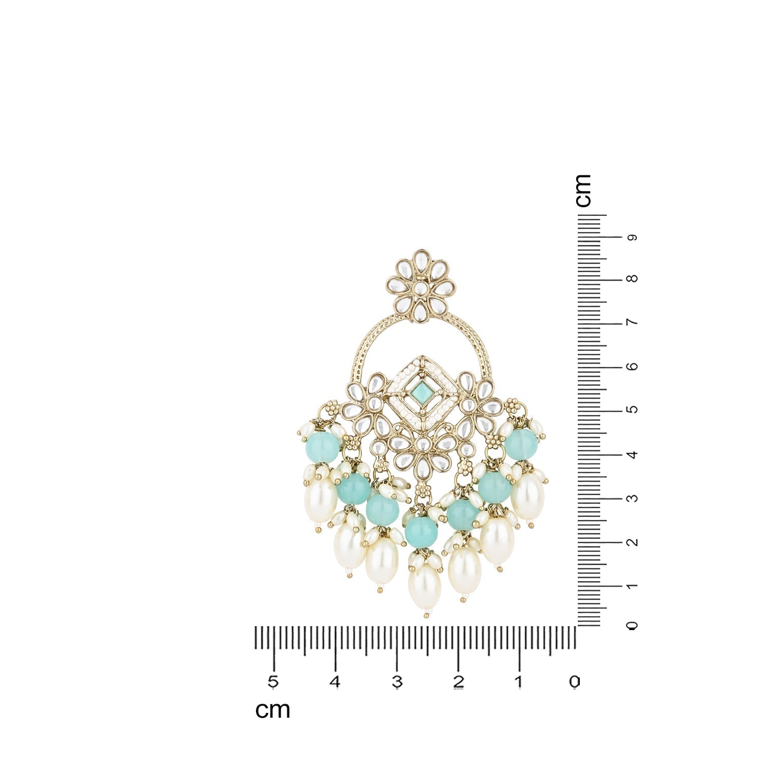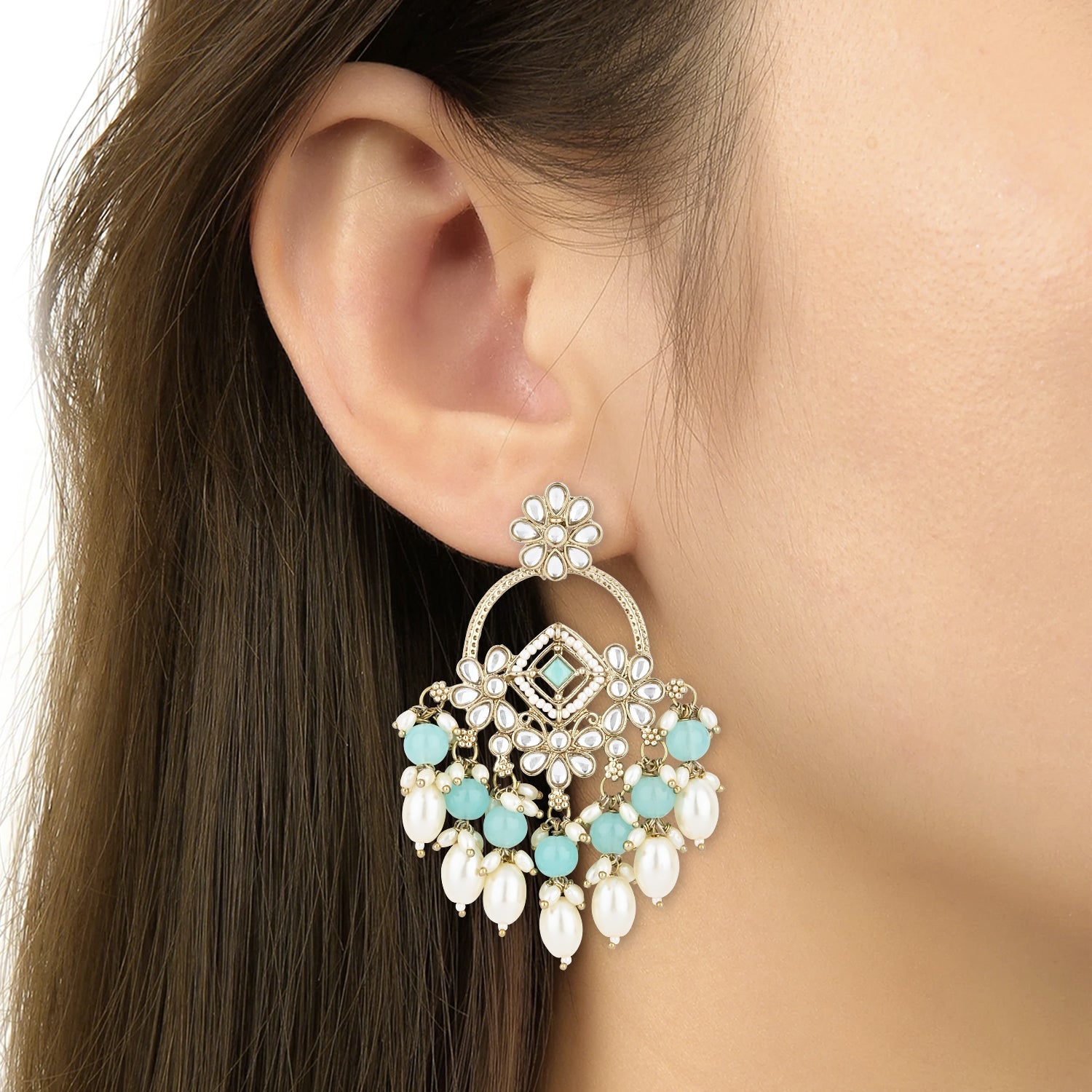 Gold plated traditional white kundan studded pearl handcrafted dangle chandbali earrings are a type of ethnic jewelry that is intricately designed and crafted to be worn on the ears. The earrings feature a gold-plated metal base that is embellished with white kundan stones and pearls. The pearls used in the earrings add a touch of elegance and sophistication to the overall design. These earrings are perfect for special occasions such as weddings, festivals, or formal events, where they can be worn to complement traditional Indian outfits such as sarees, lehengas, or salwar kameez. They can also be paired with western outfits for a fusion look. To maintain their shine and luster, it is recommended to store them in a dry and cool place when not in use and to avoid exposing them to moisture or chemicals such as perfumes or hairspray.