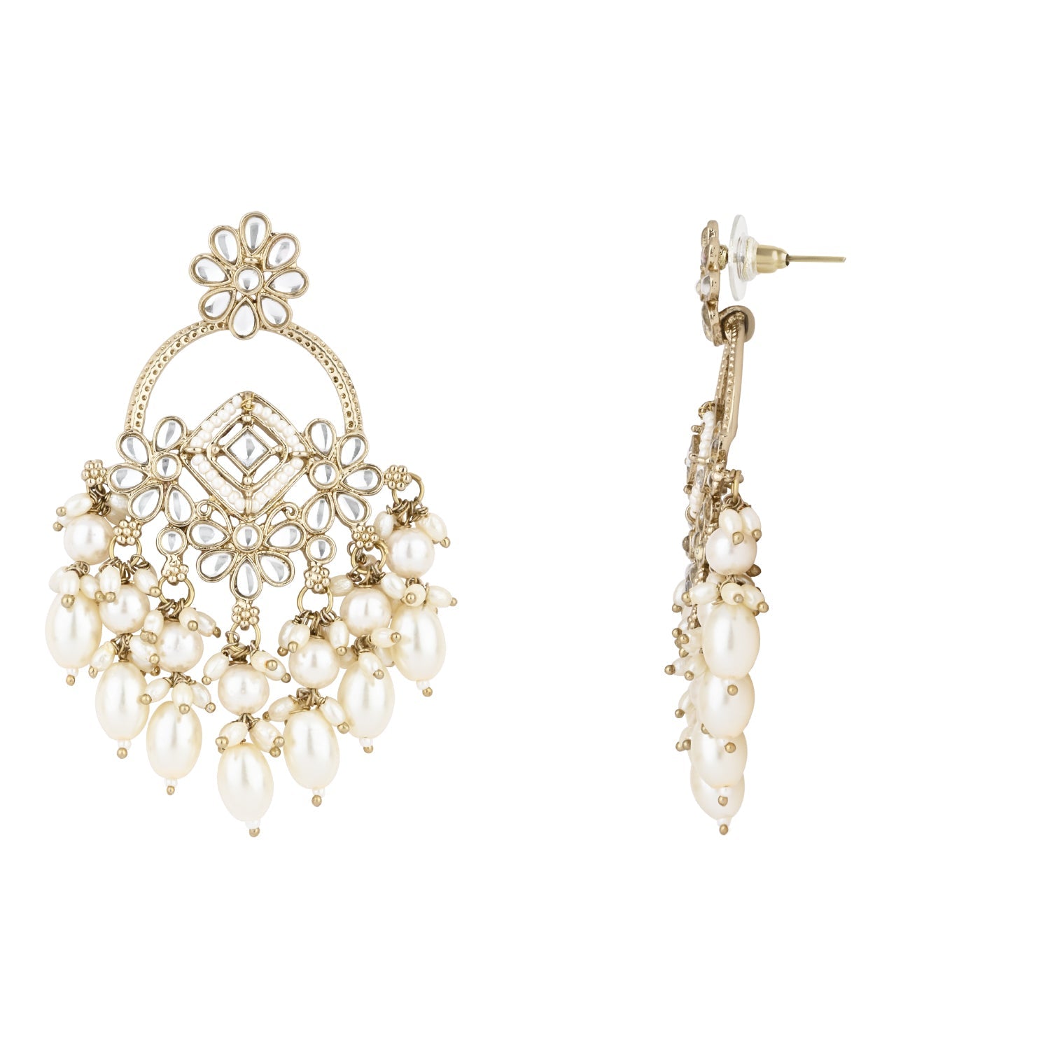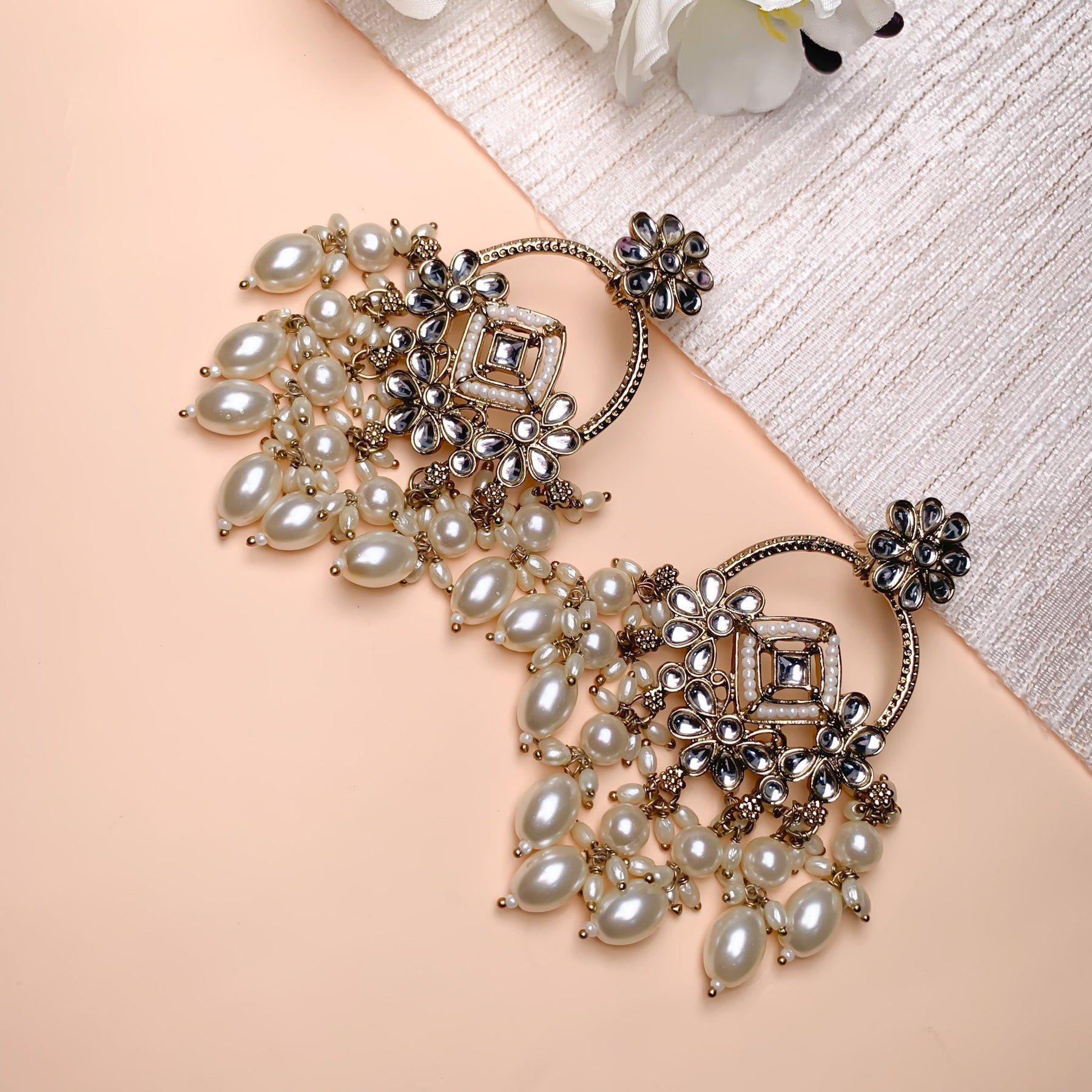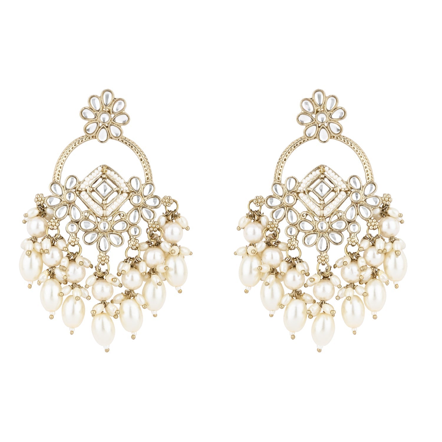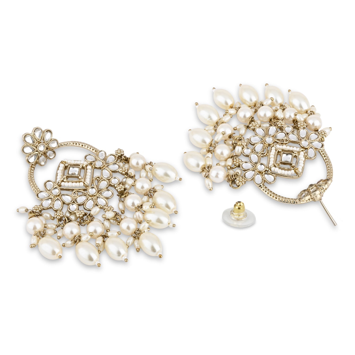 Gold plated traditional white kundan studded pearl handcrafted dangle chandbali earrings are a type of ethnic jewelry that is intricately designed and crafted to be worn on the ears. The earrings feature a gold-plated metal base that is embellished with white kundan stones and pearls. The pearls used in the earrings add a touch of elegance and sophistication to the overall design. These earrings are perfect for special occasions such as weddings, festivals, or formal events, where they can be worn to complement traditional Indian outfits such as sarees, lehengas, or salwar kameez. They can also be paired with western outfits for a fusion look. To maintain their shine and luster, it is recommended to store them in a dry and cool place when not in use and to avoid exposing them to moisture or chemicals such as perfumes or hairspray.