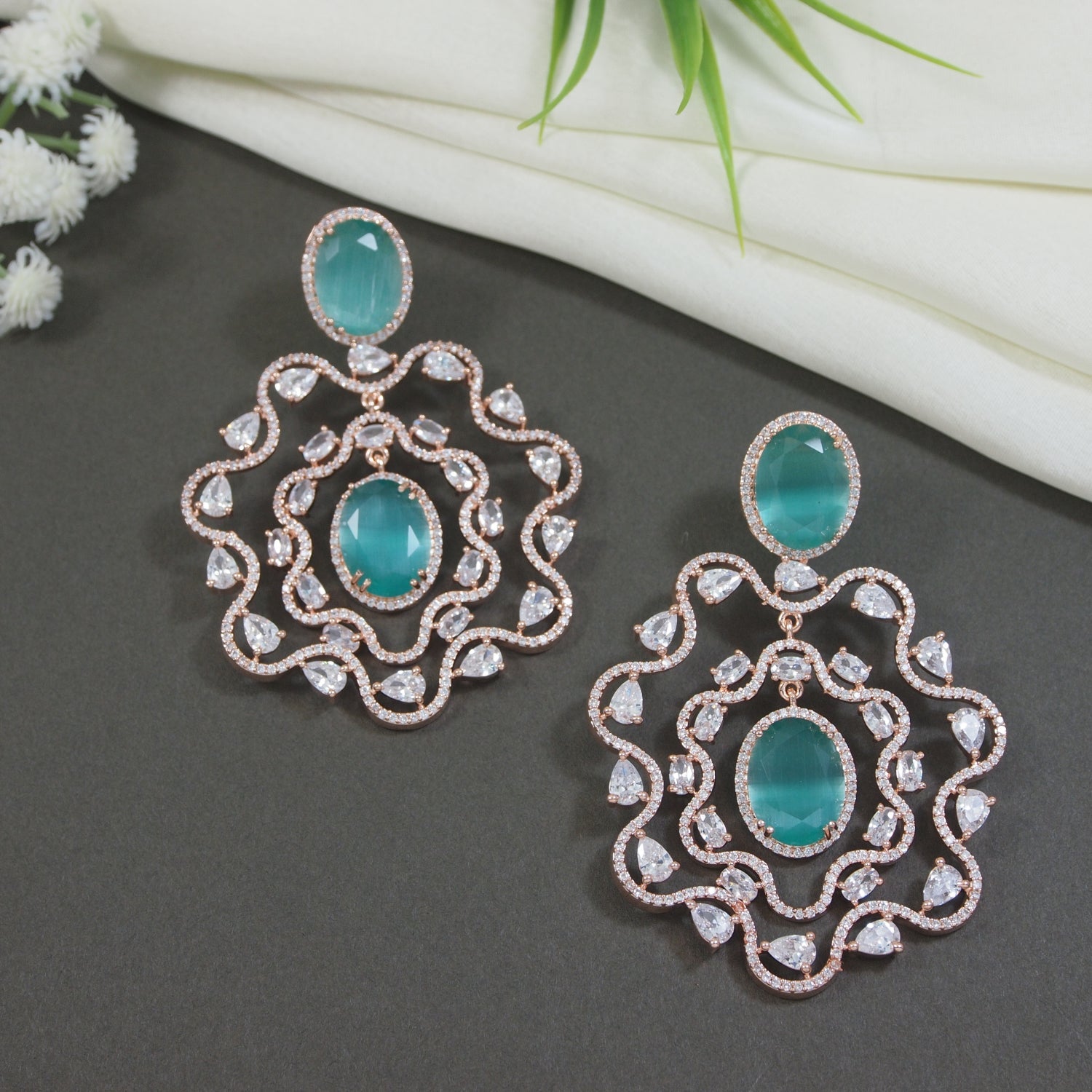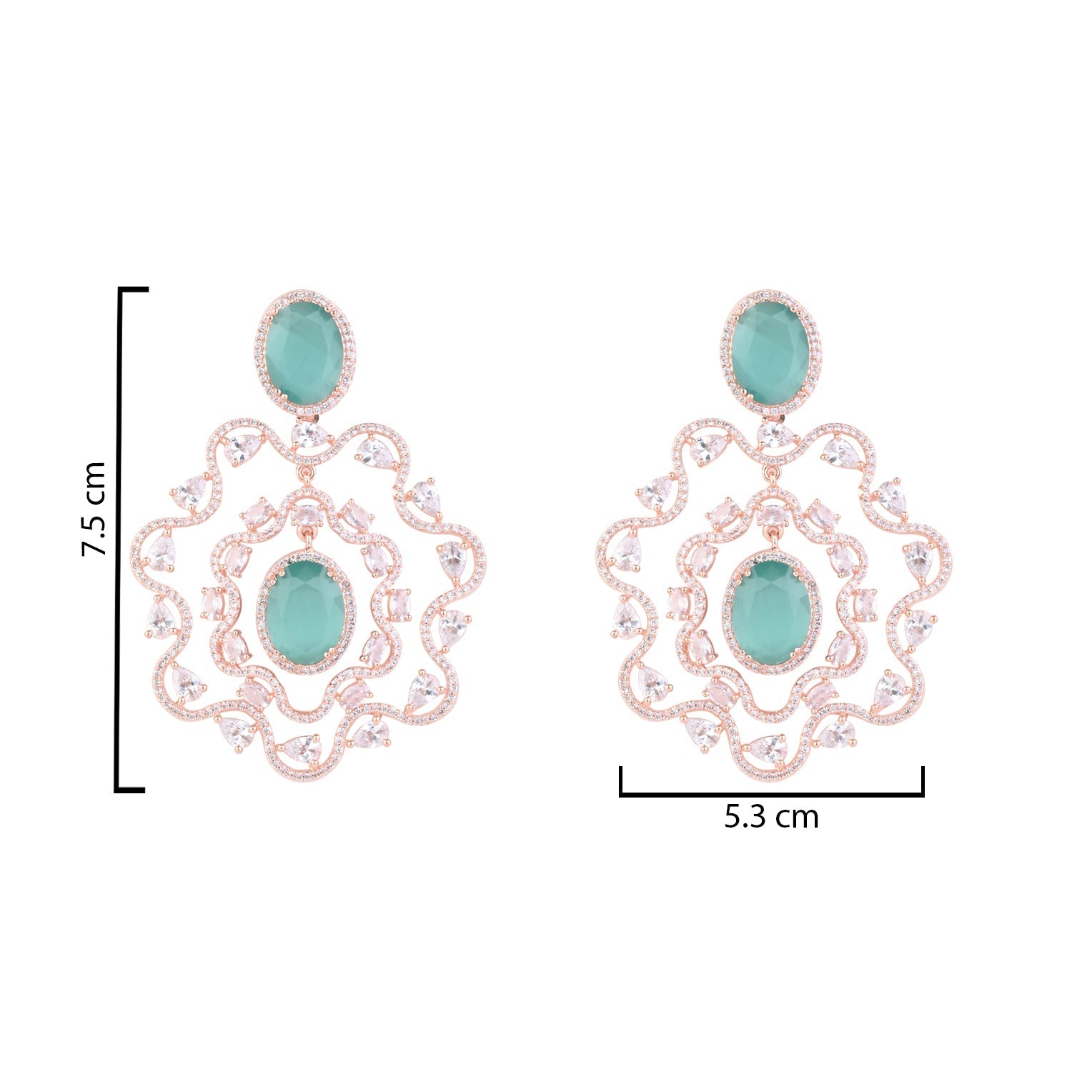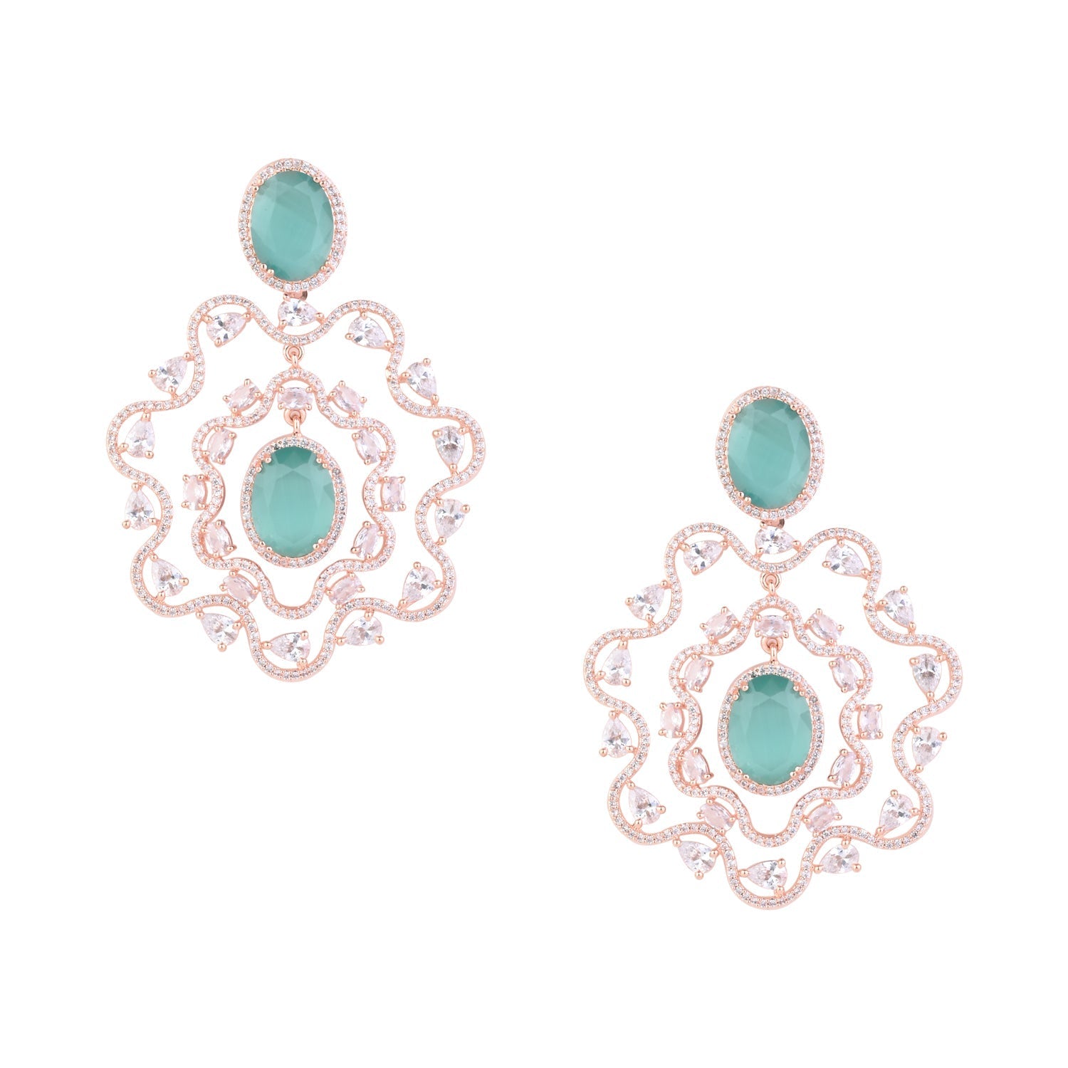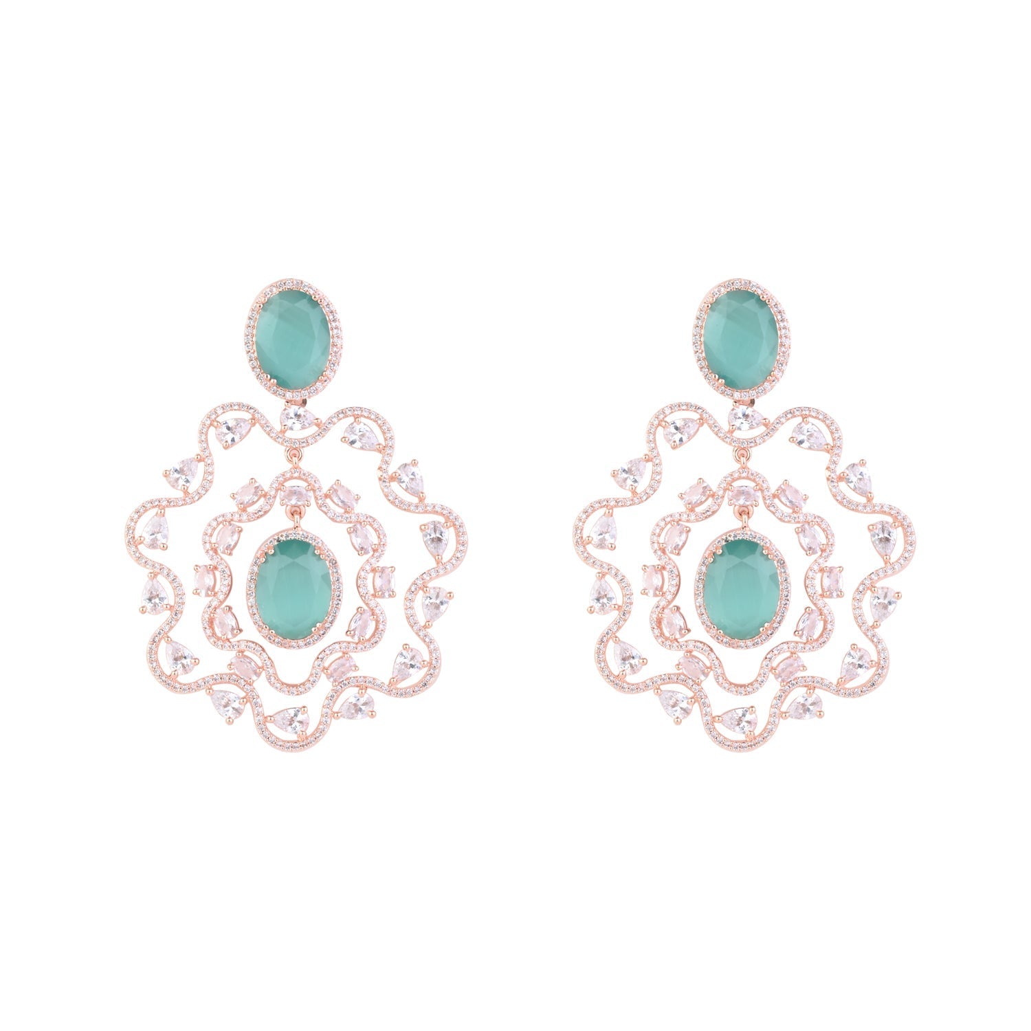 These Earrings Are Intricately Designed With A Delicate Filigree Pattern. The Center Features Oval-Shaped Mint Stones Surrounded By A Rose-Gold-Toned Metal. Embellished With Sparkling Clear Crystals, The Design Radiates Elegance And Sophistication, Making Them Perfect For Special Occasions Or Formal Events. Their Chandelier-Style Structure Adds A Bold Yet Feminine Touch.