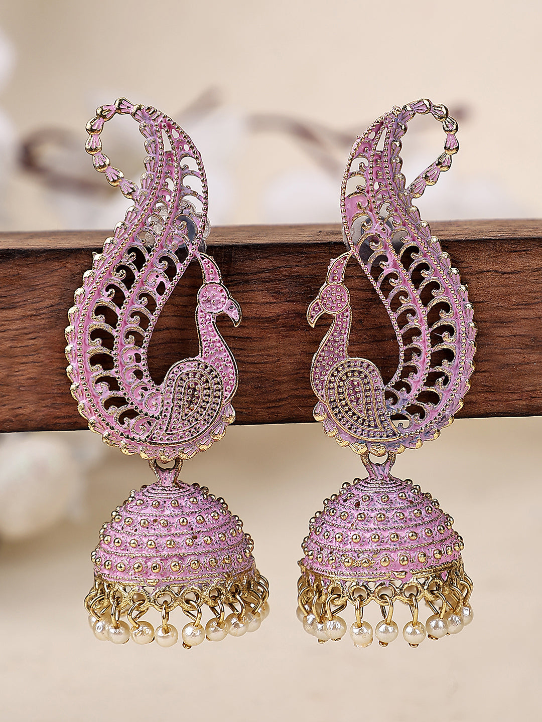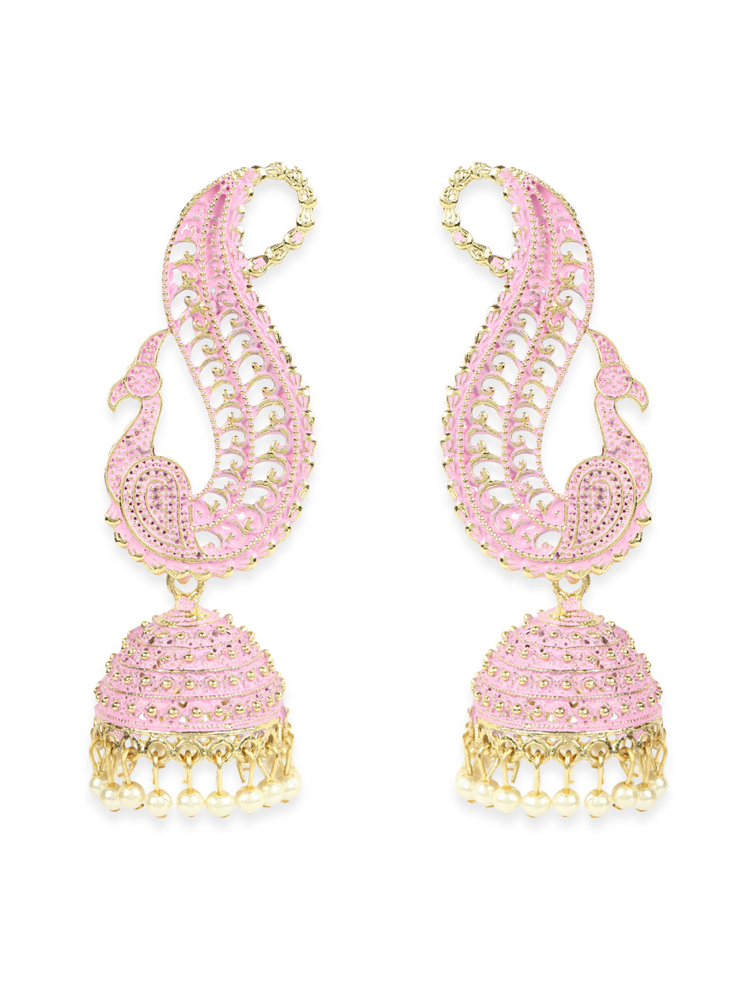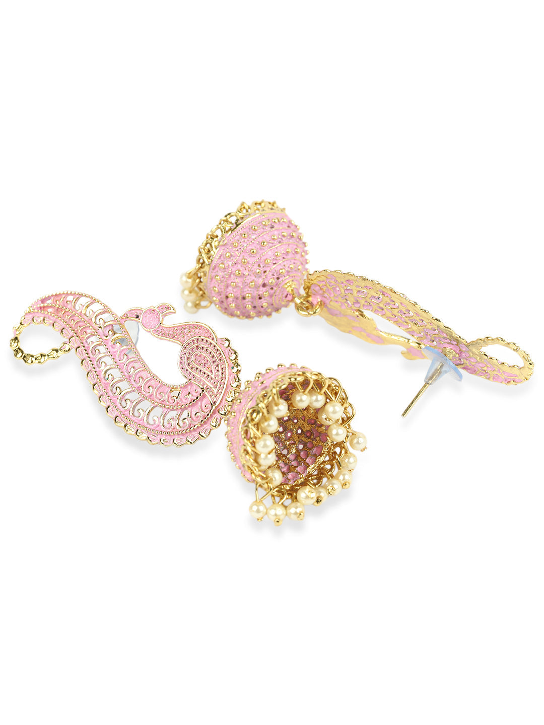 Gold Plated Exclusive Traditional Pink Jhumka Earring, Secured With Post And Back Closure, This Pair Can Be Matched With Dark Wash Jeans, A Beautiful Top, And Patent Pumps For A Stellar Brunch Outfit.