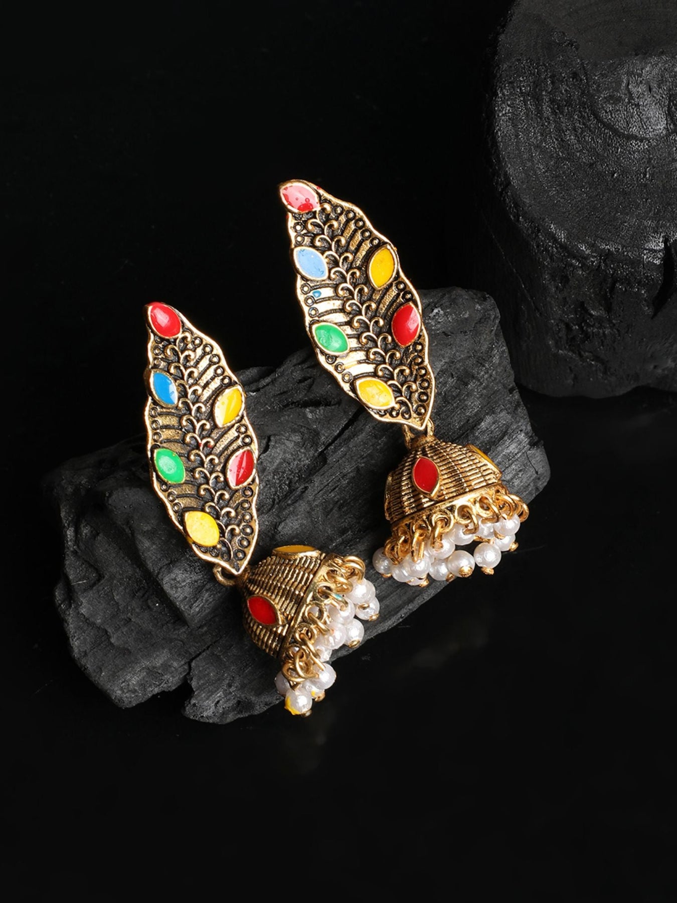 Traditional Gold Plated Party Wear Antique Multicolour Jhumka Earring, Secured With Post And Back Closure, This Pair Can Be Matched With Dark Wash Jeans, A Beautiful Top, And Patent Pumps For A Stellar Brunch Outfit.
