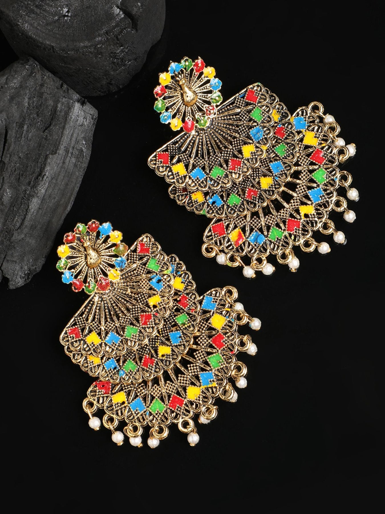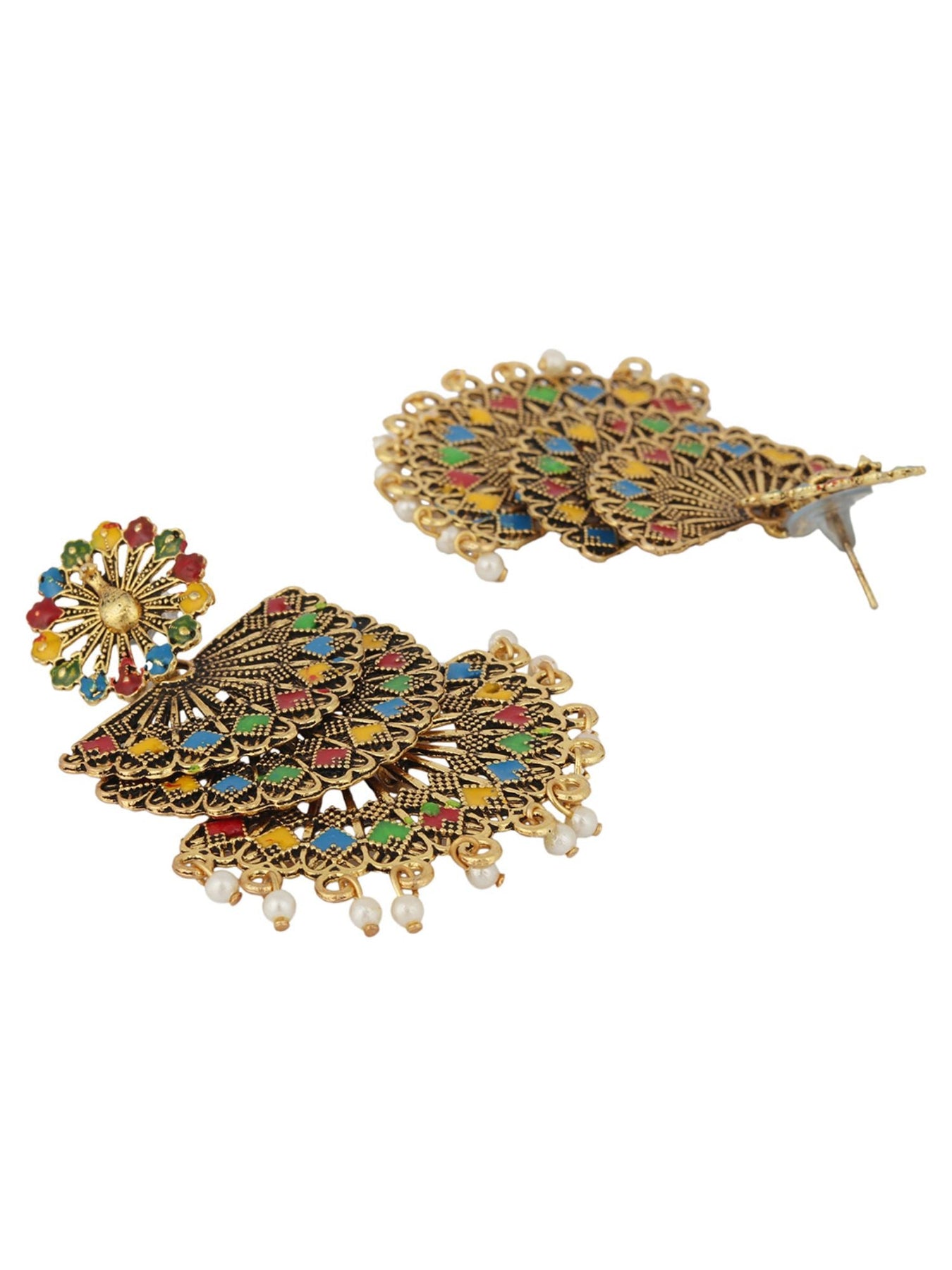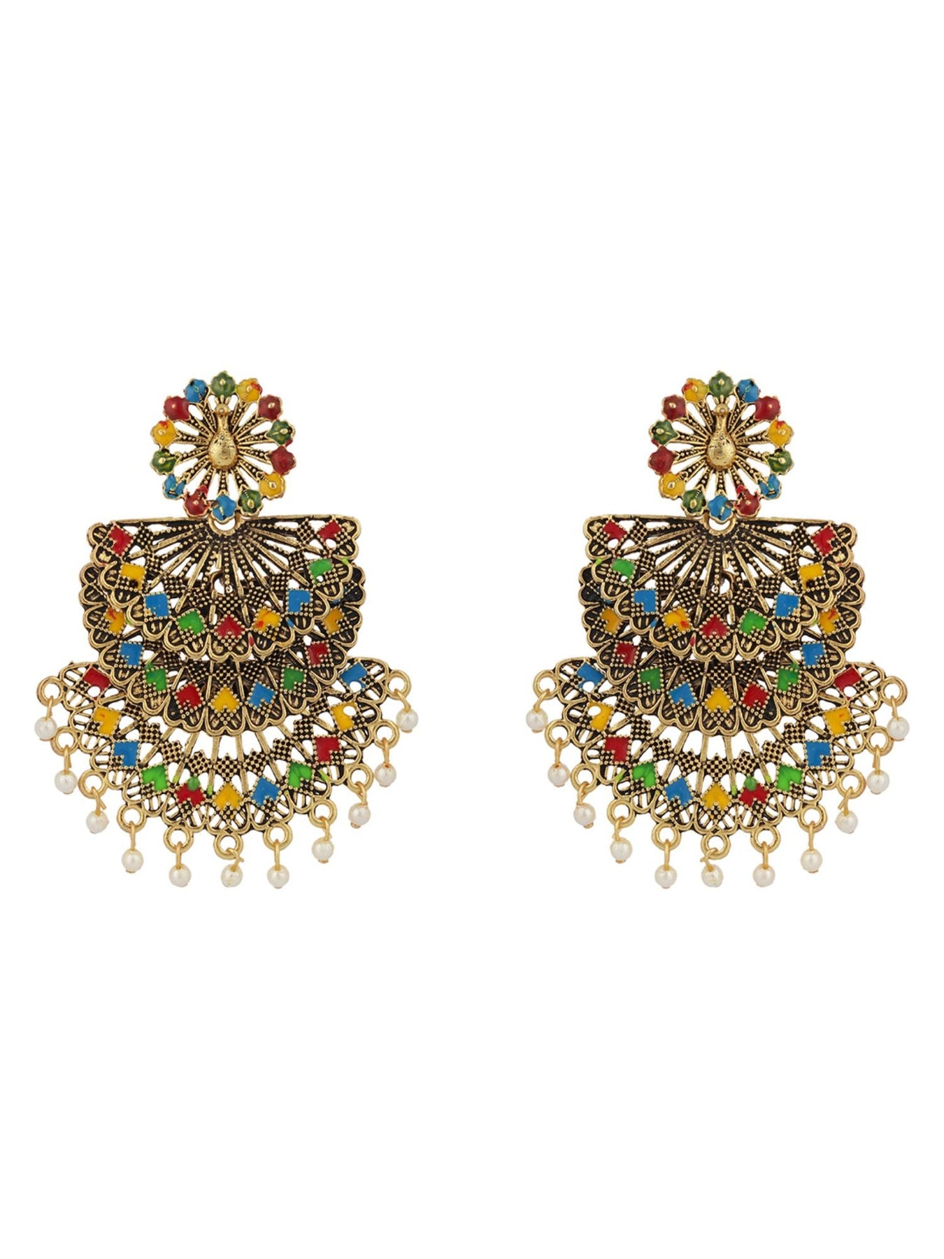 Traditional Gold Plated Multicolour Layered Partywear Earring, Secured With Post And Back Closure, This Pair Can Be Matched With Dark Wash Jeans, A Beautiful Top, And Patent Pumps For A Stellar Brunch Outfit.