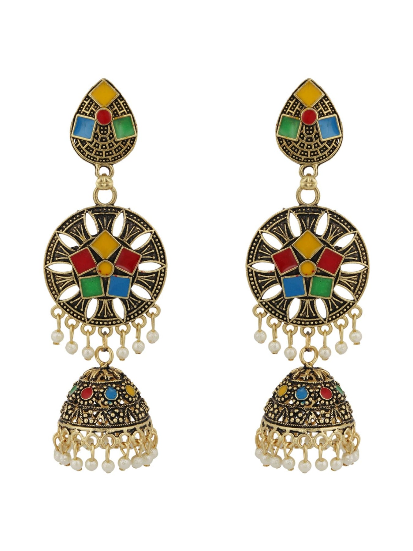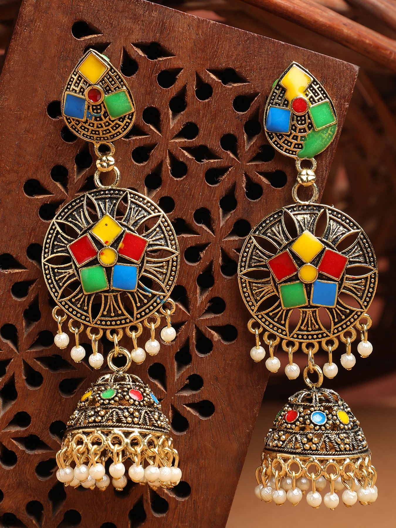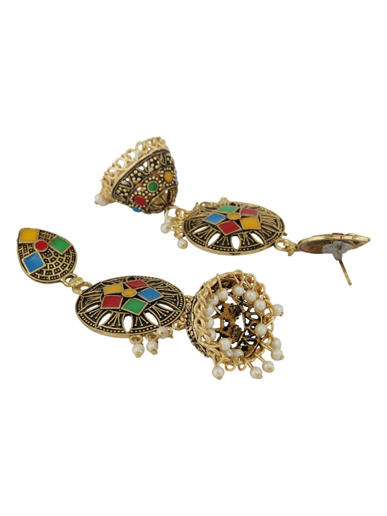 Traditional Gold Plated Party Wear Antique Multicolour Jhumka Earring, Secured With Post And Back Closure, This Pair Can Be Matched With Dark Wash Jeans, A Beautiful Top, And Patent Pumps For A Stellar Brunch Outfit.