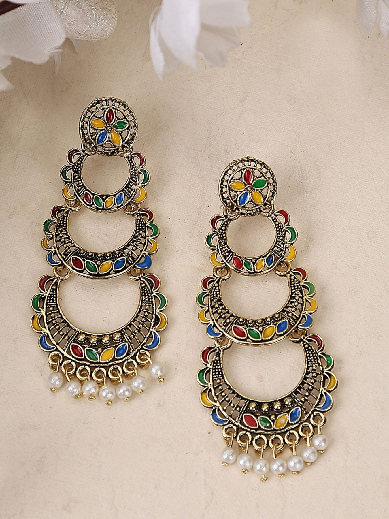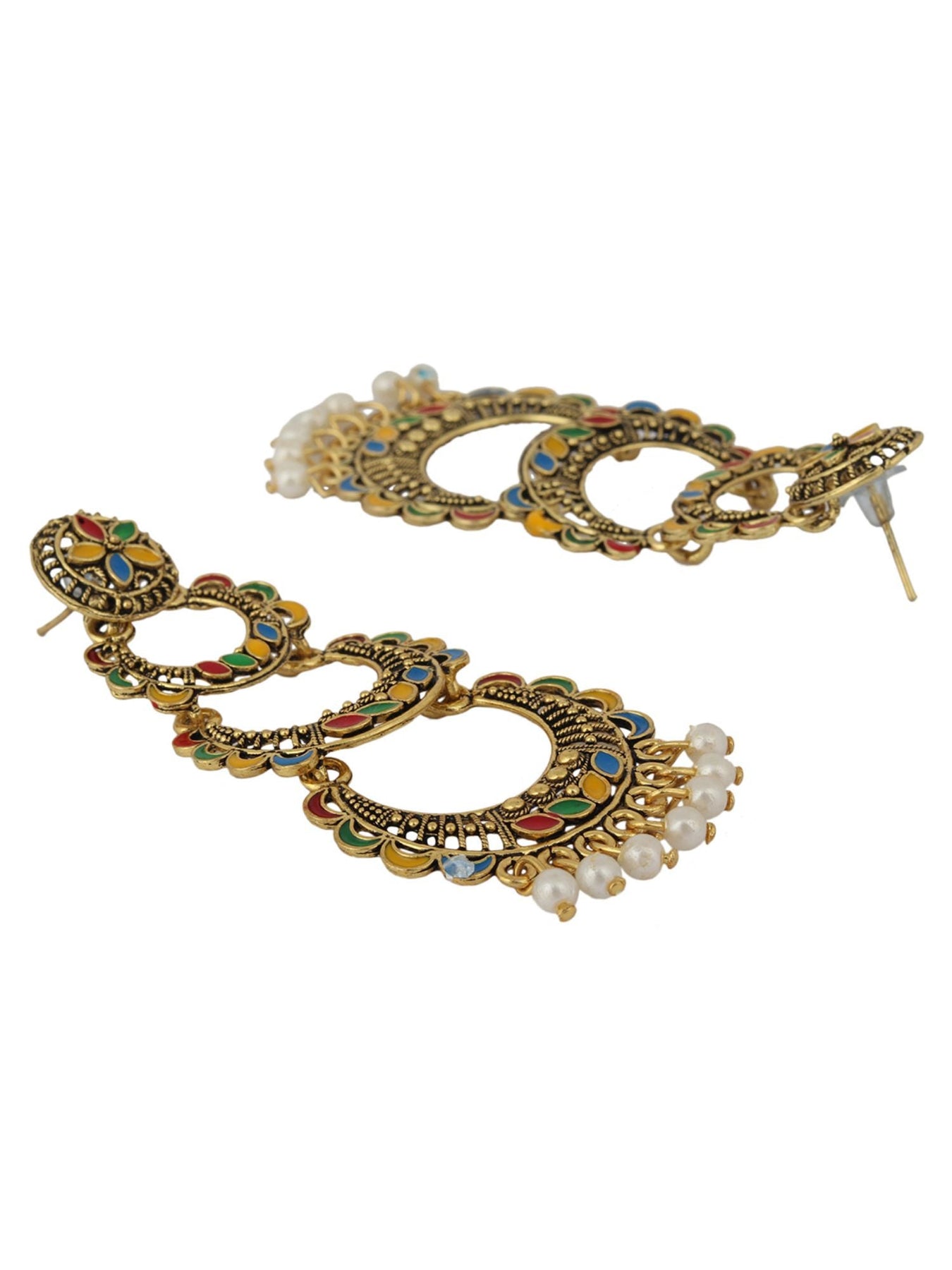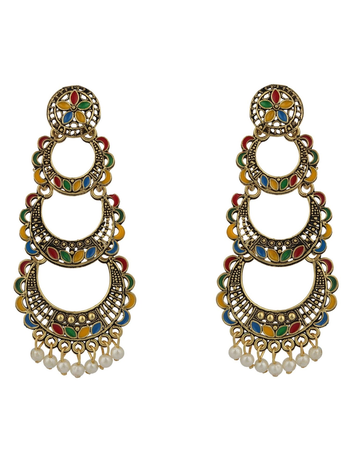 Traditional Gold Plated Multicolour Layered Partywear Earring, Secured With Post And Back Closure, This Pair Can Be Matched With Dark Wash Jeans, A Beautiful Top, And Patent Pumps For A Stellar Brunch Outfit.