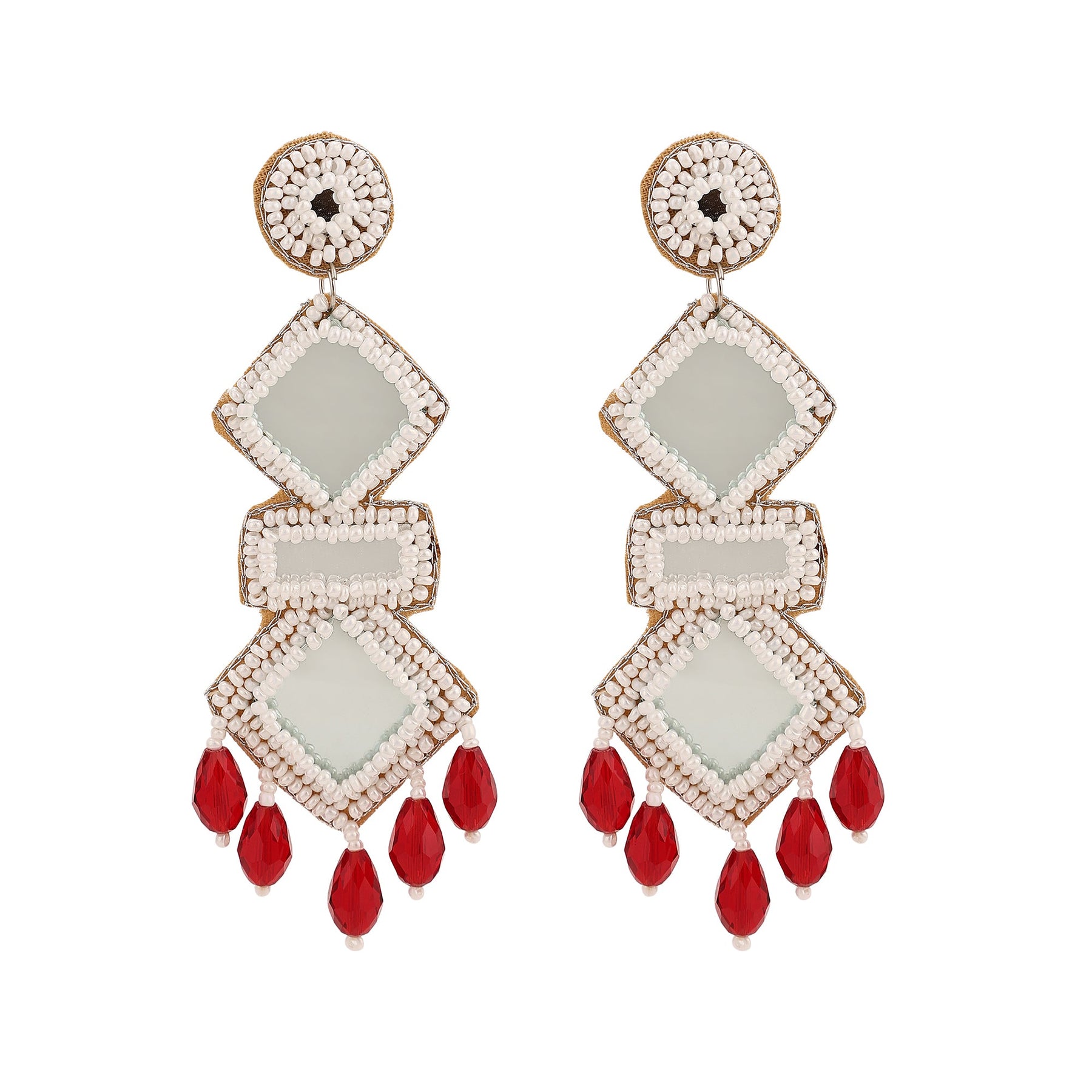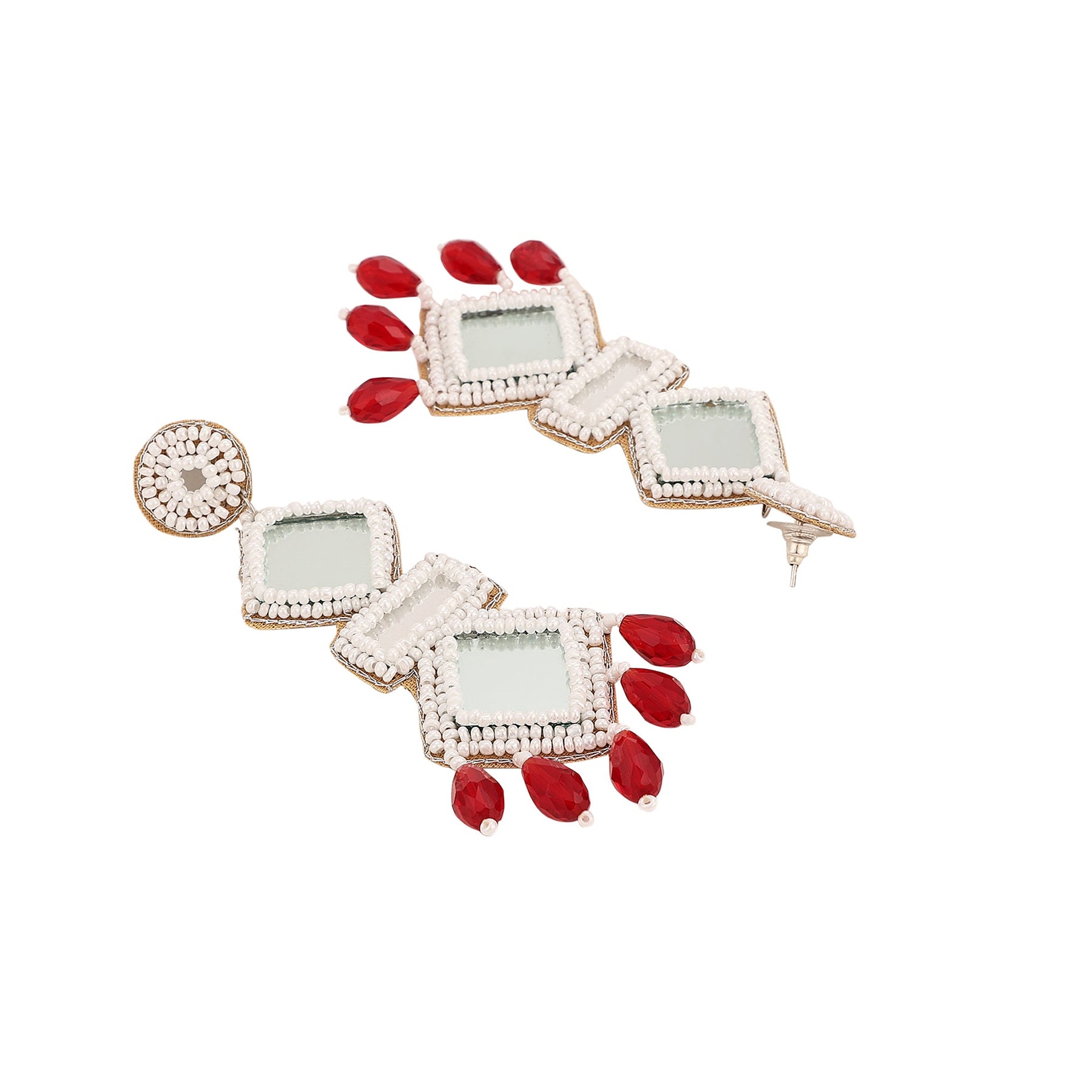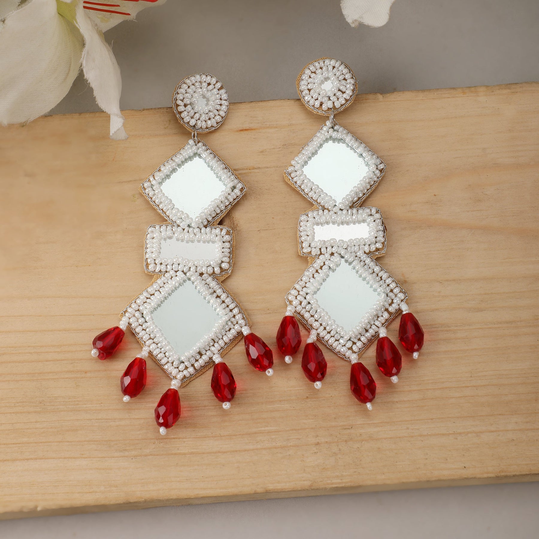 Mode Mania Fabric Base Mirror And Pearl Studded Dangle And Drop Earring.