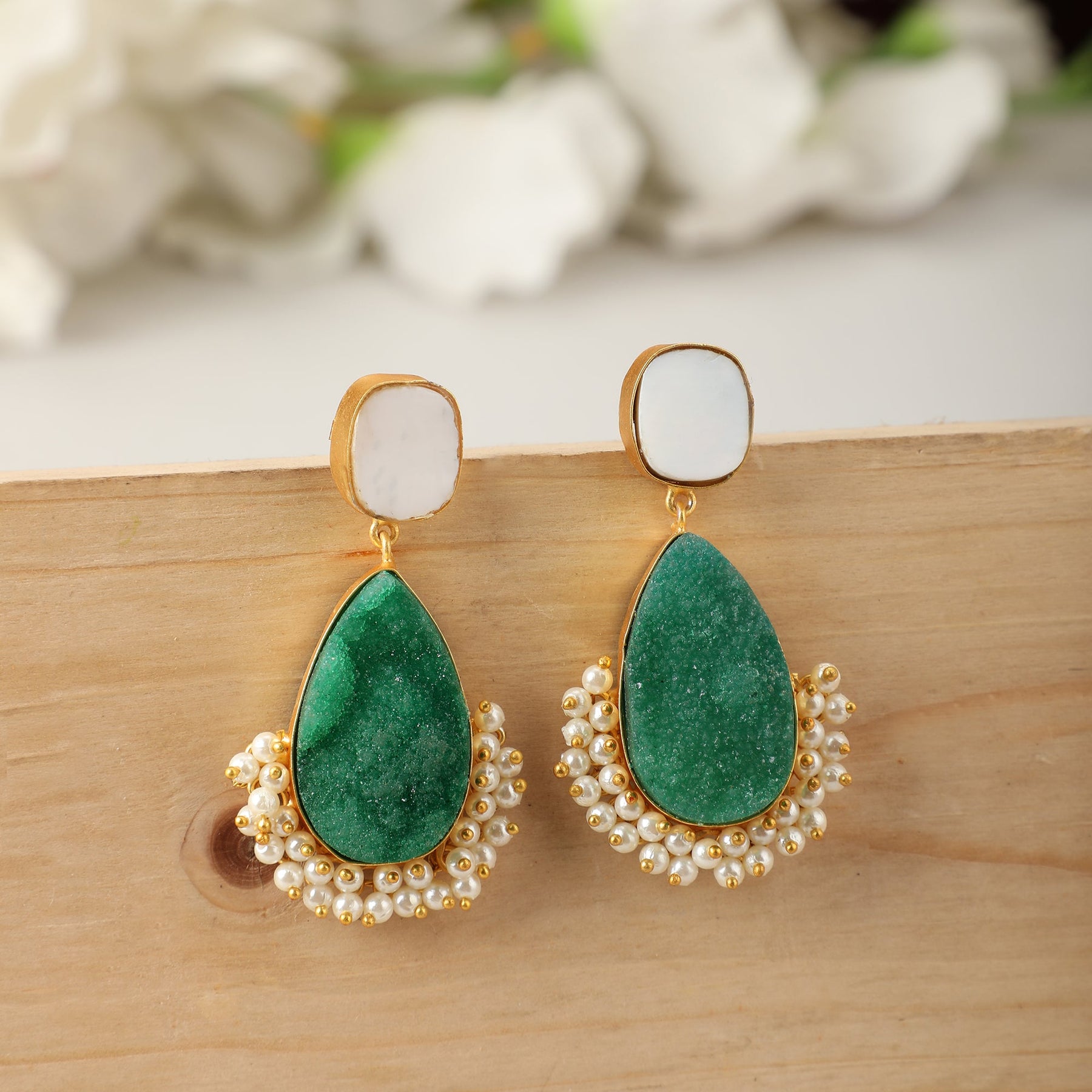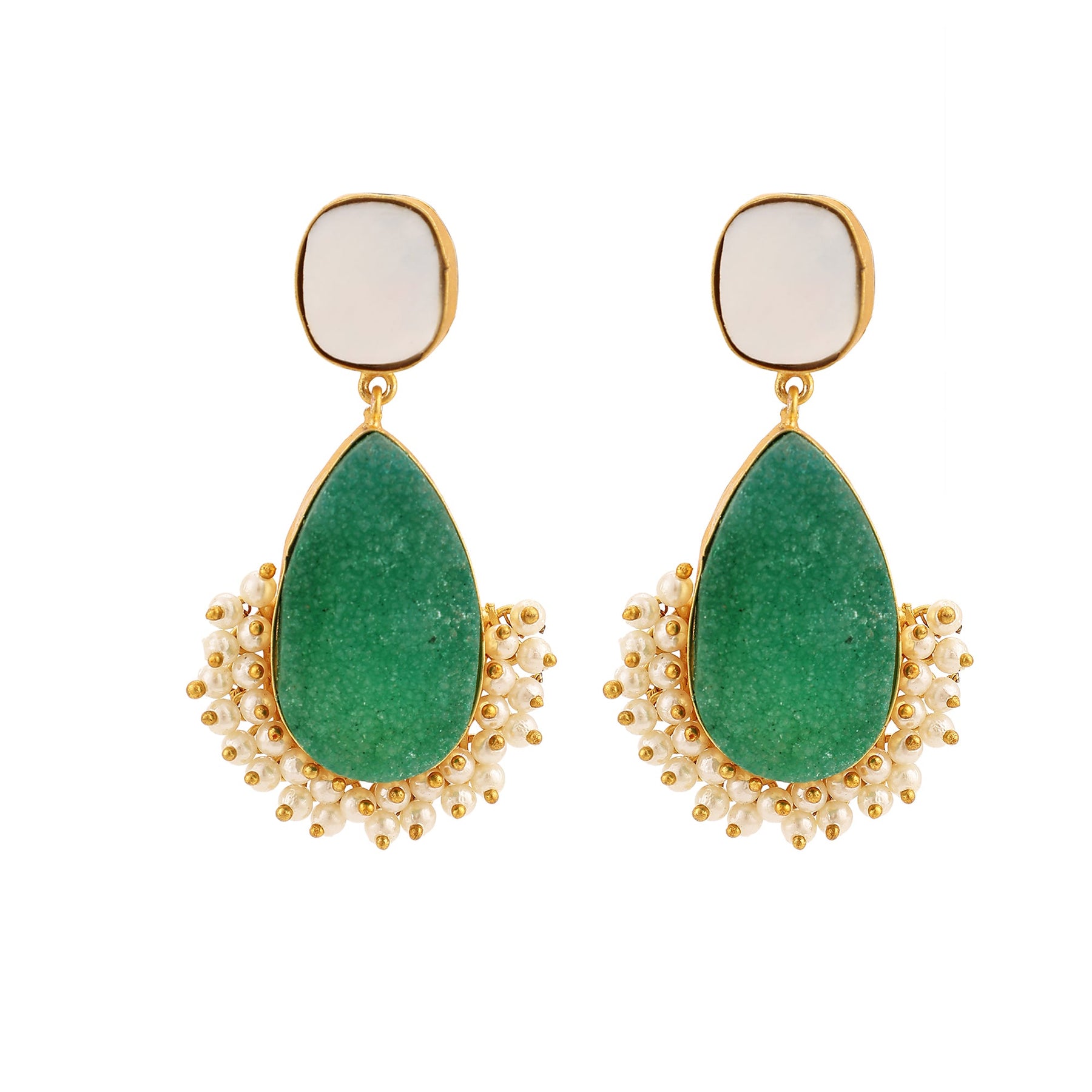Mode Mania Gold Plated Green Coloured Duzzy Stone And White Stone Studded Drop Earring For Girls And Women