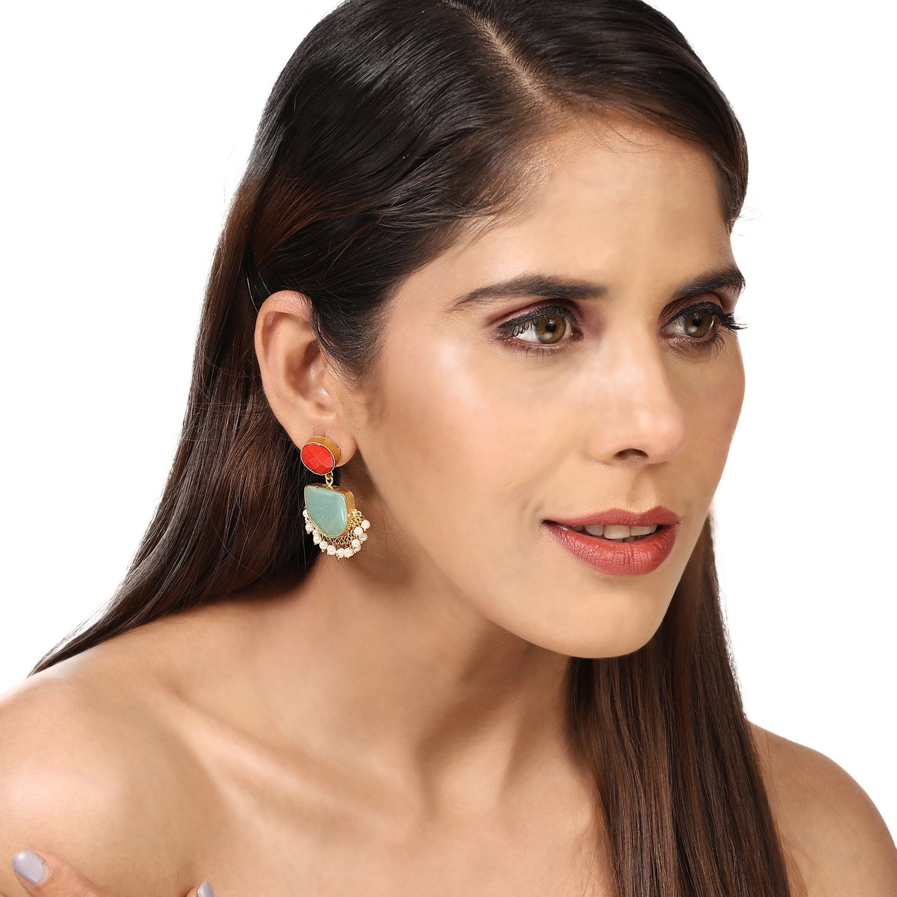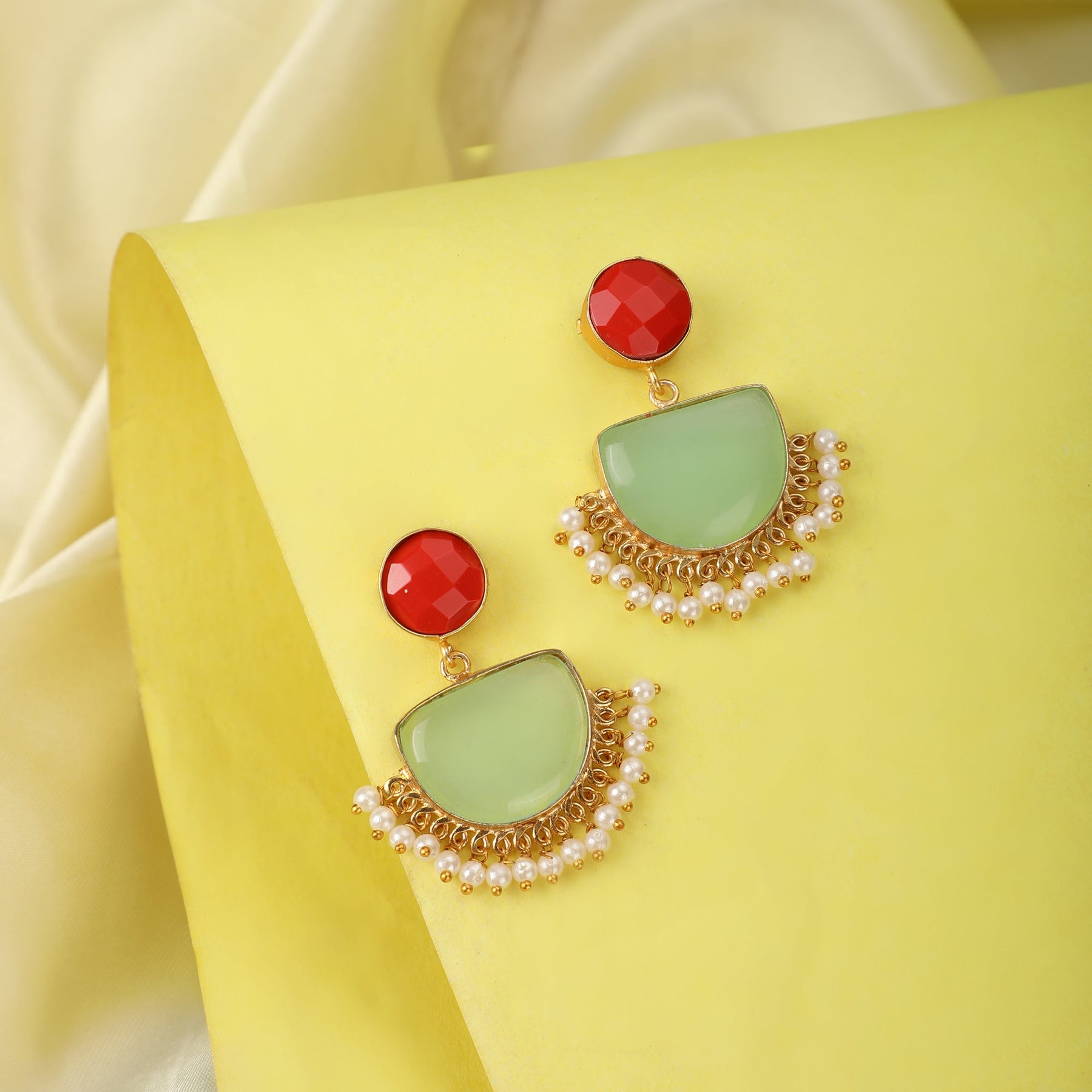 Mode Mania Statement Geometric Shaped Red And Green Glossy Stone Studded And Emebellished With Pearls