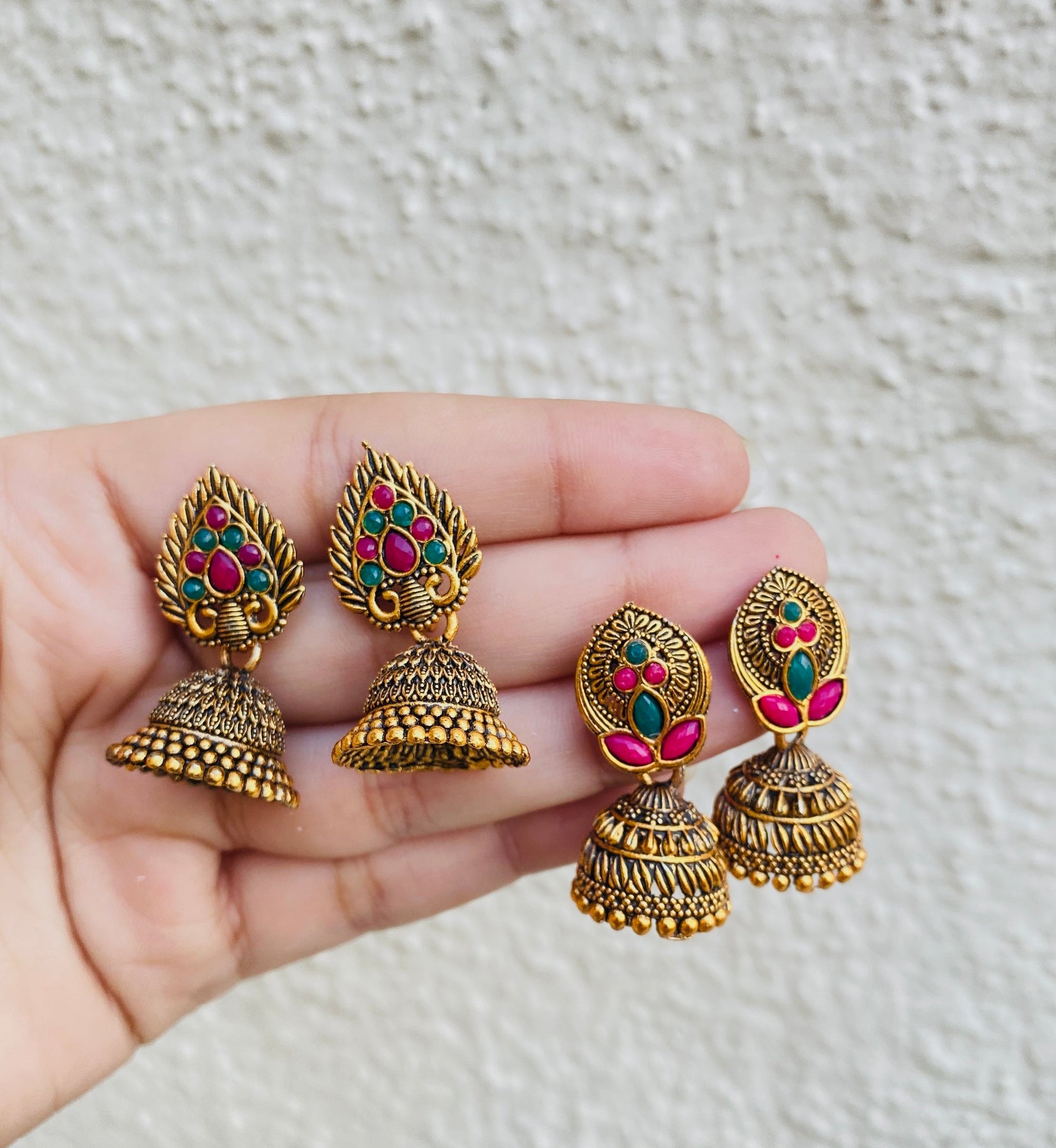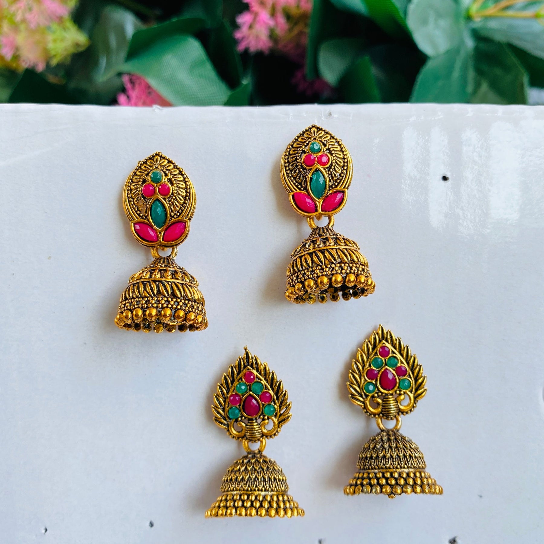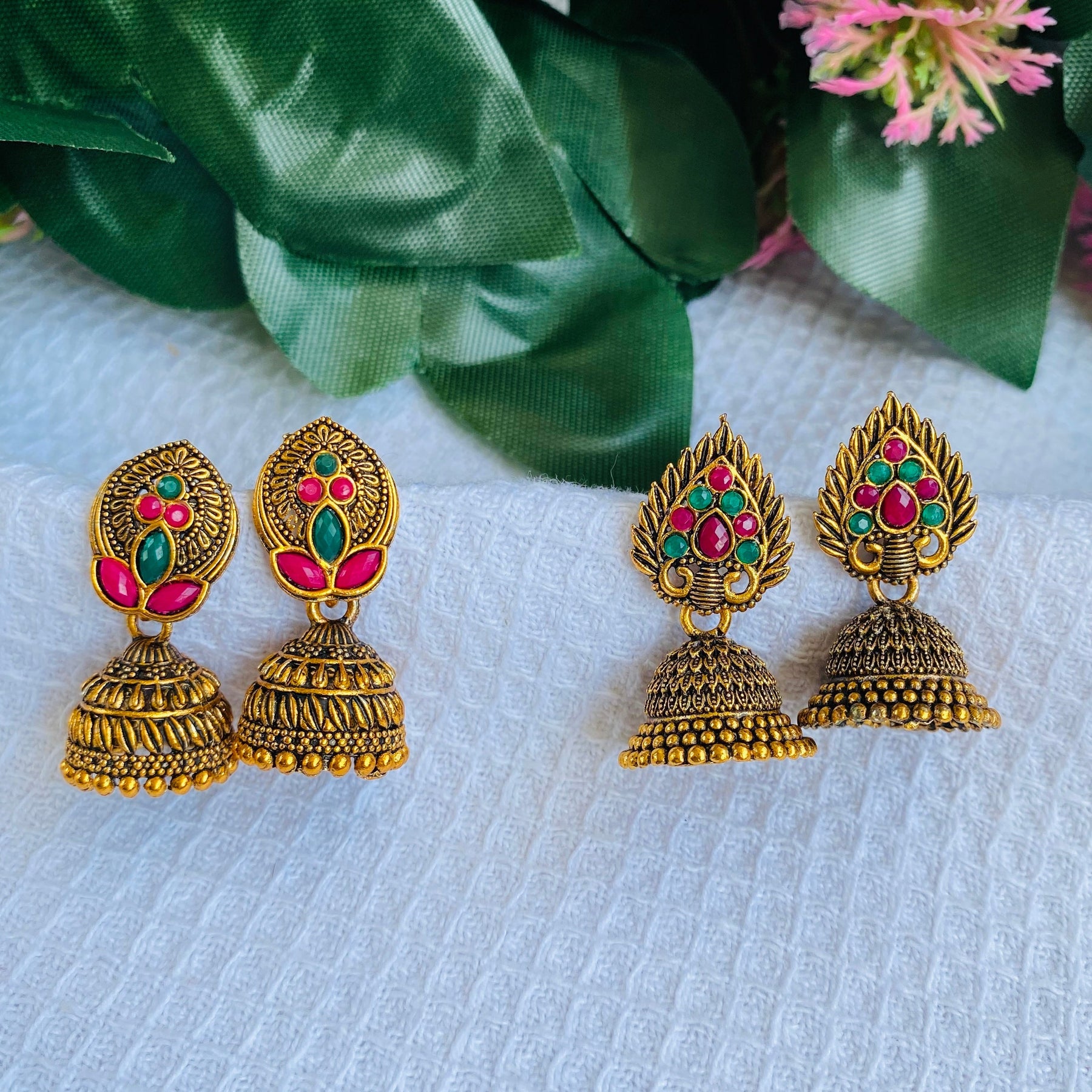 Elevate Your Ethnic Look With This Stunning Traditional Jhumka Earrings Set. Featuring Intricate Antique Gold Detailing, This Set Includes Earrings Adorned With Vibrant Pink And Green Stones. Designed With A Timeless Charm, These Jhumkas Perfectly Blend Tradition And Sophistication, Making Them Ideal For Weddings, Festive Occasions, And Cultural Celebrations. Lightweight Yet Eye-Catching
