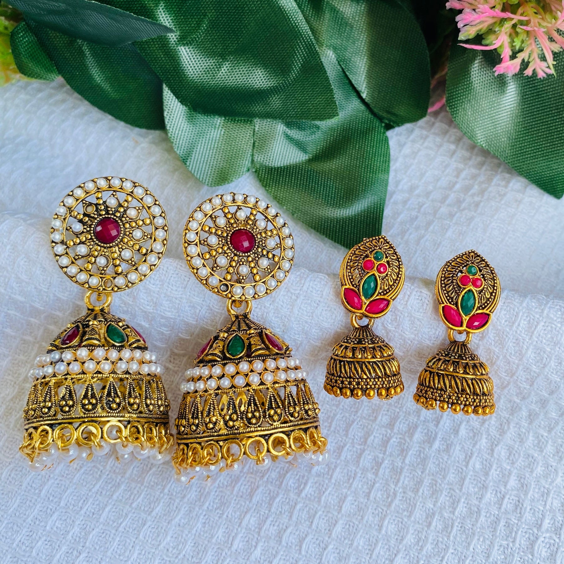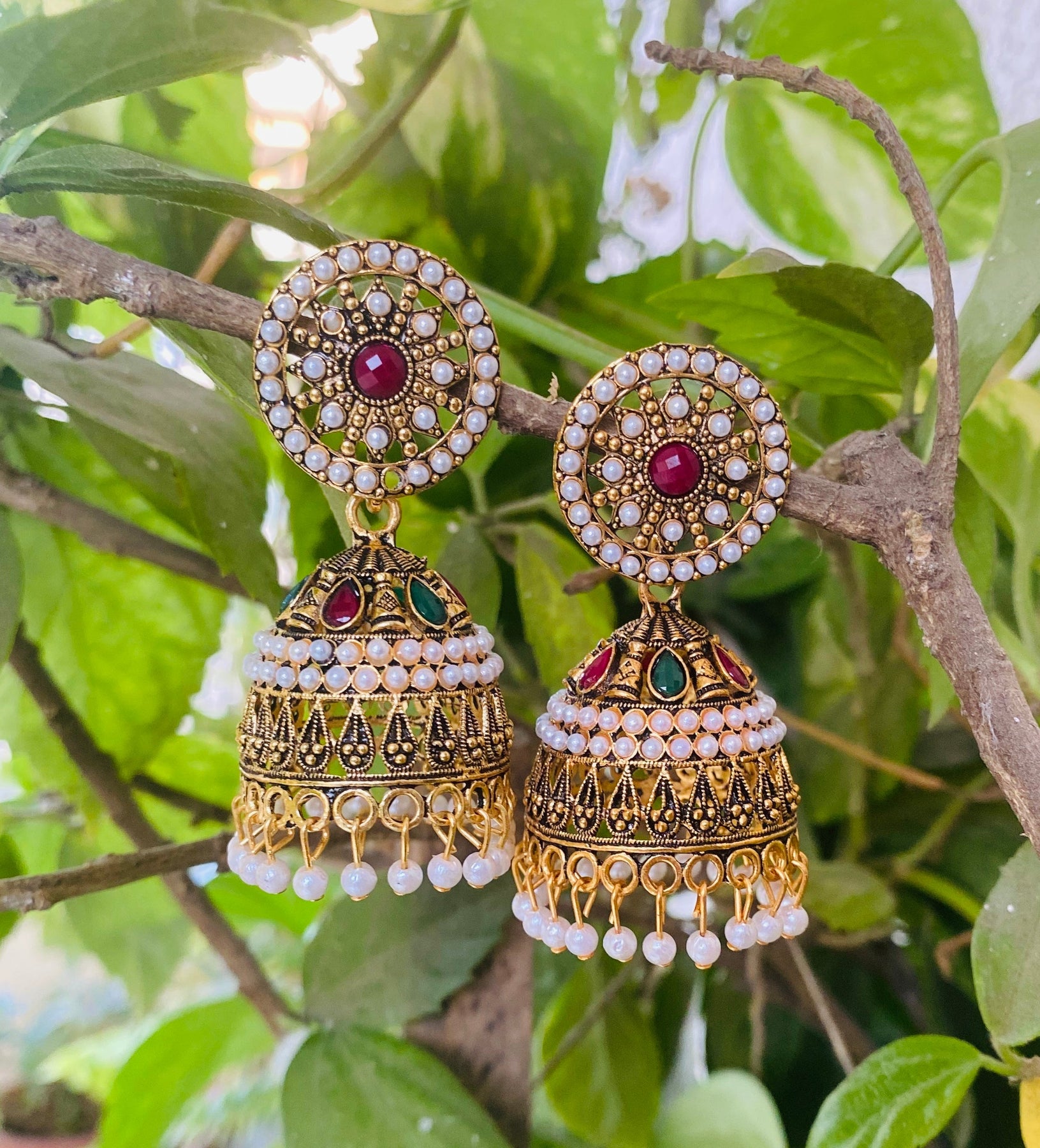 Elevate Your Ethnic Look With This Stunning Traditional Jhumka Earrings Set. Featuring Intricate Antique Gold Detailing, This Set Includes Earrings Adorned With Vibrant Pink And Green Stones, Along With Elegant Faux Pearls. Designed With A Timeless Charm, These Jhumkas Perfectly Blend Tradition And Sophistication, Making Them Ideal For Weddings, Festive Occasions, And Cultural Celebrations. Lightweight Yet Eye-Catching