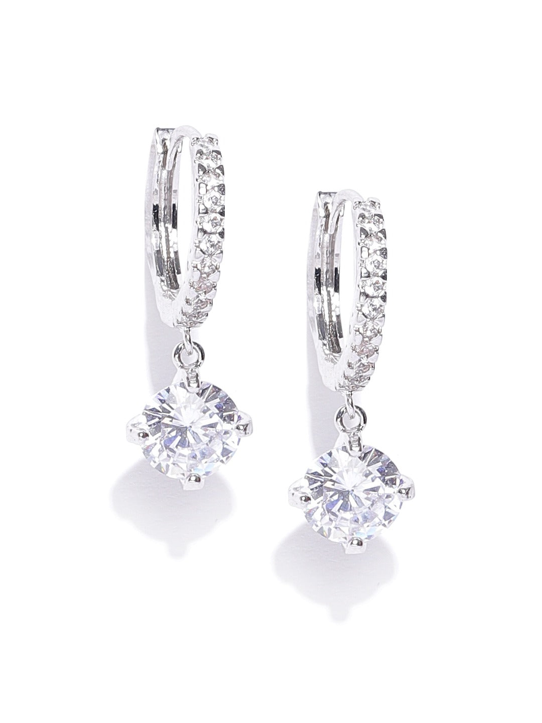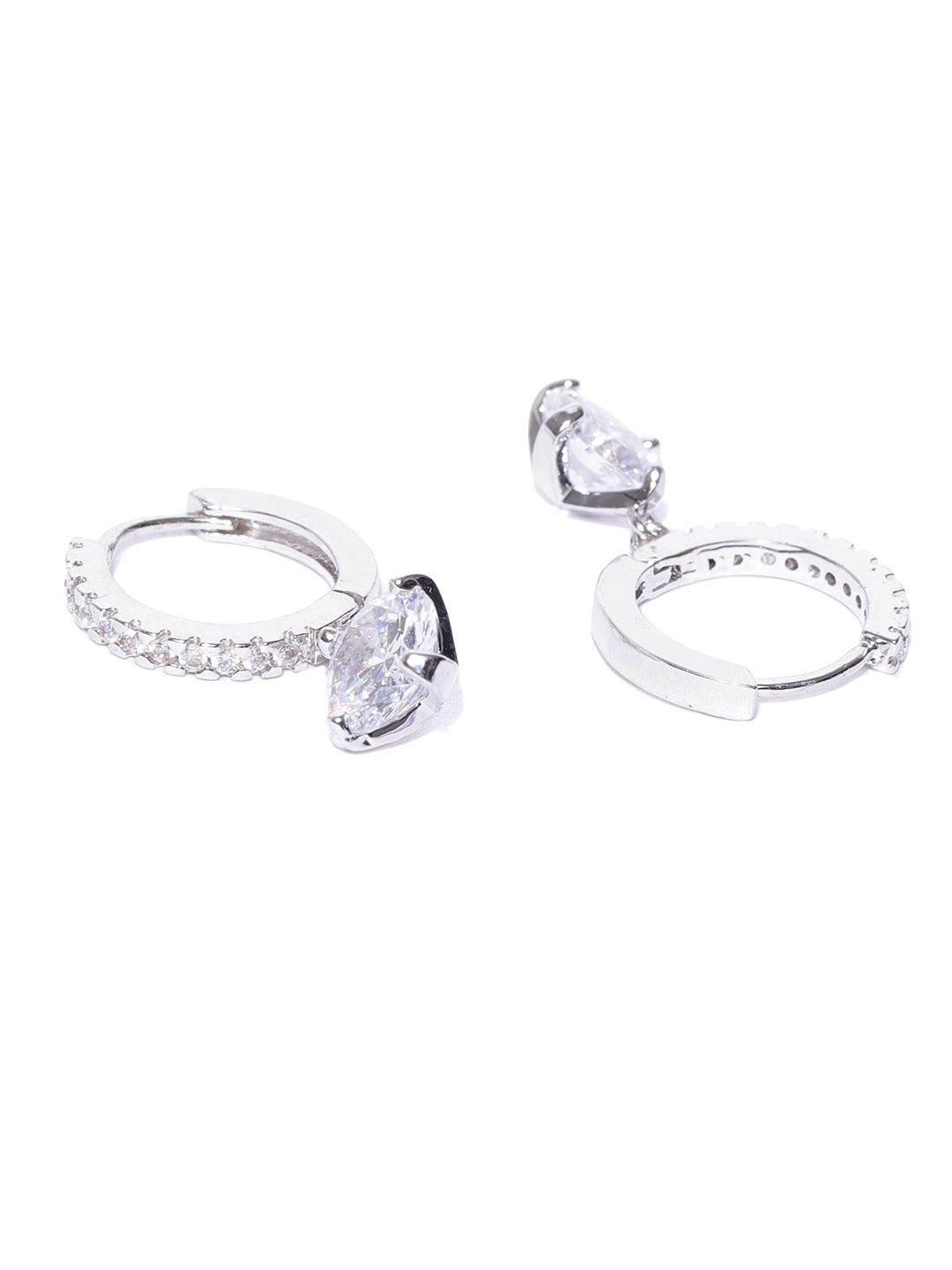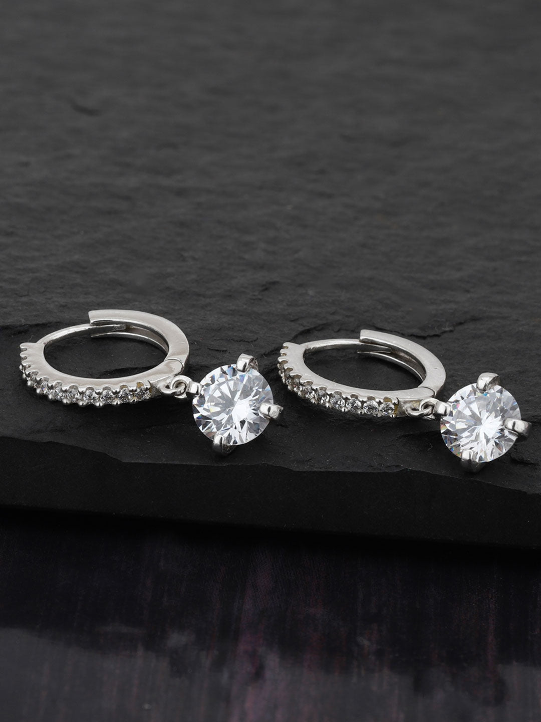 Carlton London Rhodium Plated Silver Toned Hoop Earrings With Dangling CZ Stone For Women