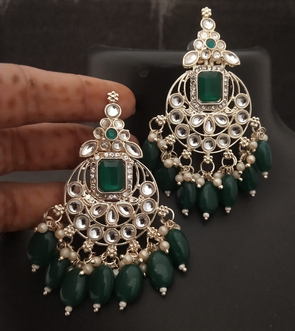 Green Monalisa Stones Kundan Pearls Chandbali Earrings Set