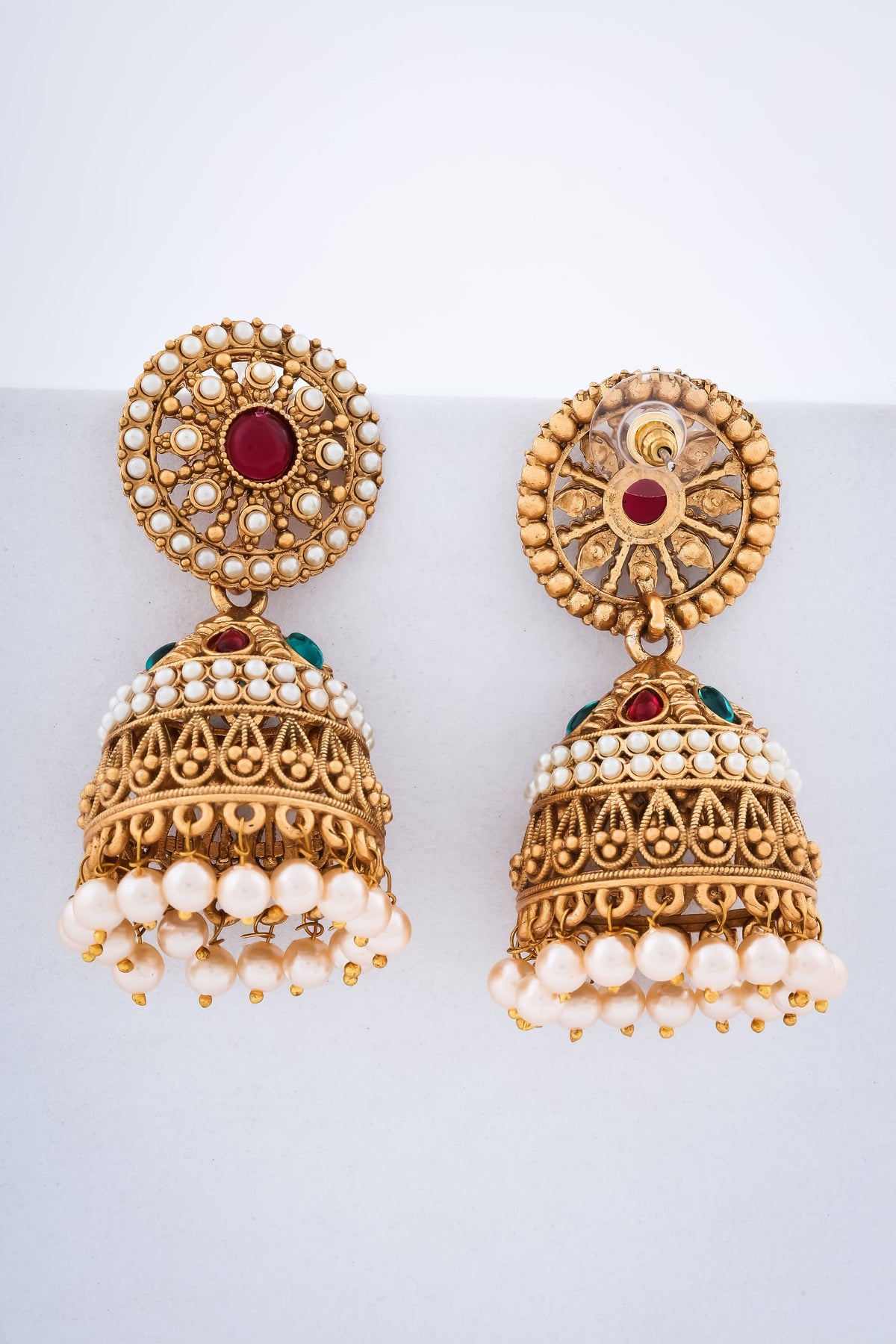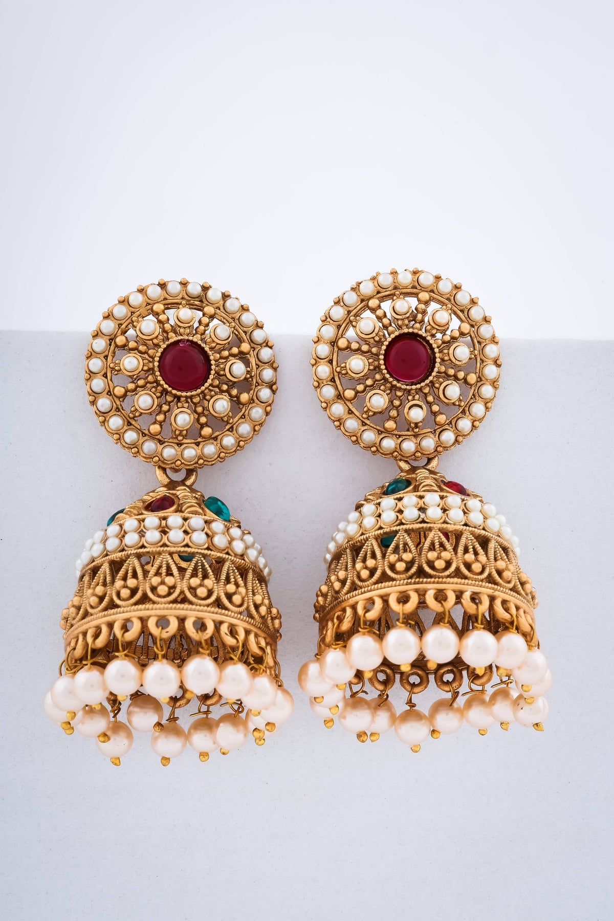 For A Perfect Ethnic Look With Class And Glam, Add Gold Jadau Jhumka Earrings - Maroon And Green Stones And Pearls - For Women And Girls Stylish Latest To Your Wadrobe.