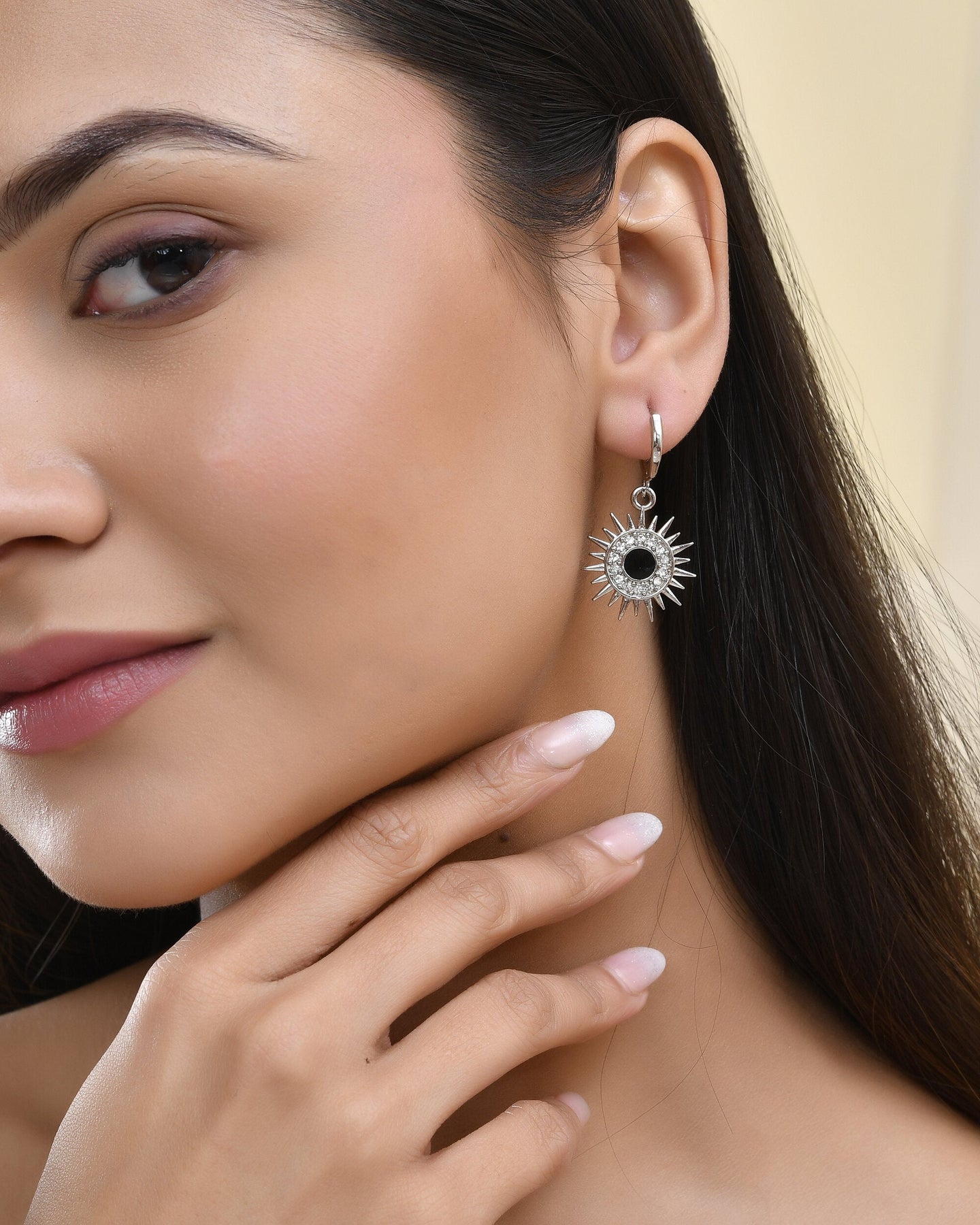 Shine Bright With These Stylish Stainless Steel Black Stone Sunburst Earrings. Designed With A Striking Sunburst Pattern, These Earrings Feature A Bold Black Stone At The Center, Surrounded By Shimmering Crystals For A Sparkling Effect. The High-Quality Stainless Steel Finish Adds A Modern Touch And Ensures Long-Lasting Shine And Durability. The Secure Lever-Back Closure Ensures Comfortable Wear Throughout The Day. Perfect For Adding A Trendy Statement To Both Casual And Formal Outfits.