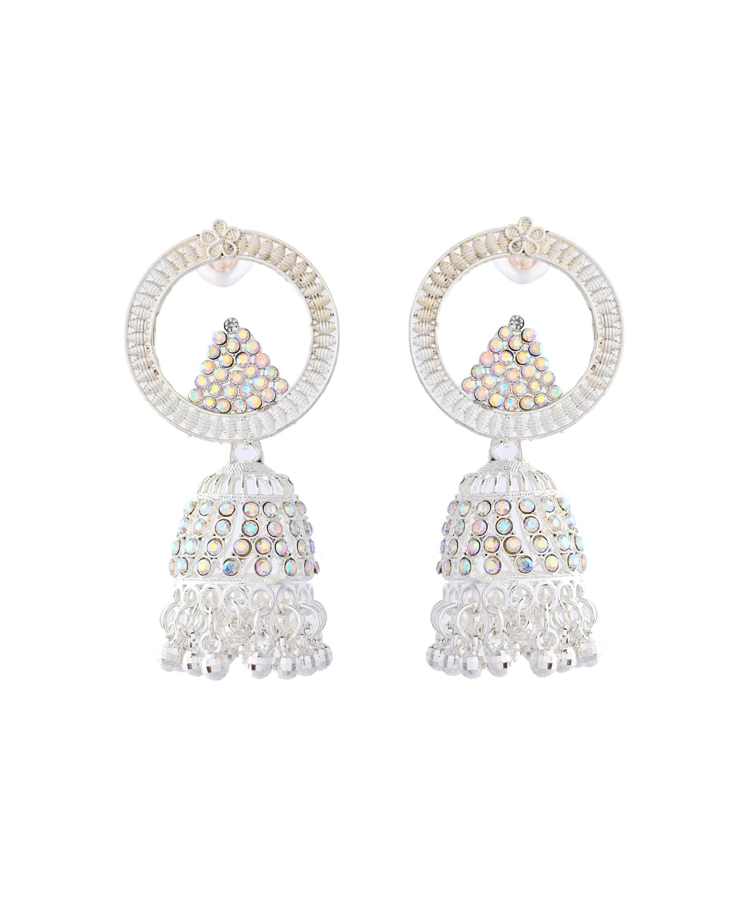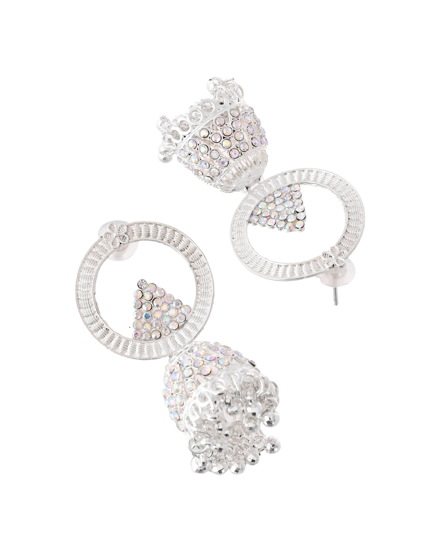 Shine Bright With These Elegant Silver And Crystal Jhumka Earrings Featuring A Dazzling Hoop Design. Crafted From High-Quality Silver-Tone Metal, These Earrings Are Adorned With Multicolored Crystals That Reflect Light Beautifully, Creating A Mesmerizing Sparkle. The Jhumka Base Is Designed With Intricate Detailing And Hanging Beads, Adding A Touch Of Tradition To The Modern Hoop Structure. Perfect For Both Ethnic And Fusion Wear, These Earrings Are Sure To Elevate Your Festive And Party Look.