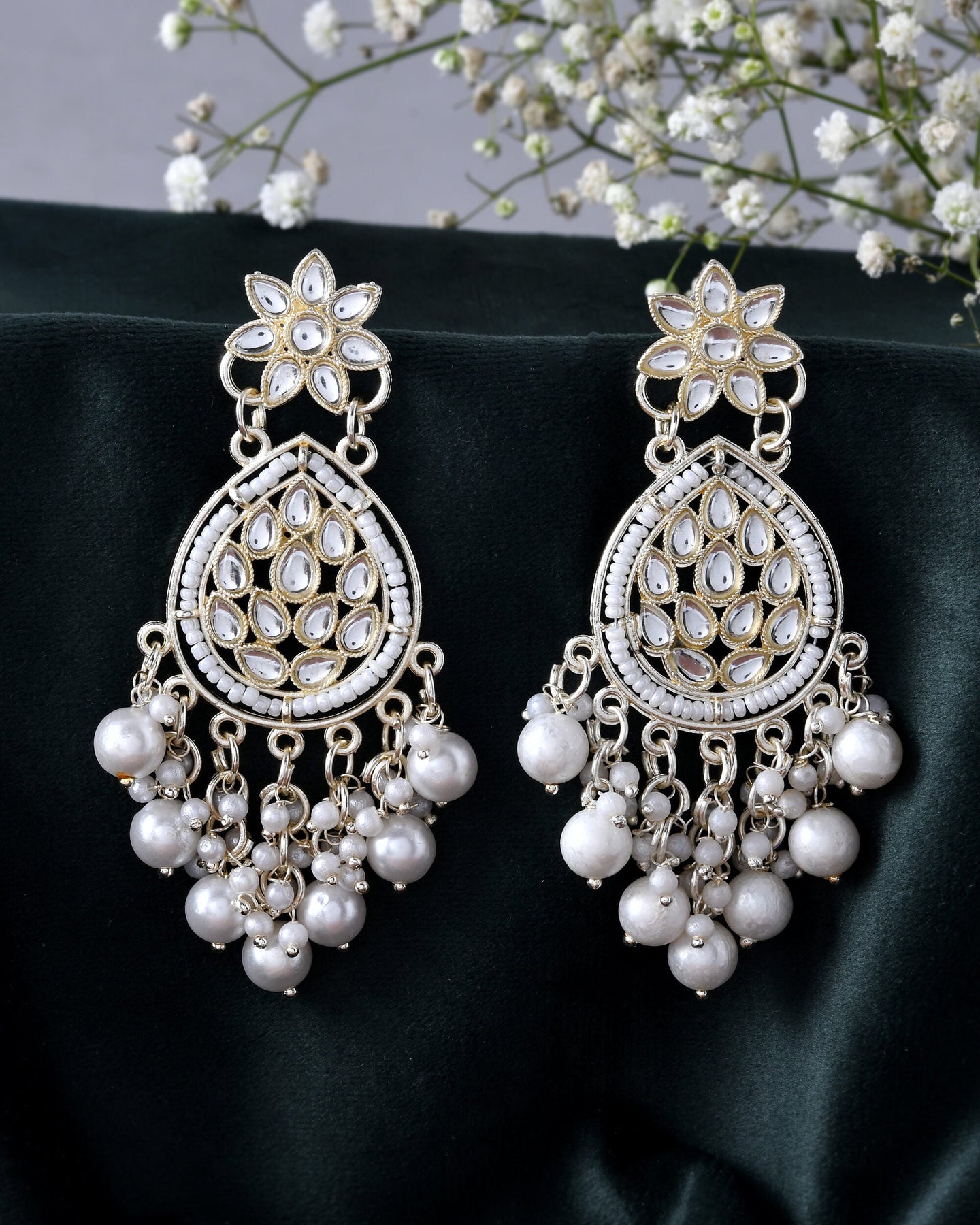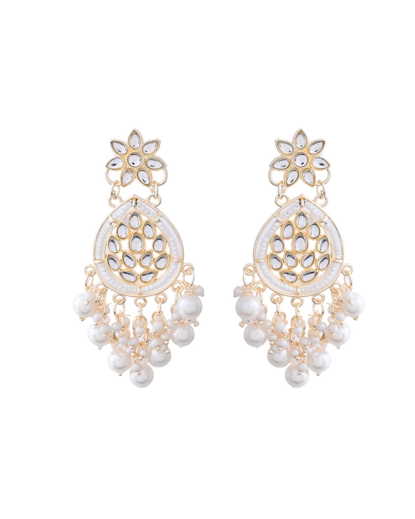Add A Royal Touch To Your Look With These Elegant Gold-Plated Kundan And Pearl Drop Earrings. Featuring A Floral Stud Design With A Teardrop-Shaped Kundan Frame, These Earrings Are Further Enhanced With White Pearl Hangings That Create A Graceful Movement. The Intricate Gold-Tone Finish Paired With Shimmering Kundan Stones Reflects A Luxurious Vibe, Perfect For Weddings, Festivals, And Parties. Lightweight Yet Impactful, These Earrings Are Designed To Provide Comfort While Making A Statement. Ideal For Pairing With Both Traditional And Modern Outfits.