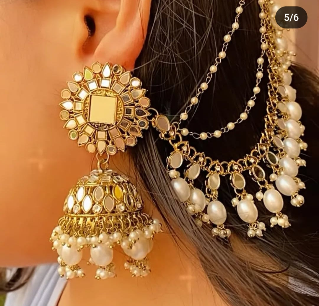 Antique Style Huge Jhumka Earrings With Kaan Chain And Tikka