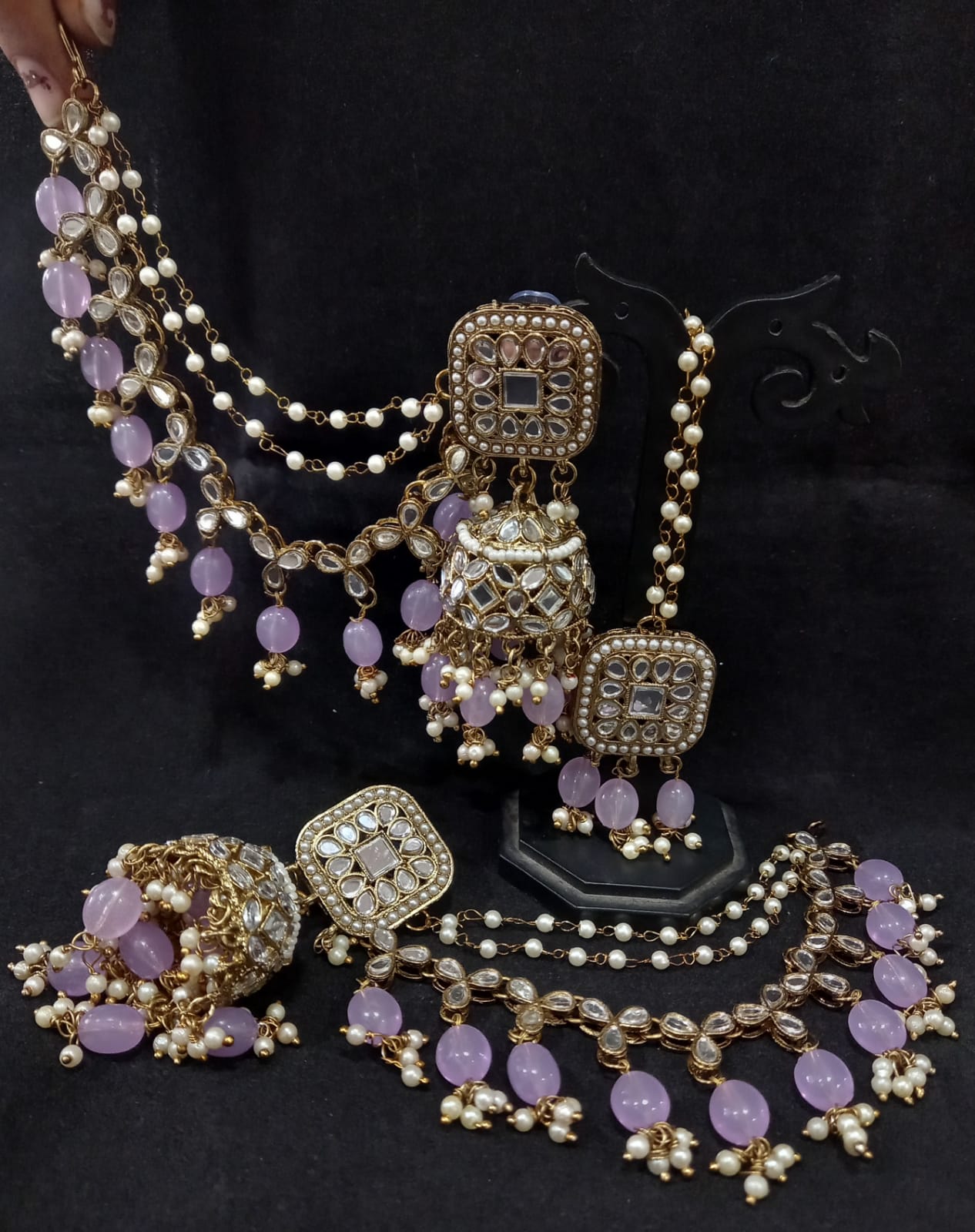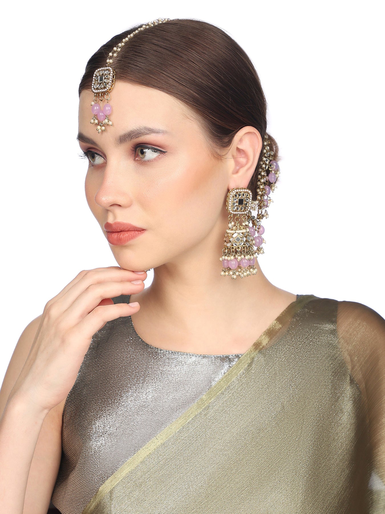 Lavender Pearls Mirror Mehendi Plated Jhumka Earrings Kaan Chain Tikka Set
